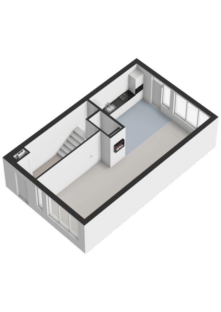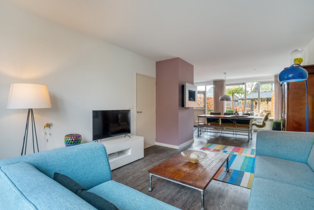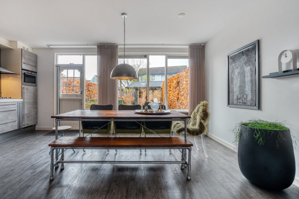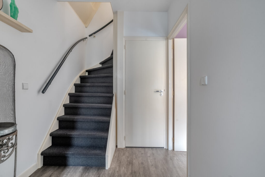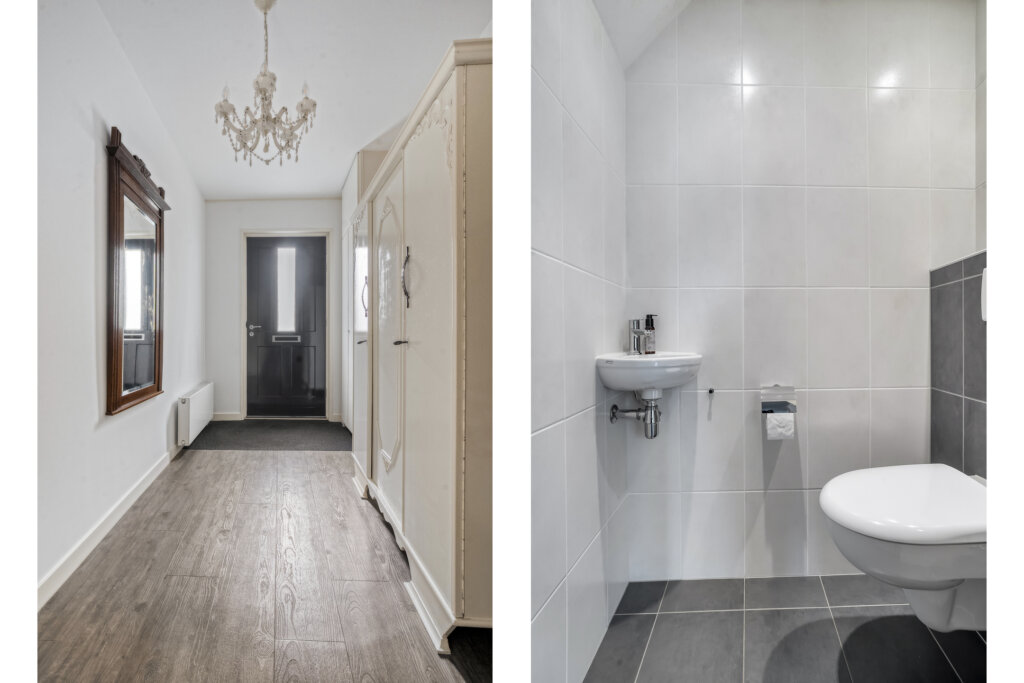 Je komt binnen in een brede, ruime hal met meterkast, trapopgang en een toiletruimte, voorzien van hangend toilet en wastafel. Vanuit hier stap je direct de woonkamer in, waar het vrije uitzicht aan de voorzijde je meteen verwelkomt. De grote ramen aan zowel de voor- als achterzijde laten veel daglicht binnen en geven de ruimte een open en ontspannen sfeer. Tussen de woonkamer en de keuken bevindt zich een sfeervolle elektrische haard, die direct warmte en gezelligheid brengt.