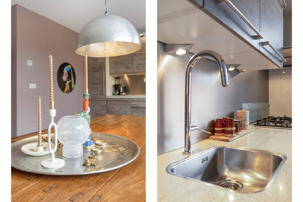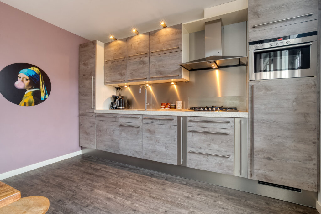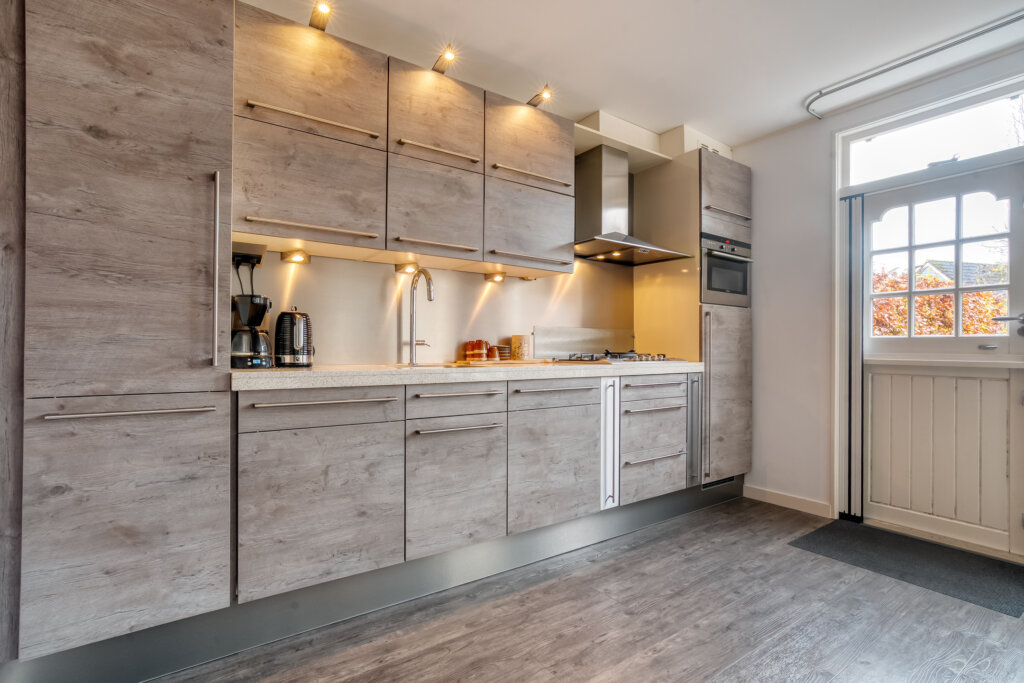 De begane grond is volledig afgewerkt met een pvc-vloer, wat zorgt voor een rustige uitstraling én praktisch wooncomfort. De open keuken ligt aan de achterzijde en staat in verbinding met de eethoek, waardoor de begane grond één geheel vormt. De keuken is uitgerust met een koelkast, vriezer, combimagnetron, gaskookplaat, afzuigkap en vaatwasser.