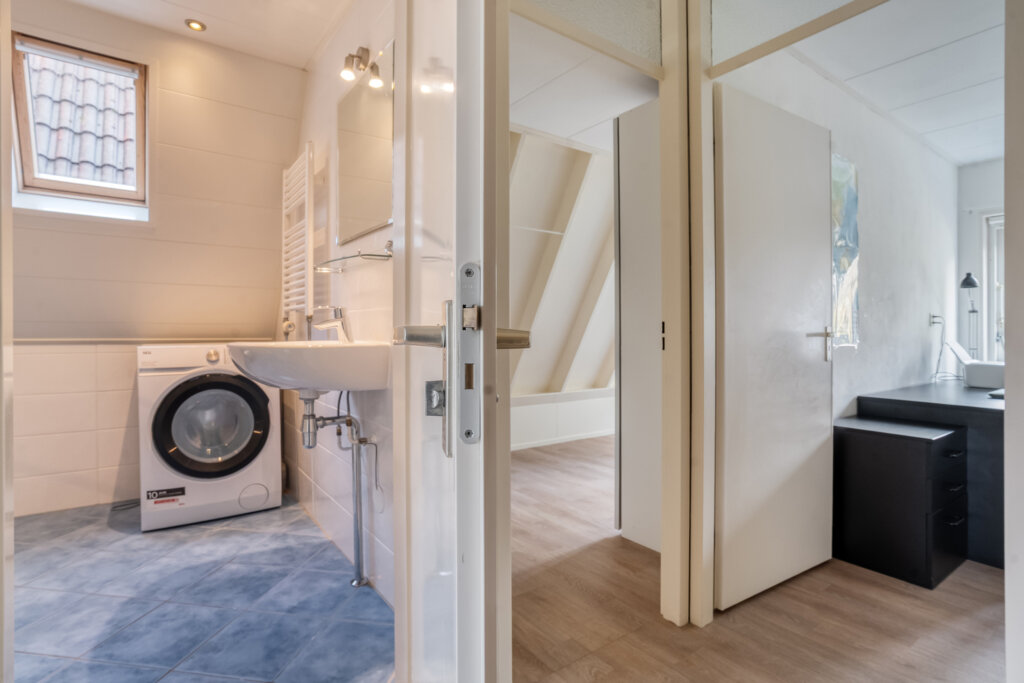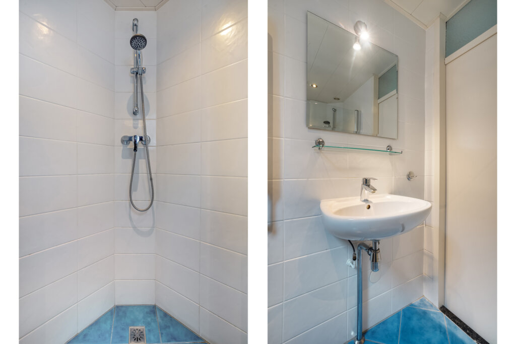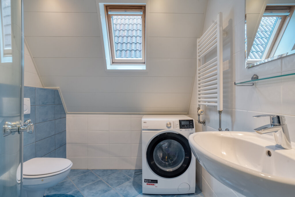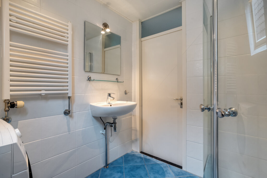 De badkamer is verzorgd en praktisch ingedeeld, met een dakraam dat zorgt voor veel daglicht en natuurlijke ventilatie. Je vindt hier een douchehoek, een tweede hangend toilet, een wastafel, designradiator en de wasmachineaansluiting.