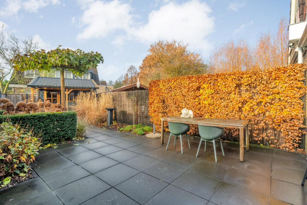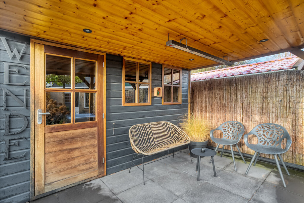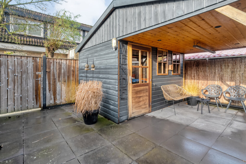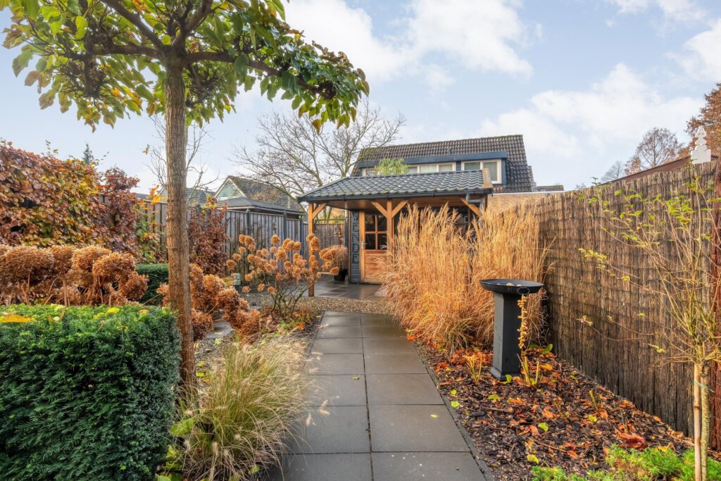 Via de achterdeur bereik je de sfeervol aangelegde tuin, compleet met sierbestrating, groenborders en een fijn tuinhuis met veranda en voldoende bergruimte. De achterom maakt de tuin extra praktisch.