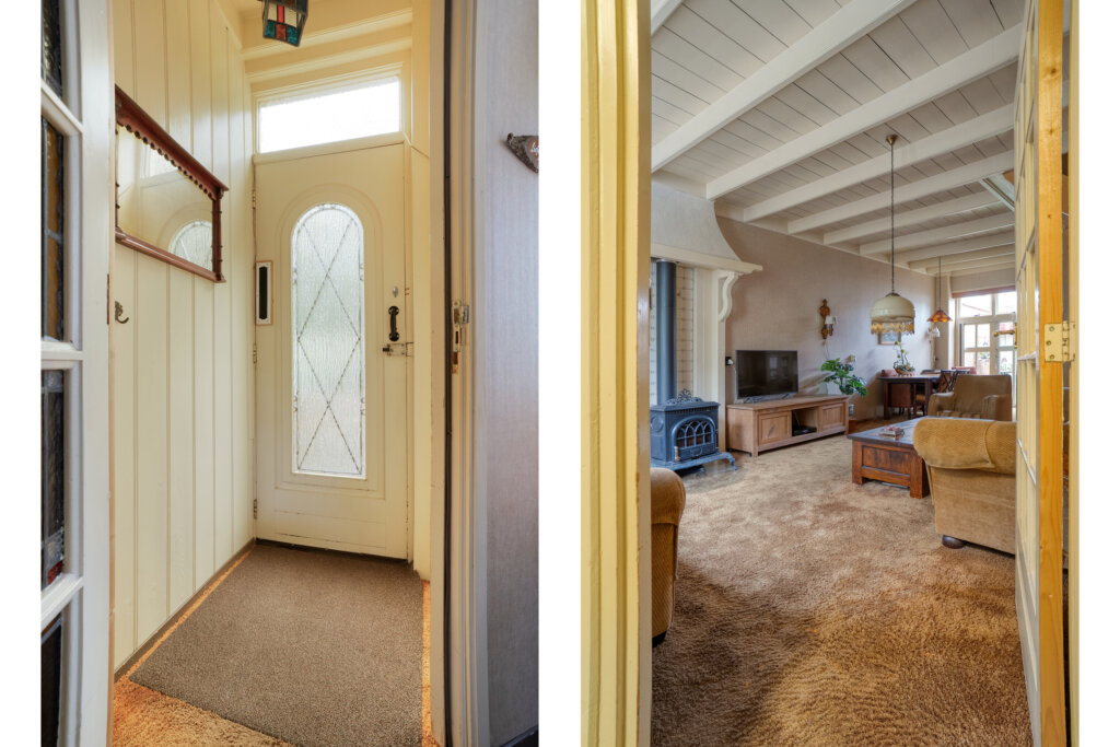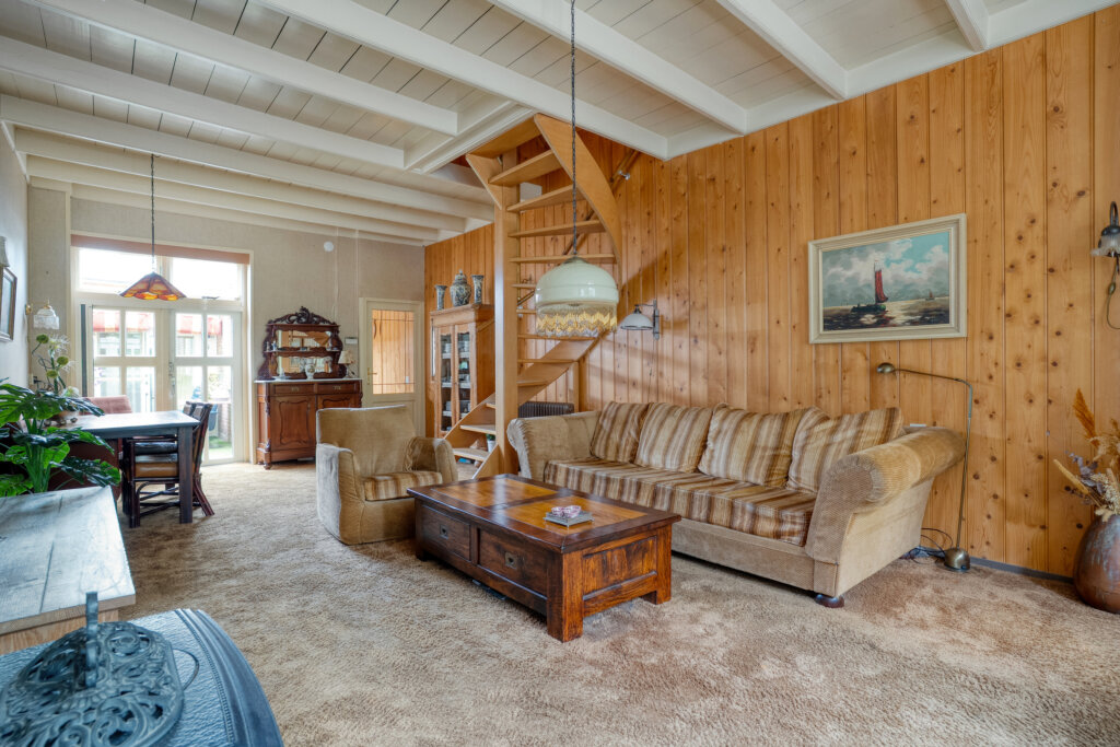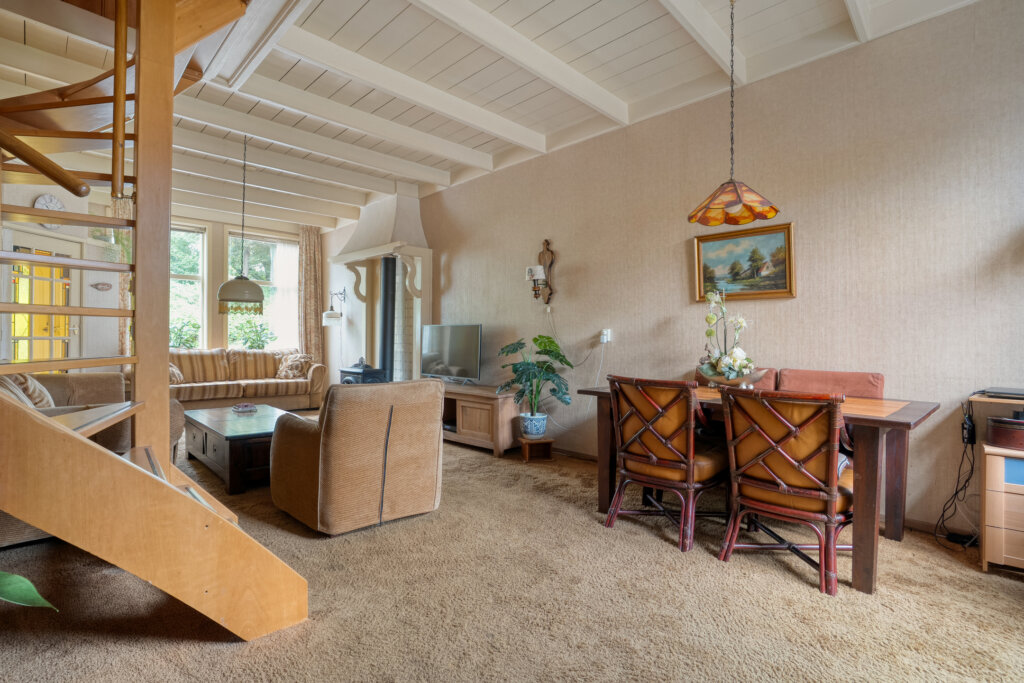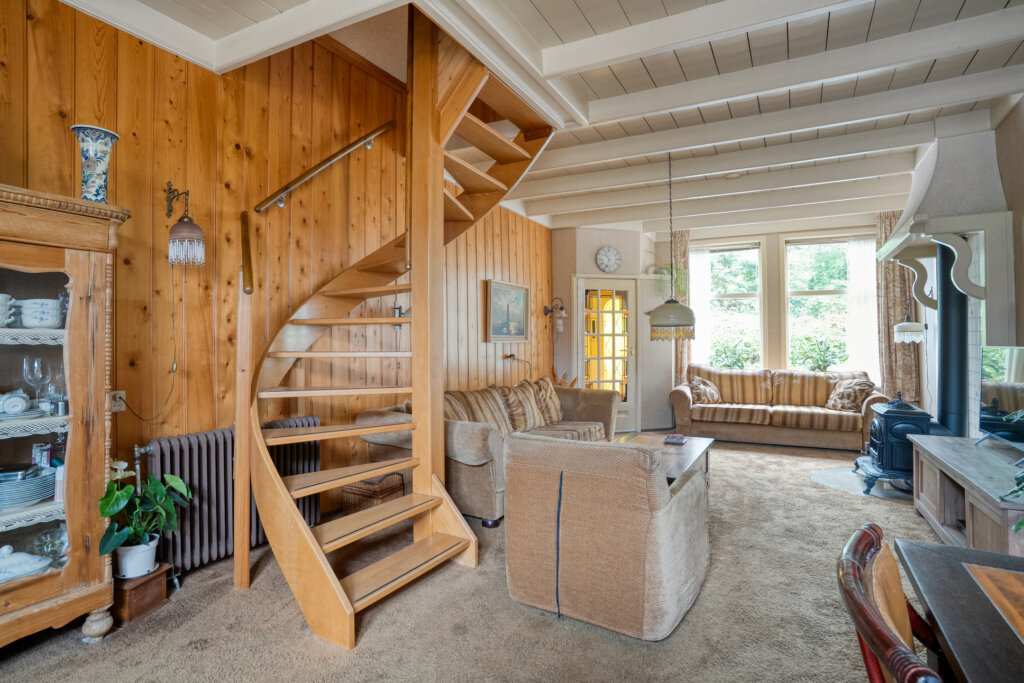 Via de entree met een authentieke glas-in-looddeur stap je direct de sfeervolle woonkamer binnen. Hier zie je de zichtbare plafondbalken, een houtkachel en de natuurlijke lichtinval zorgen voor een gezellige en authentieke sfeer. De woonkamer is langgerekt en biedt voldoende ruimte voor zowel een zit- als eetgedeelte. De wenteltrap naar de eerste verdieping is op speelse wijze in de woonkamer geplaatst. De woonkamer is bovendien voorzien van vloerverwarming, wat extra comfort biedt.