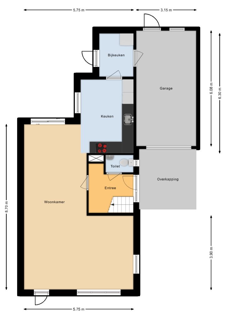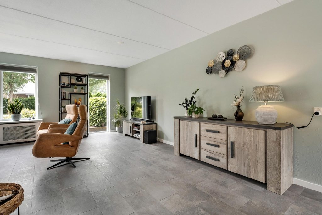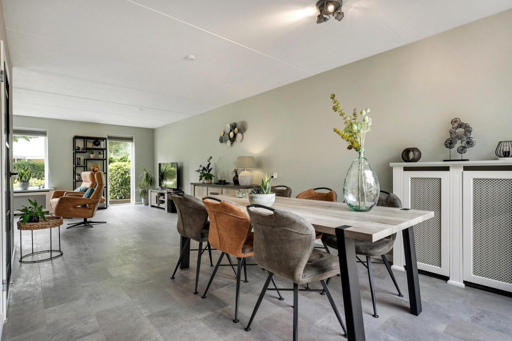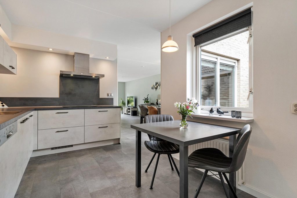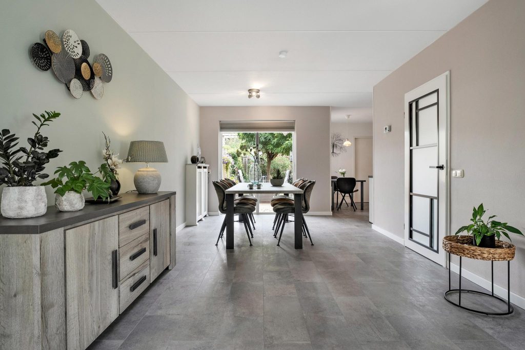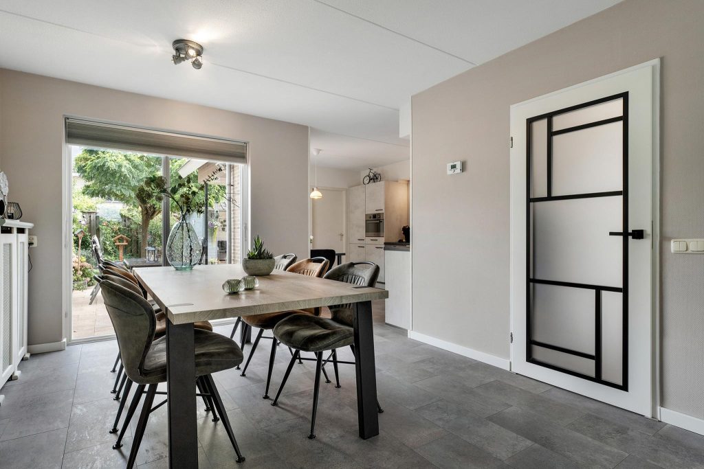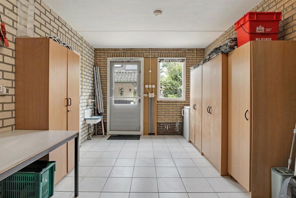 Bij binnenkomst kom je terecht in een ruime hal die toegang biedt tot het toilet, de lichte woonkamer, en de trapopgang naar de eerste verdieping. De woonkamer is een echte blikvanger, met grote ramen die veel natuurlijk licht naar binnen laten. De ruimte voelt hierdoor nog groter aan en heeft een sfeervolle uitstraling, ideaal voor zowel ontspannen avonden als gezellige momenten met vrienden en familie. Aangrenzend bevindt zich de eetkamer, die in verbinding staat met de moderne en lichte keuken. De keuken is voorzien van alle benodigde inbouwapparatuur, zodat je direct aan de slag kan met het bereiden van heerlijke maaltijden. Via de keuken kom je in de praktische bijkeuken, die toegang geeft tot zowel de tuin als de ruime garage. Je kunt ook via de garage de tuin bereiken, wat extra gemak biedt. De tuin is overzichtelijk ingedeeld met groen en tegels en beschikt over een overkapping, perfect om buiten te zitten.