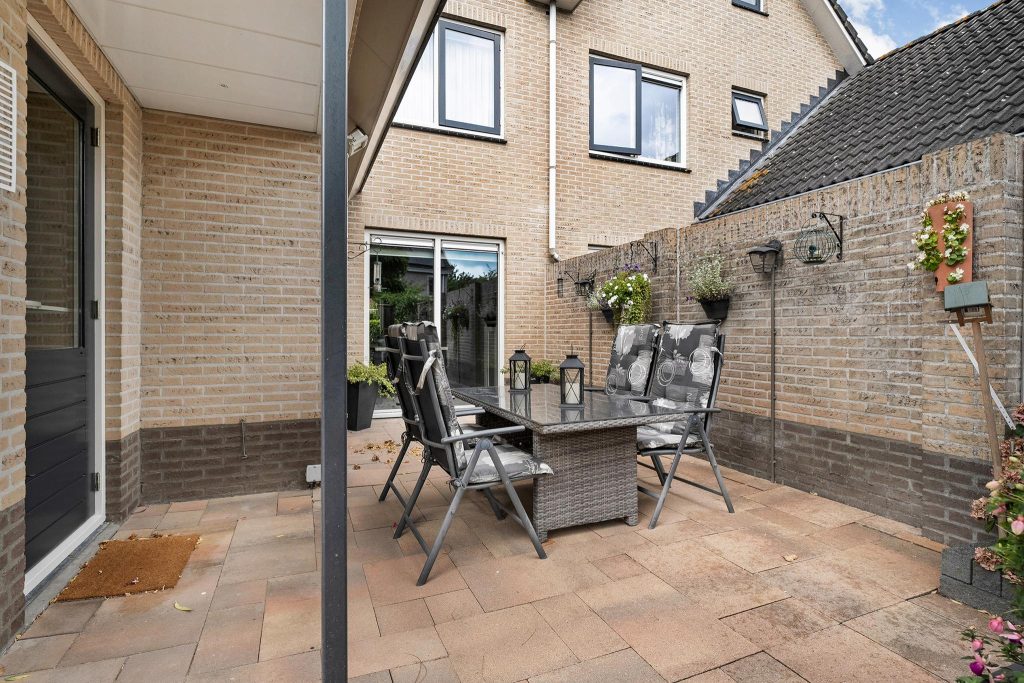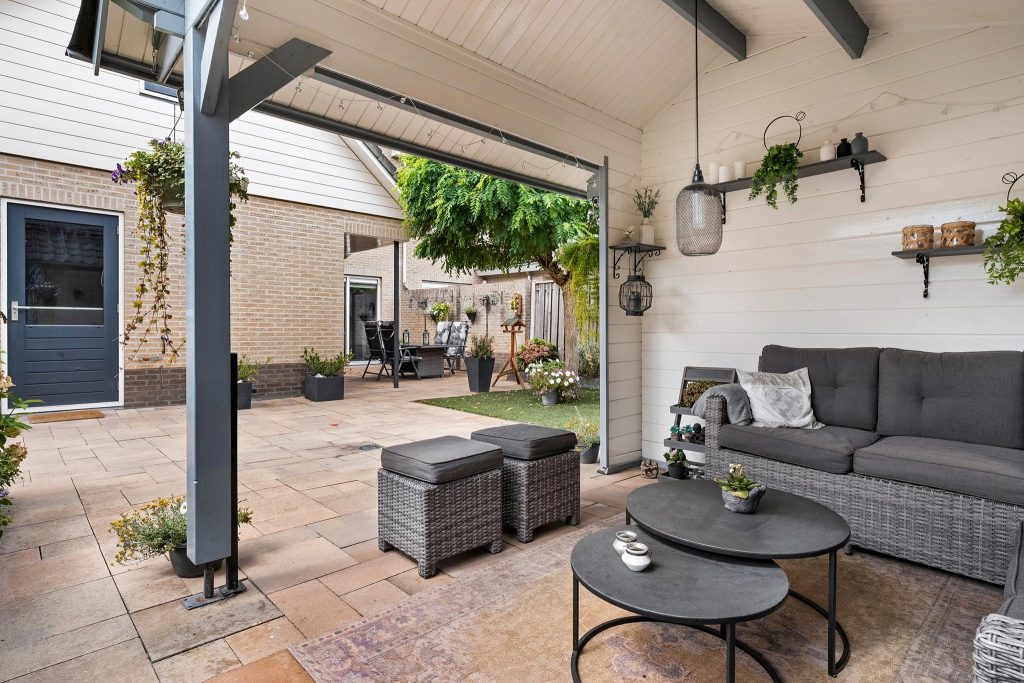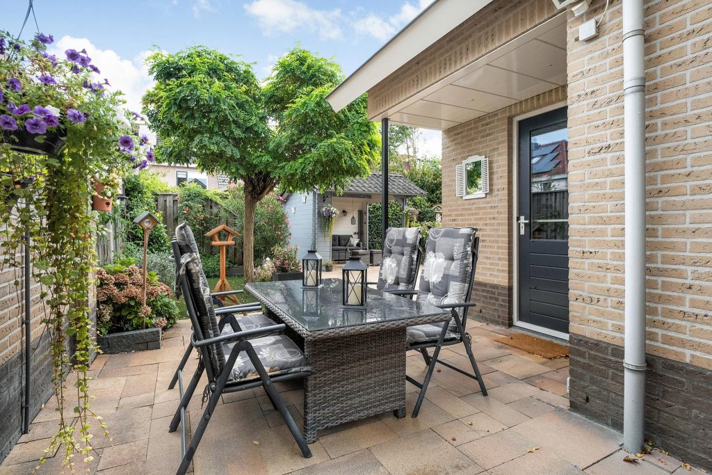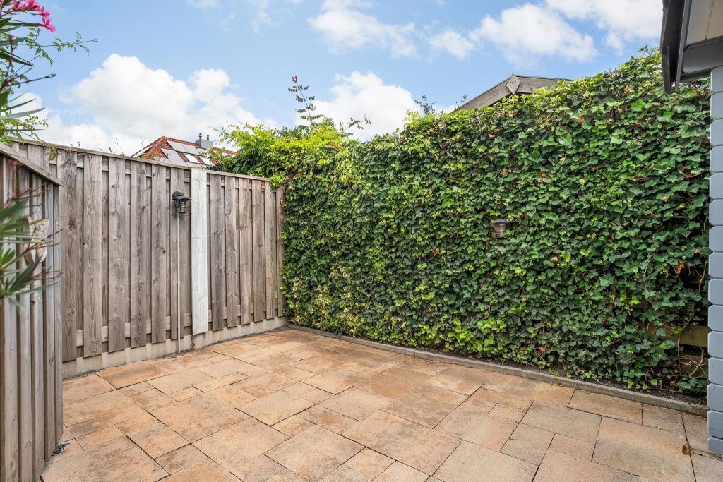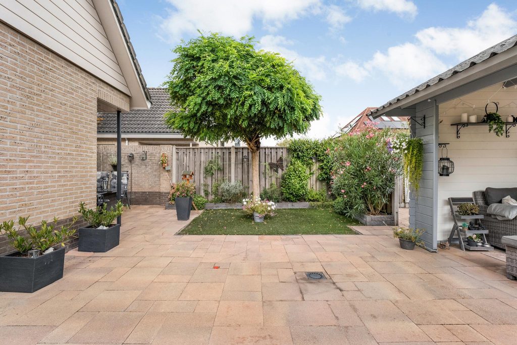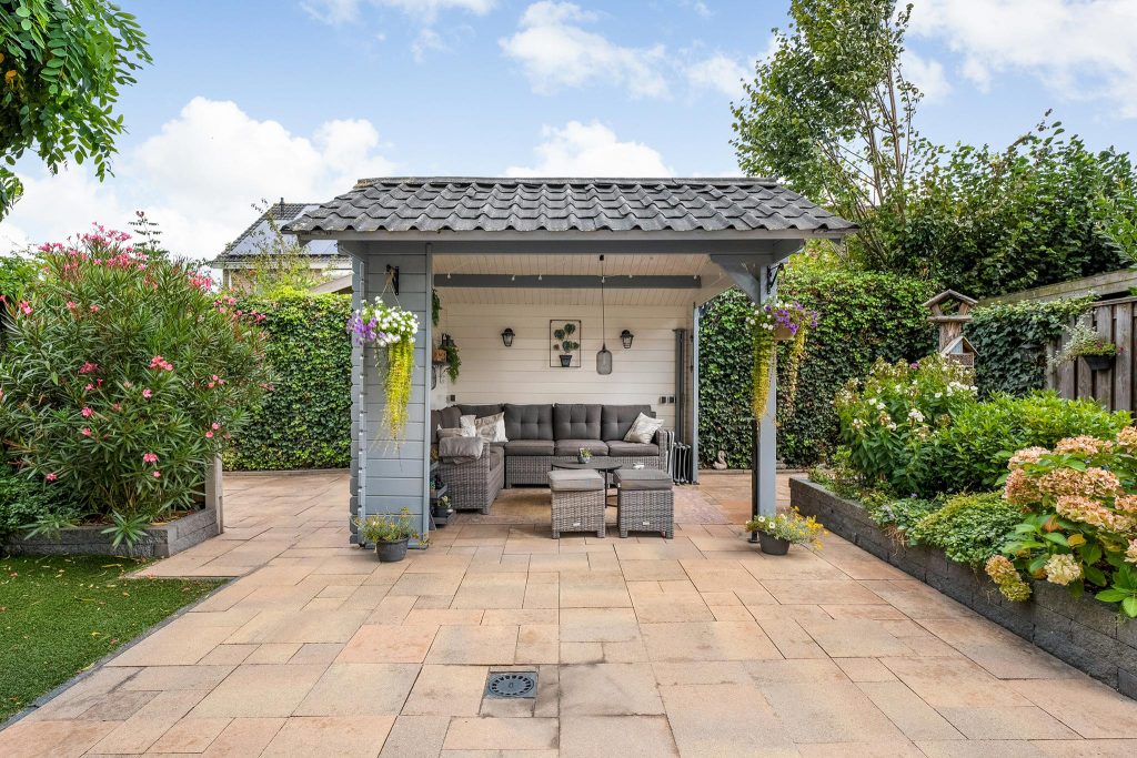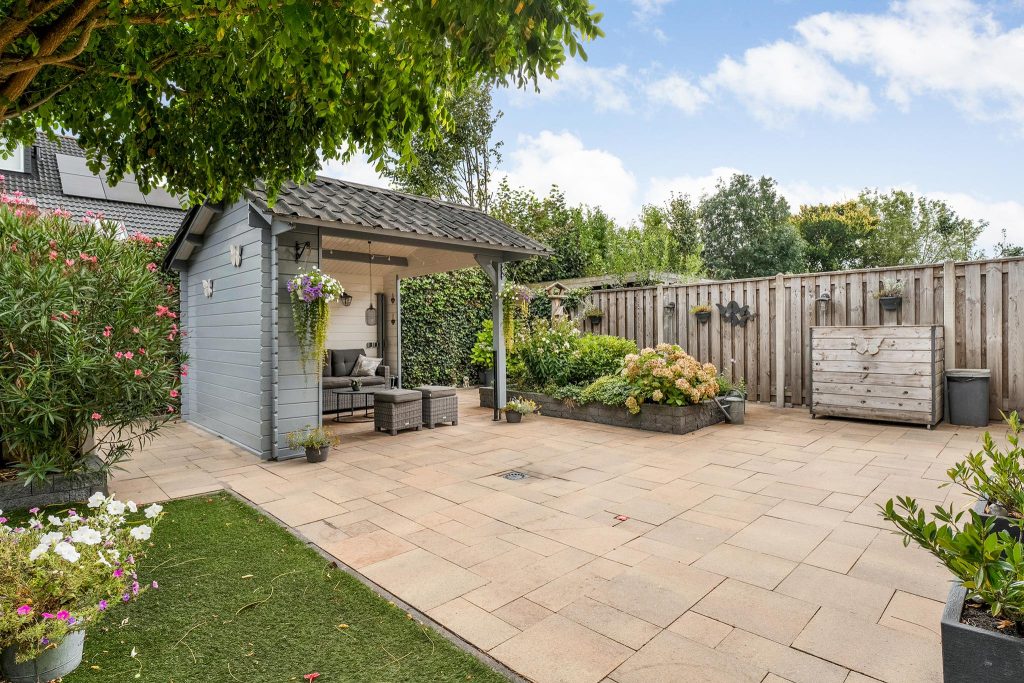 De tuin is ruim, goed onderhouden en biedt een harmonieuze mix van groen en betegeling. In het midden van de tuin staat een sfeervolle overkapping, perfect om in de zomer heerlijk te zitten en te genieten van de buitenlucht. Deze veelzijdige tuin is ideaal voor zowel ontspanning als gezellige dagen met familie of vrienden.