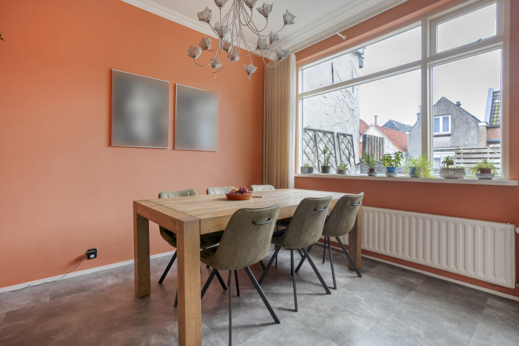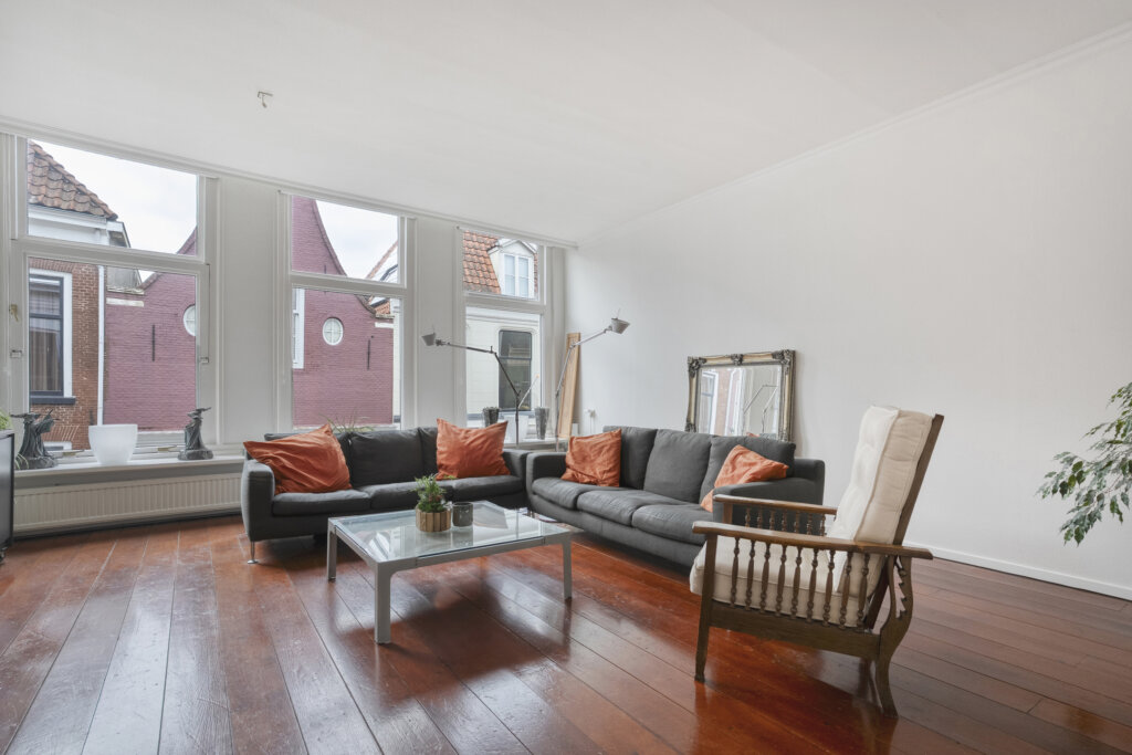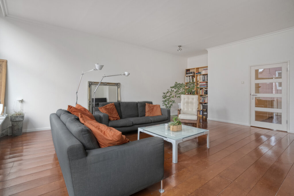 De ruime woonkamer bevindt zich aan de voorzijde van de woning. Met de hoge plafonds en ramen geeft de woonkamer je een heerlijk ruimtelijk gevoel.