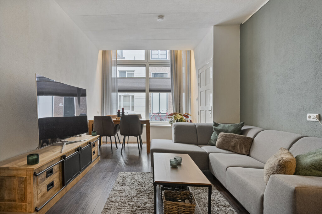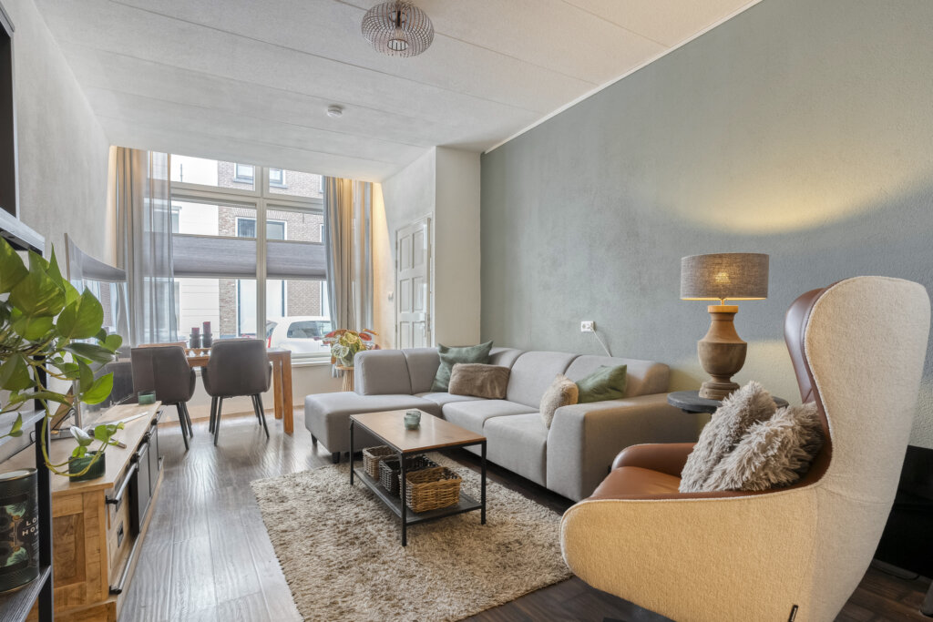 De woonkamer ligt aan de straatzijde. Er is ruimte voor een zithoek en een eettafel. De hoge ramen en het karakter van het pand uit circa 1900 geven een ruimtelijk gevoel.