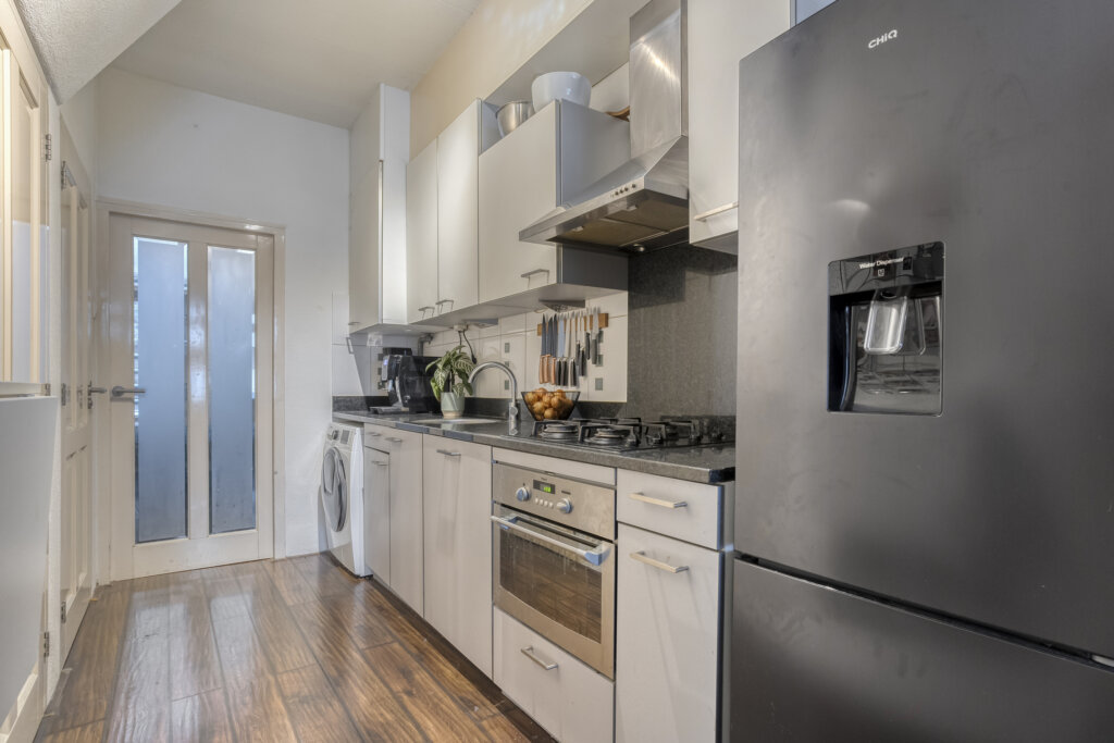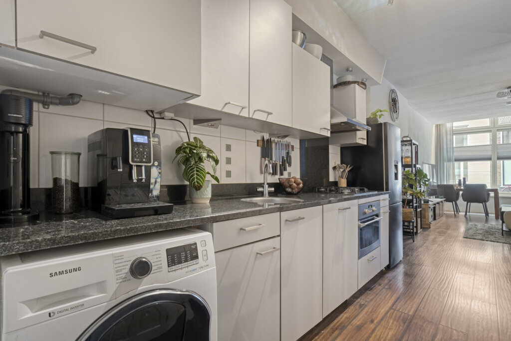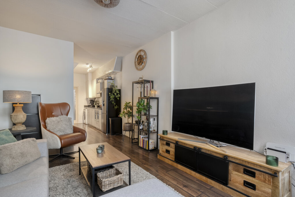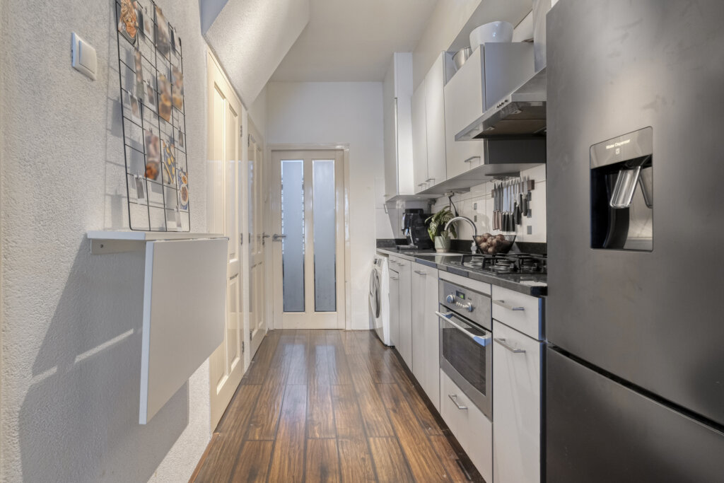 Aansluitend aan de woonkamer bevindt zich de keuken. Deze ruimte is praktisch ingedeeld, met plaats voor de benodigde apparatuur en kastruimte. Hier bevindt zich ook de aansluiting voor een wasmachine.