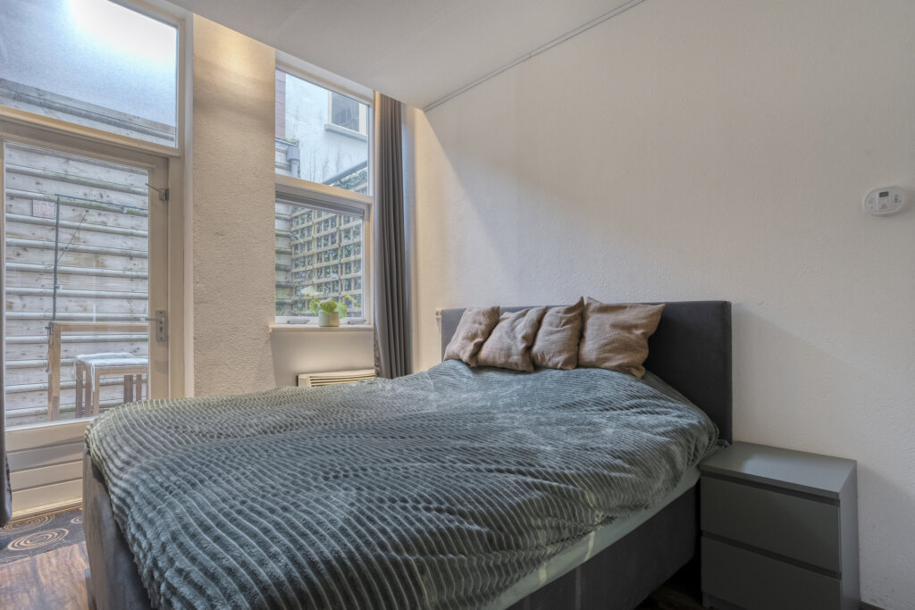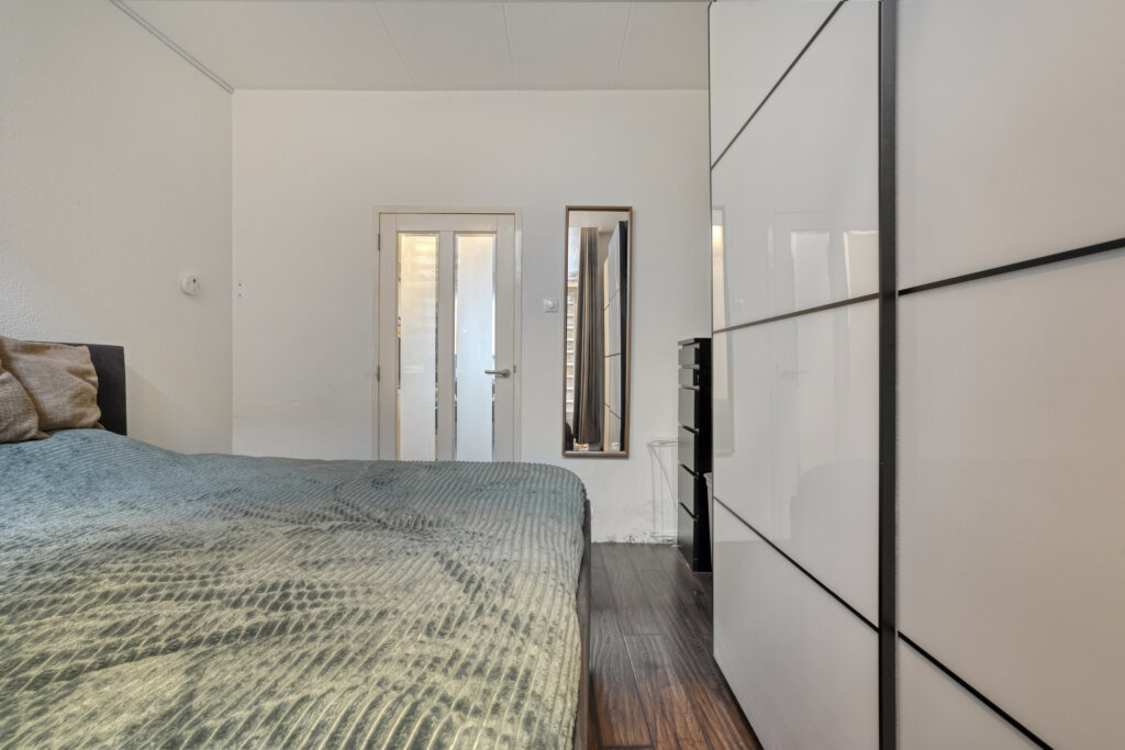 De slaapkamer ligt aan de achterzijde van de woning en heeft voldoende ruimte voor een (tweepersoons)bed en kastruimte.