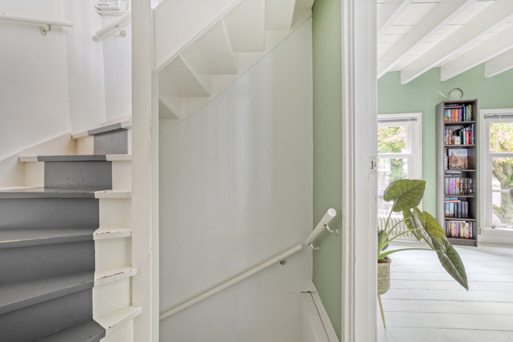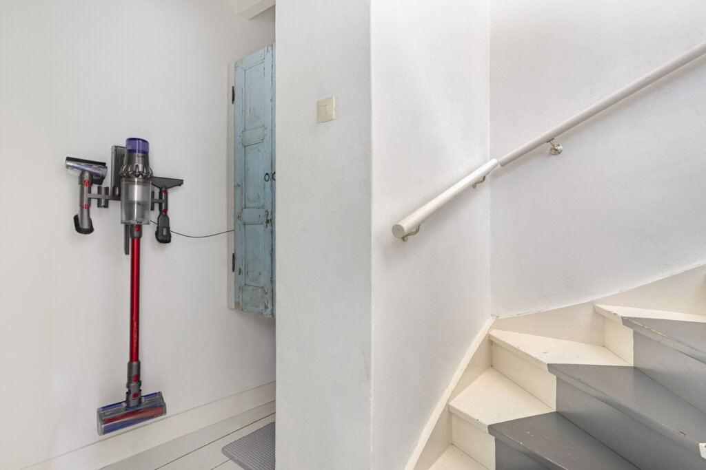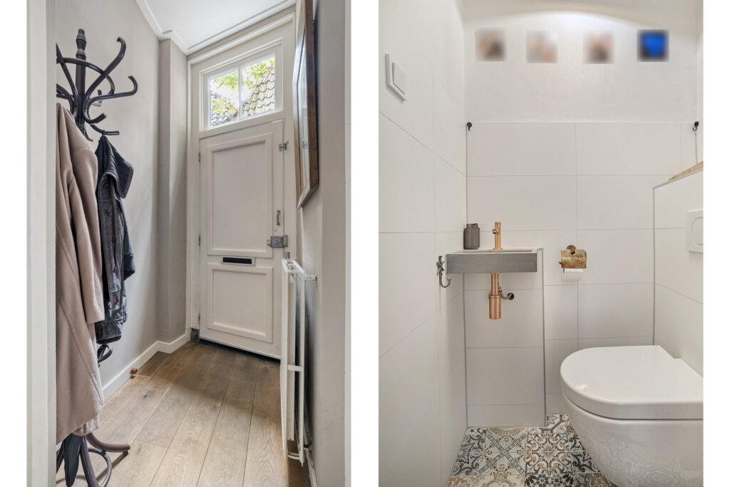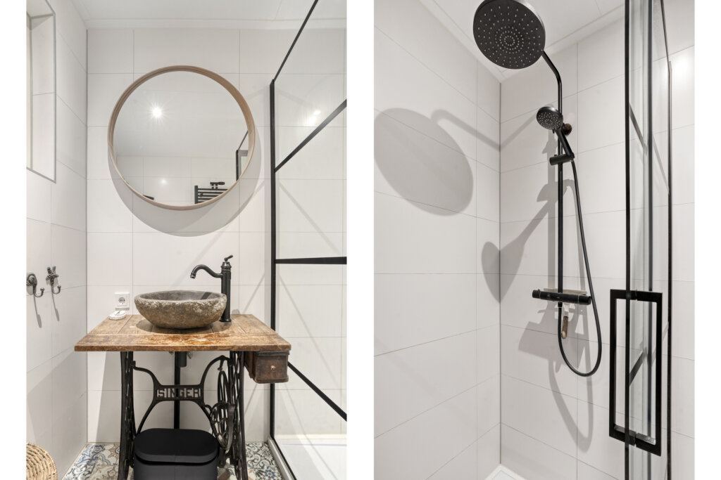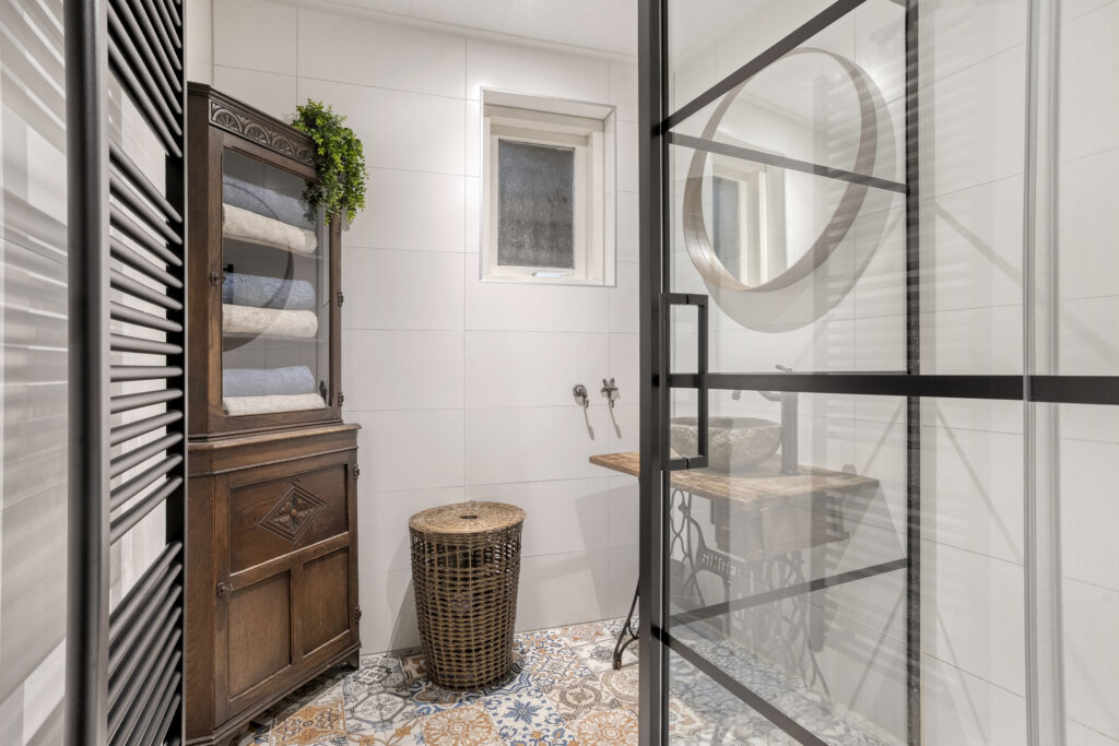 Aan het einde van de gang bevinden zich het separate toilet en de badkamer. De badkamer is voorzien van een wastafel en een ruime inloopdouche. De sfeervolle afwerking past helemaal bij het karakter van de woning.