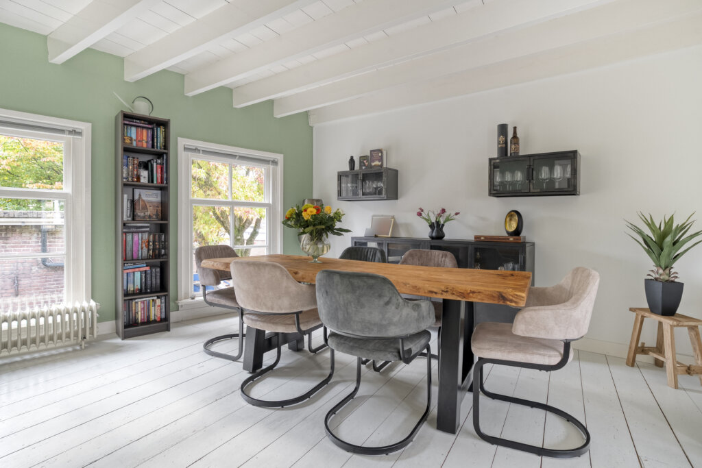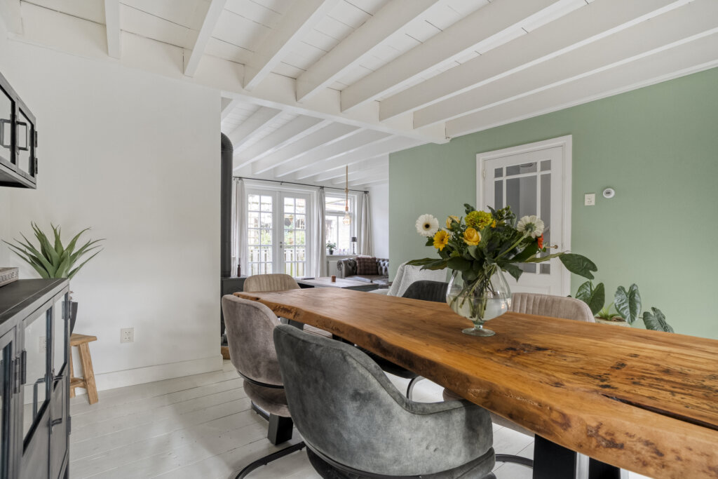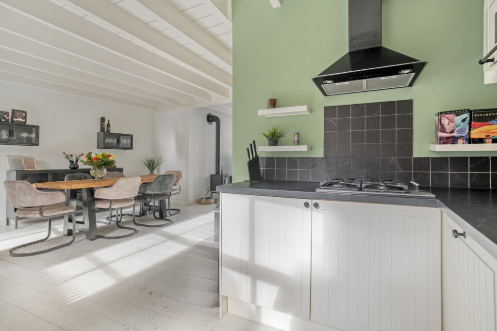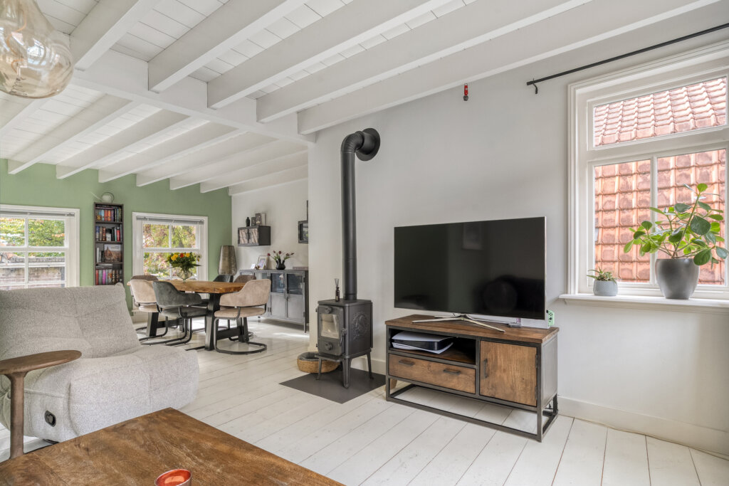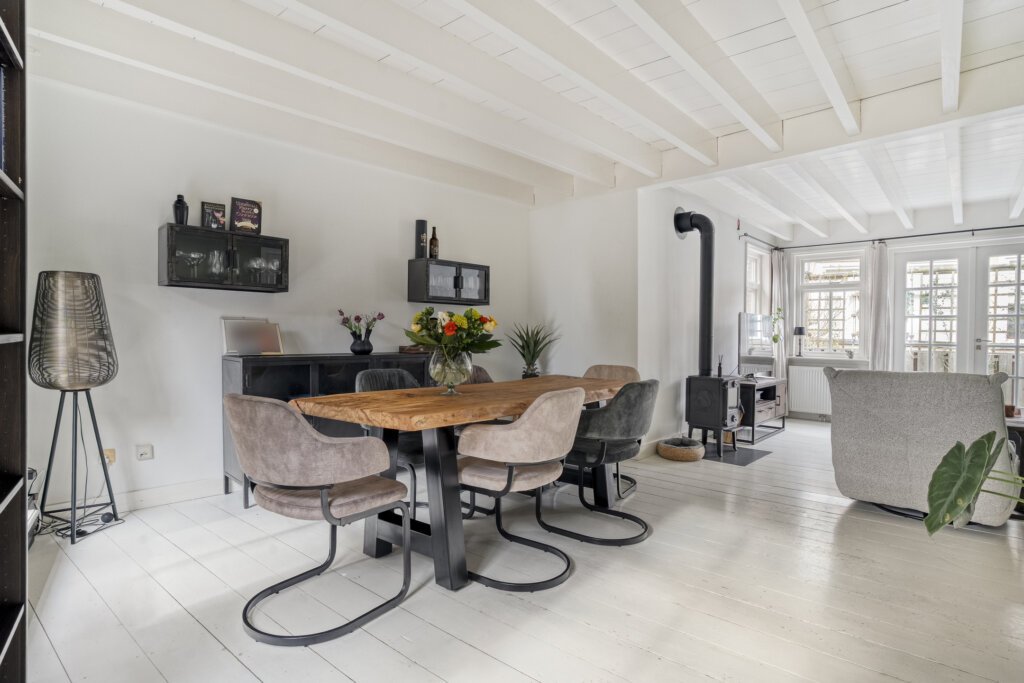 Via de trap kom je op de eerste verdieping. Hier bevindt zich de open keuken, die van alle gemakken is voorzien inclusief een ingebouwd wijnrek. De grote ramen zorgen voor veel natuurlijk licht en een prettige sfeer. De woonkamer bevindt zich aan de achterzijde van de woning en is voorzien van een gezellige houtkachel. Via de openslaande deuren kom je op het dakterras, wat zorgt dat binnen en buiten mooi in elkaar overlopen.