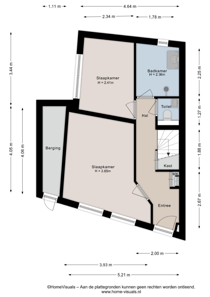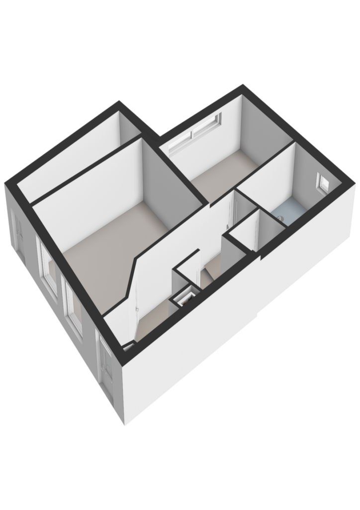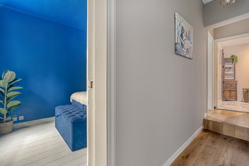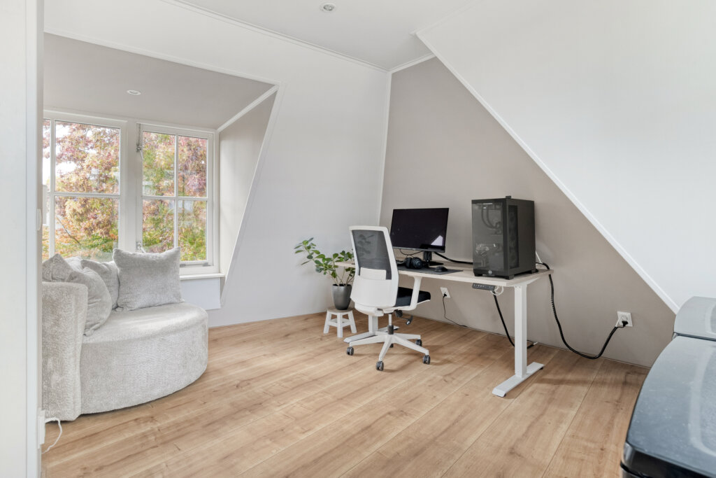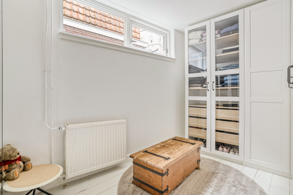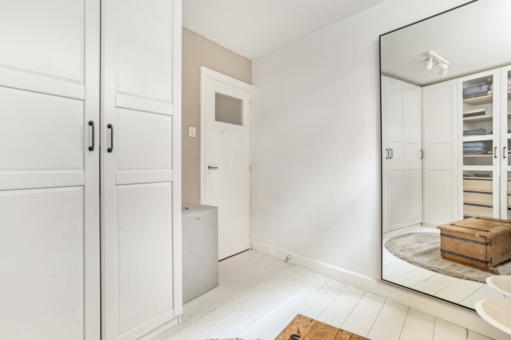 Bij binnenkomst word je verwelkomd in de hal, waar zich de meterkast en een ruime trapkast bevinden, handig voor jassen, schoenen en extra opbergruimte. Vanuit de gang zijn aan de linkerkant twee slaapkamers te vinden. De eerste slaapkamer, aan de voorzijde van de woning, is verrassend ruim en licht. Aan de achterzijde ligt de tweede slaapkamer, die nu in gebruik is als kledingkamer, maar uiteraard ook als werk of logeerkamer kan dienen.