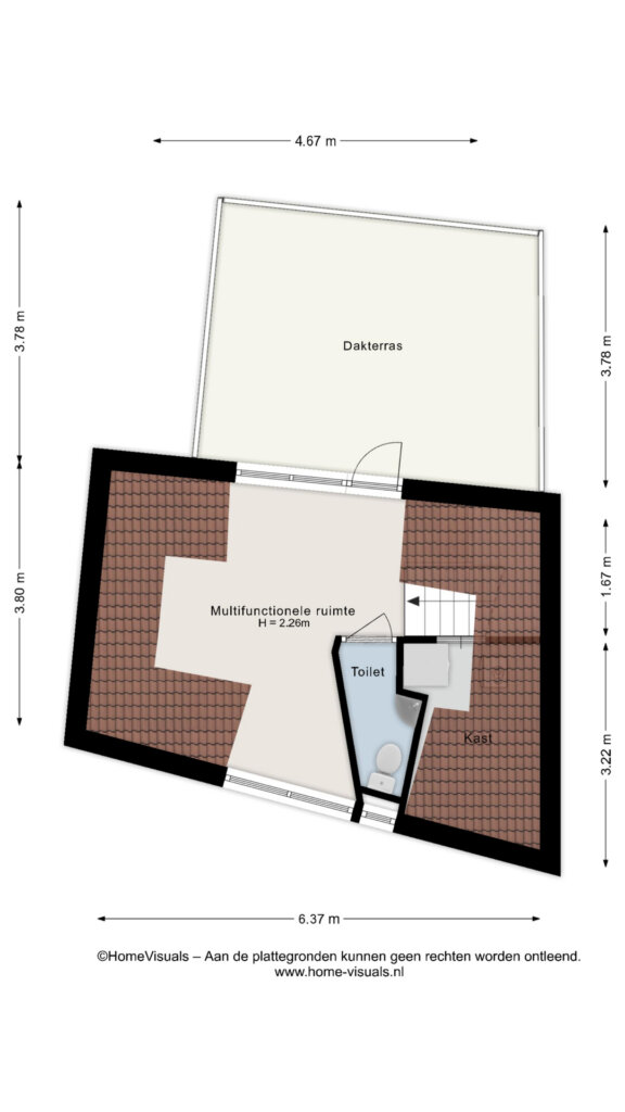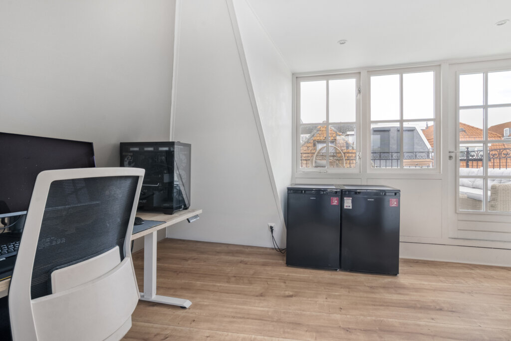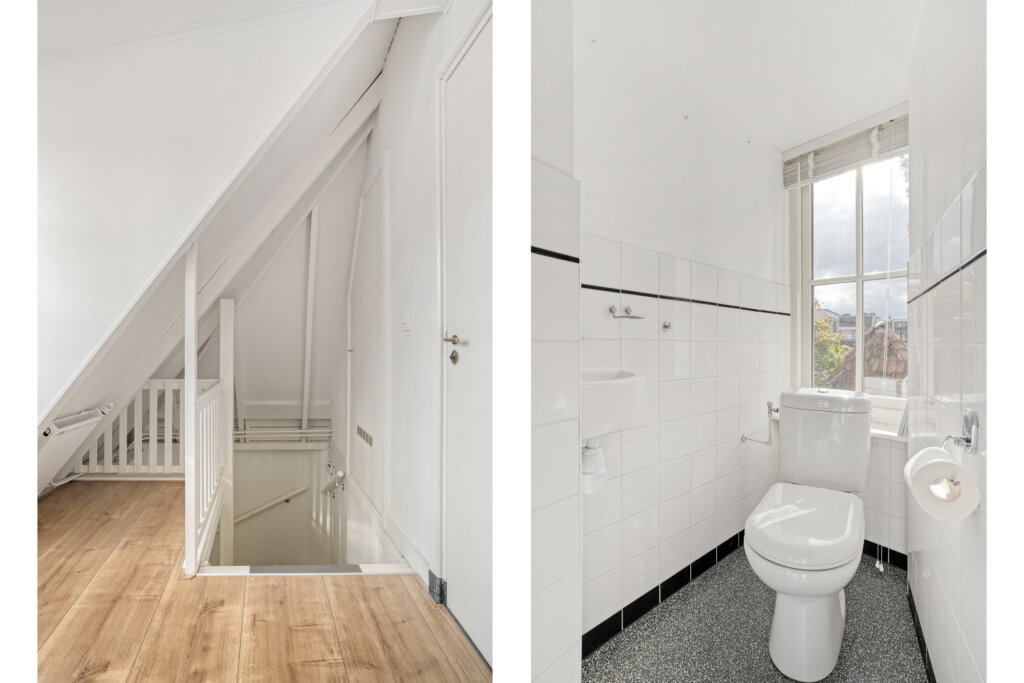 Een tweede vaste trap leidt naar de zolderverdieping. Bovenaan de trap vind je de cv-ruimte,afwatering, wasmachineaansluiting en hier zit nog extra elektra om eventueel de droger te kunnen plaatsen, en toegang tot een tweede toilet. Door het dakkapel aan de voorzijde is er voldoende ruimte en licht om hier een derde slaapkamer te creëren. Via de deur aan de achterzijde heb je toegang tot het tweede royale dakterras, een fijne plek om in alle rust van de zon te genieten.