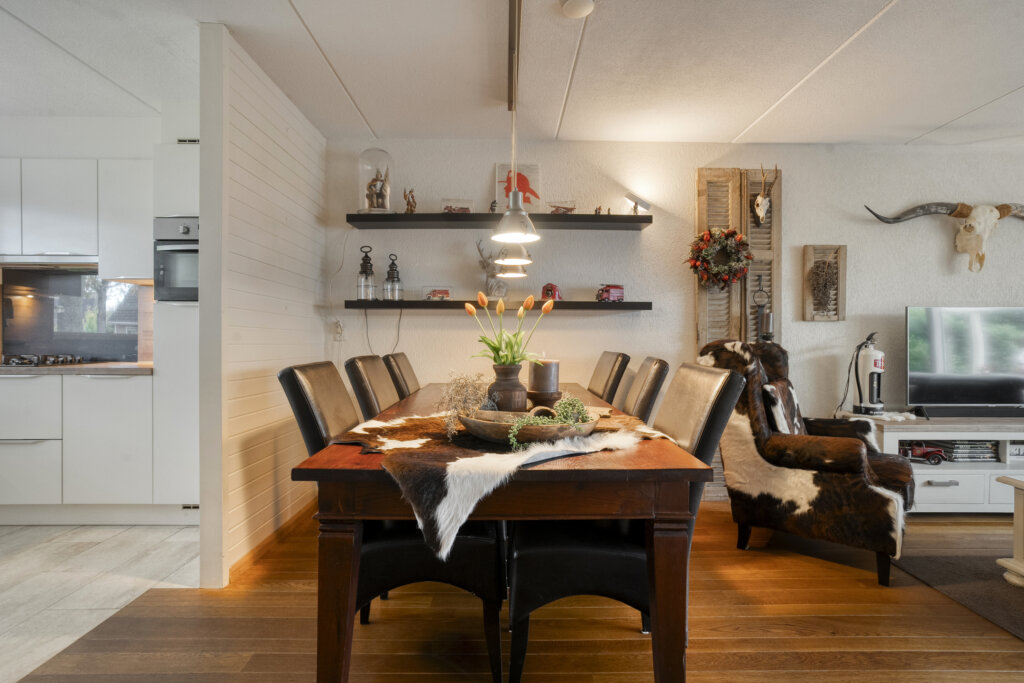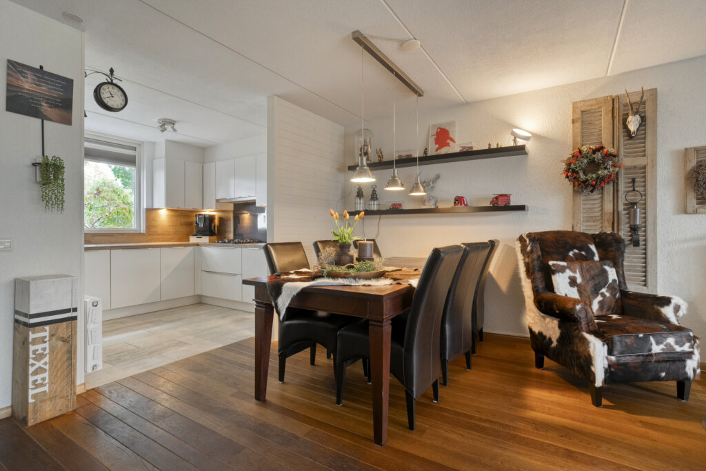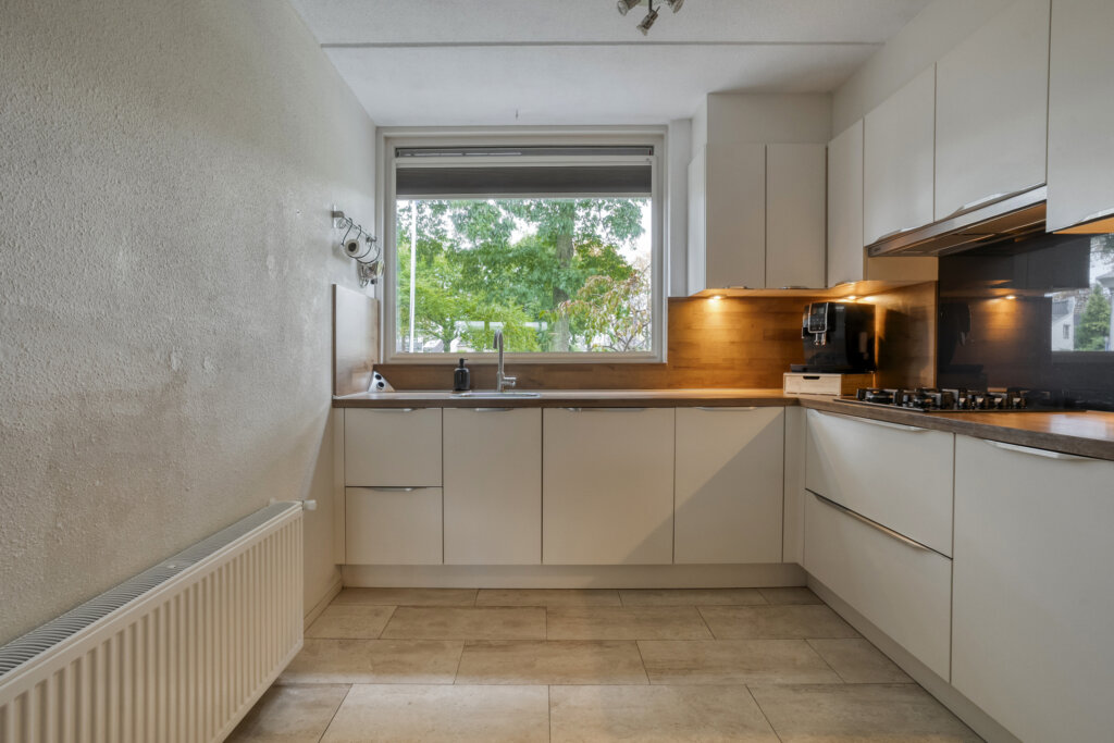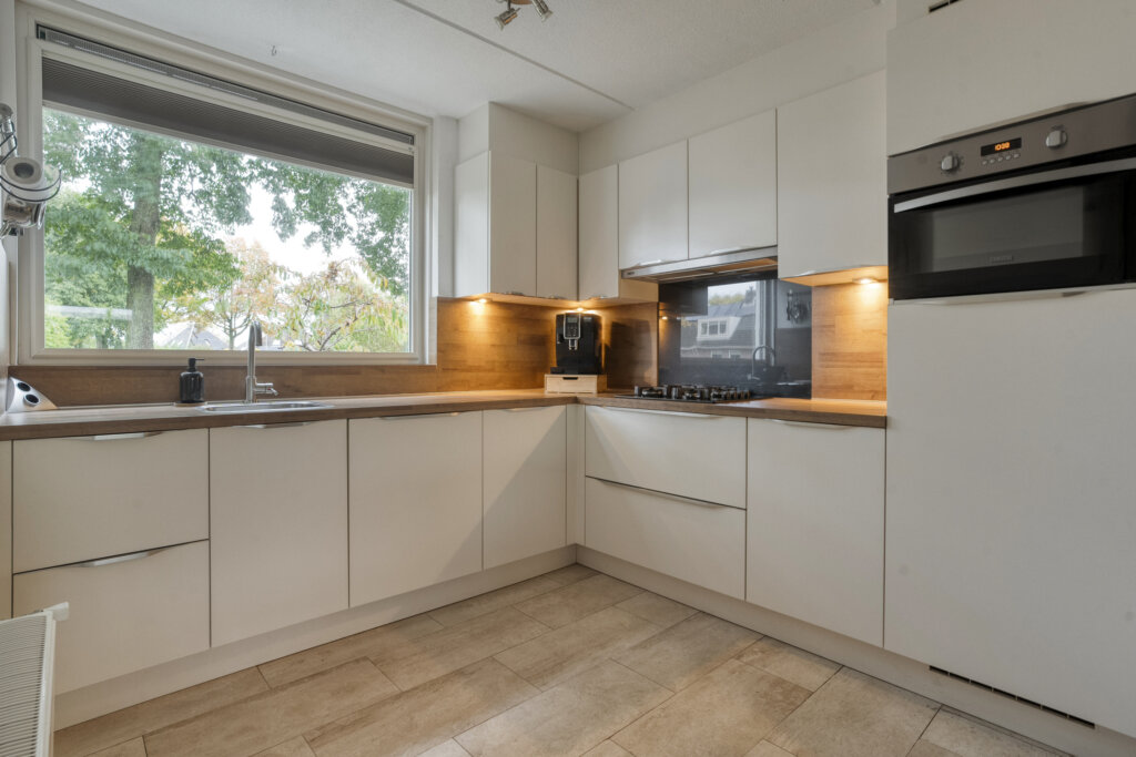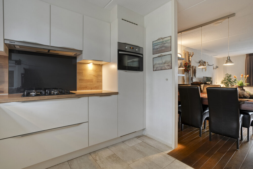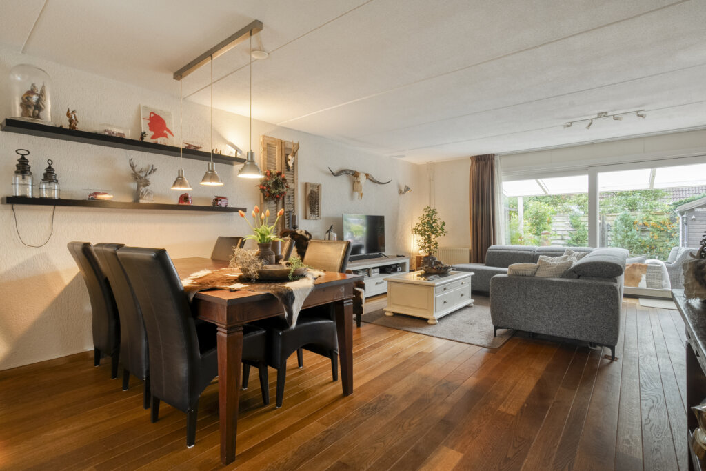 In de hal bevinden zich het toilet, de meterkast, de trap naar de eerste verdieping en de toegangen tot zowel de woonkamer als de omgebouwde garage. Aan de voorzijde van de woning bevindt zich de keuken (2018) voorzien van gaskookplaat, afzuiging, koelkast, combi-oven/magnetron en vaatwasser. Vanuit de keuken heb je prachtig vrij en groen uitzicht. De ruime woonkamer ligt aan de achterzijde en heeft een schuifpui naar de tuin met veranda. De veranda is een fijne plek om buiten te zitten, ongeacht het seizoen.