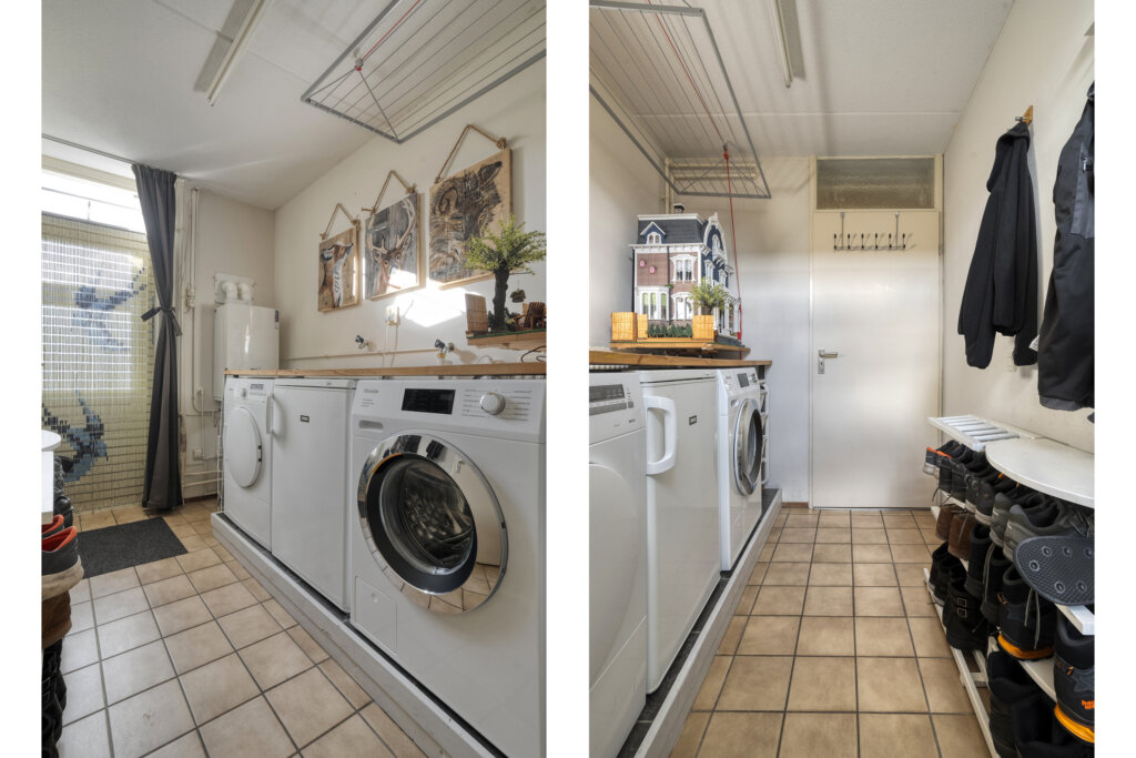 De omgebouwde garage biedt extra leefruimte, die nu al goed te gebruiken is als werk- of hobbykamer, maar ook mogelijkheden biedt om gelijkvloers te gaan wonen. Achter de garage is er de bijkeuken met aansluiting voor wasmachine en droger. De bijkeuken kan eventueel worden verbouwd tot badkamer. Vanuit de bijkeuken heb je tevens toegang tot de tuin.