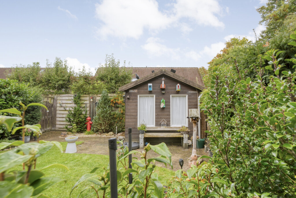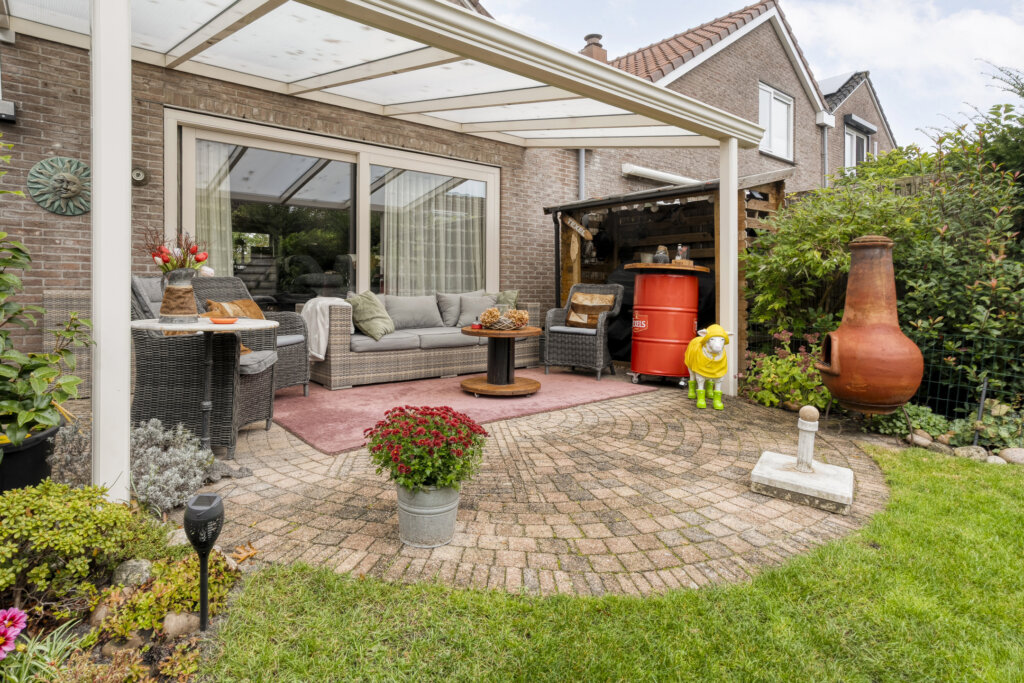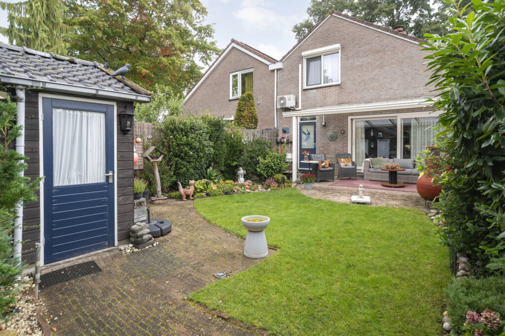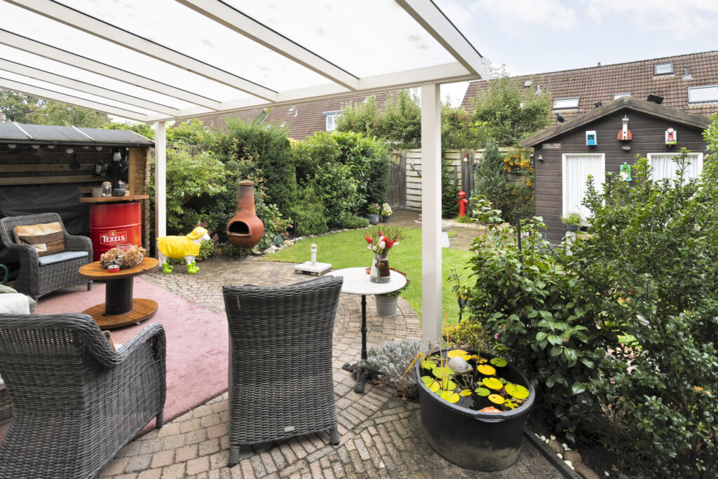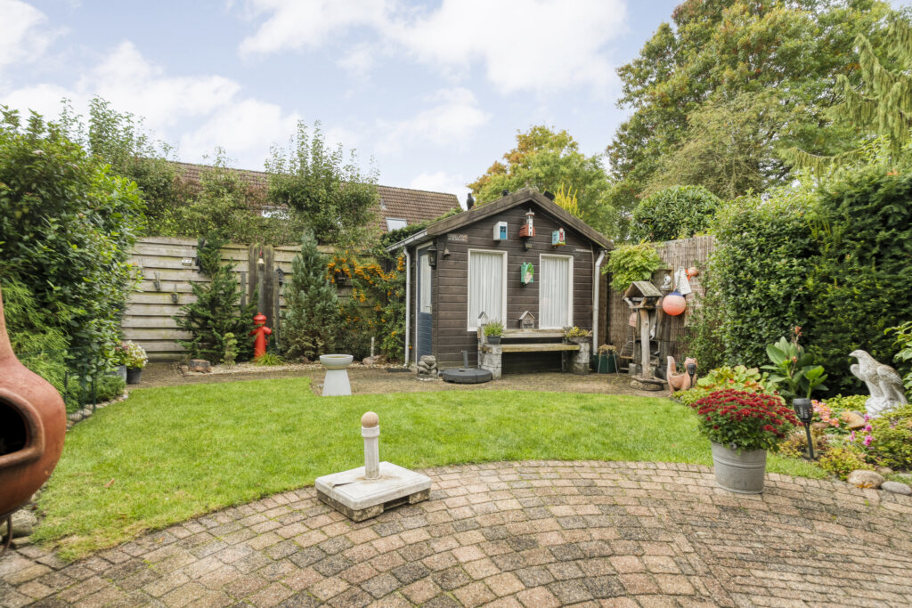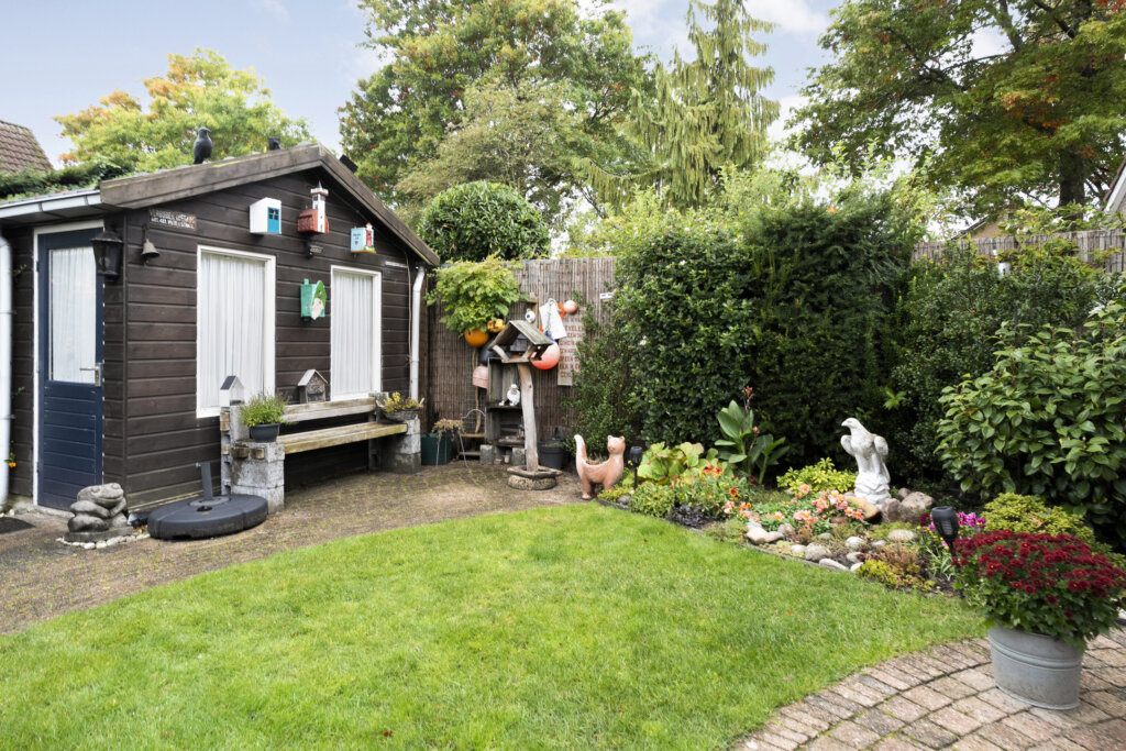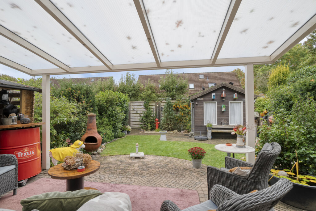De verzorgde achtertuin is gericht op het zuiden en voorzien van een veranda dat volop privacy biedt. In de tuin staat een houten tuinhuis, ideaal voor het opbergen van fietsen, gereedschap of andere tuinspullen. Daarnaast beschikt de tuin over een achterom. Aan de voorzijde van de woning is parkeergelegenheid op eigen terrein.