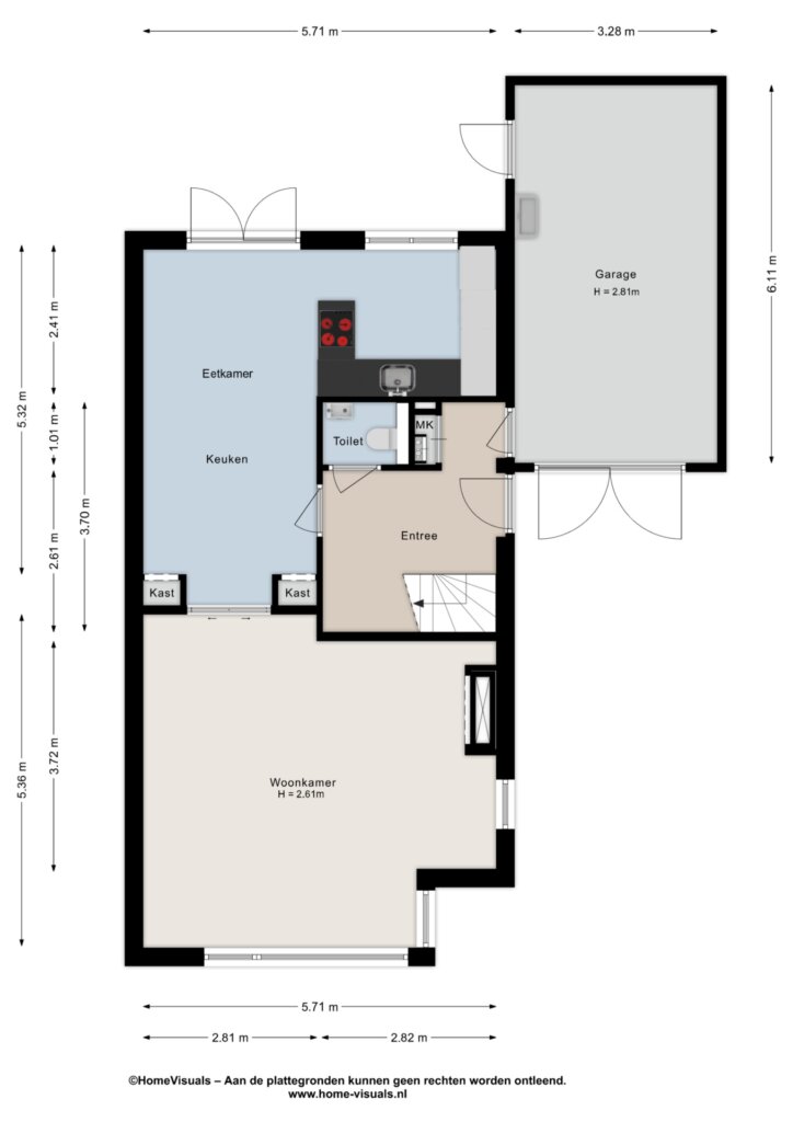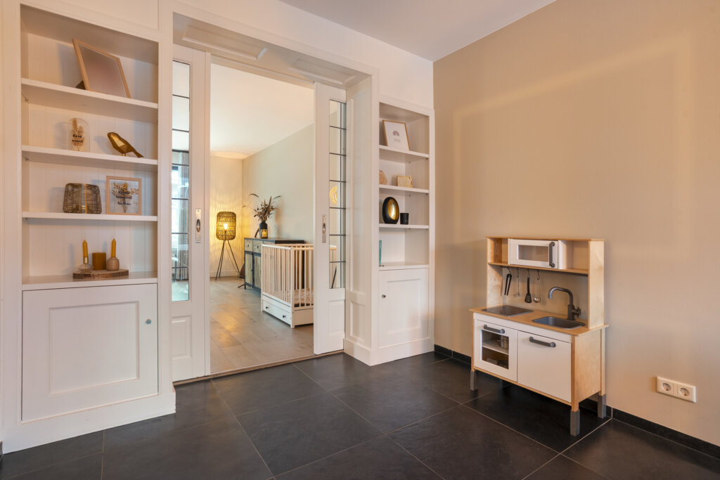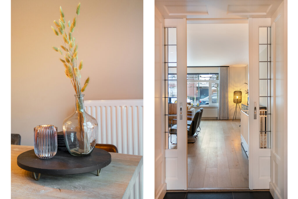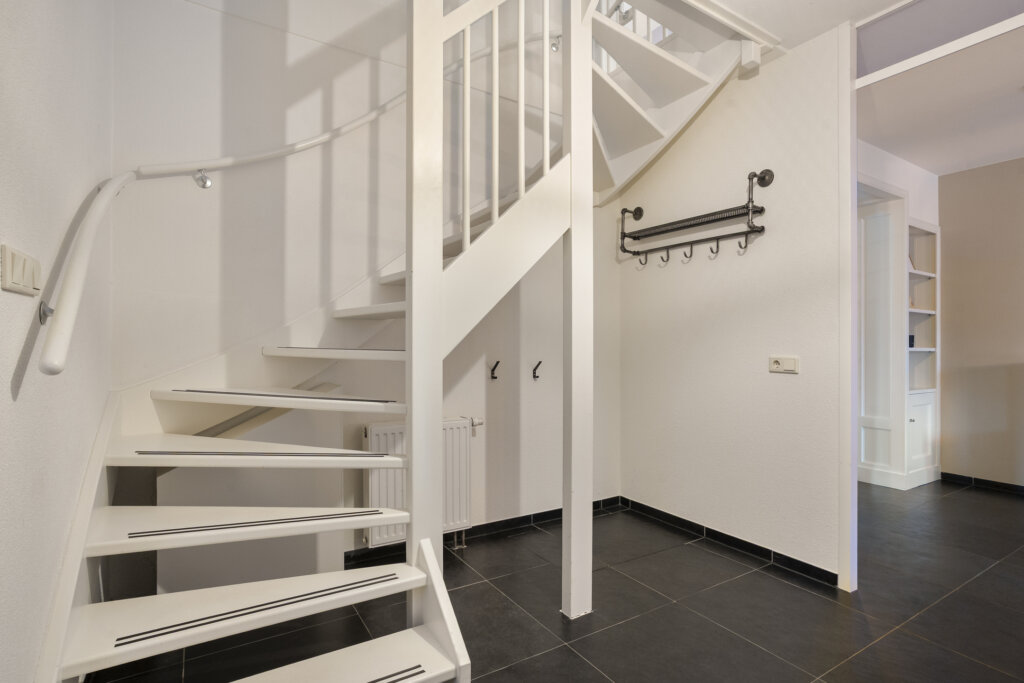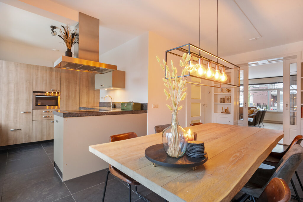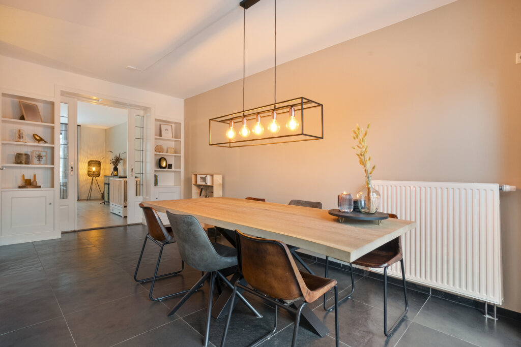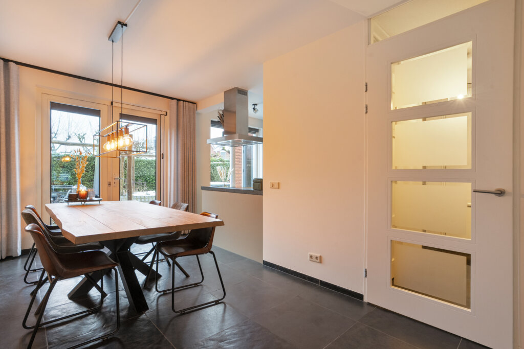 Aan de achterzijde bevinden zich de eetkamer en keuken met uitzicht op de tuin. Vanuit de eetkamer heb je via openslaande deuren, met hordeur, toegang tot de tuin.