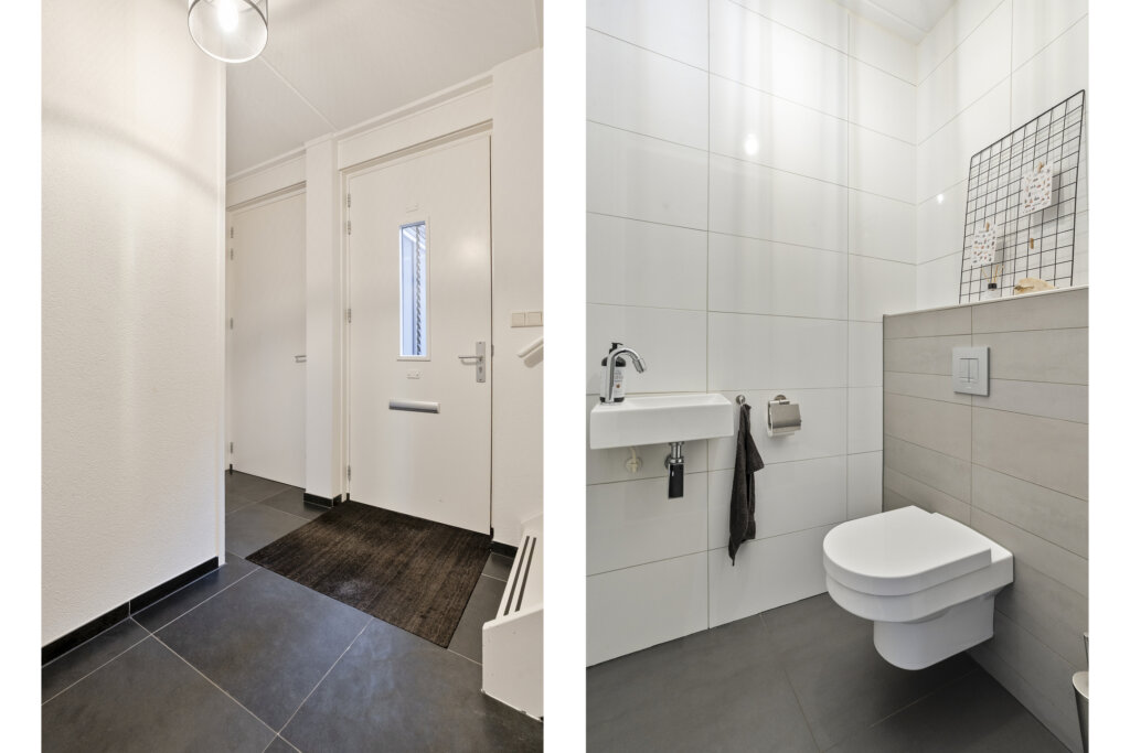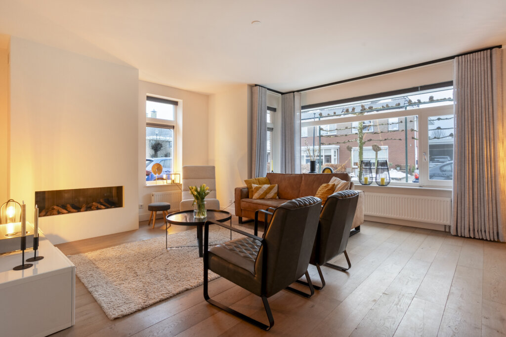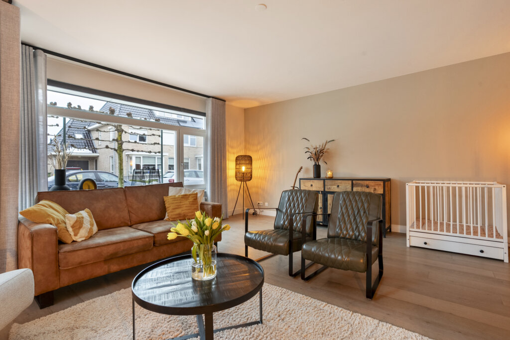 Bij binnenkomst betreed je de hal met toegang tot het toilet, de trap naar de eerste verdieping, de meterkast, de woonkamer en de garage. Vanuit de hal kom je in het woongedeelte, met aan de voorzijde de woonkamer en suite met schuifdeuren die zijn weggewerkt in een vaste kast. De woonkamer met een gashaard en grote raampartijen, is een heerlijke ruimte om gasten te ontvangen of om gewoon lekker te ontspannen.
