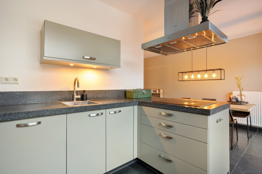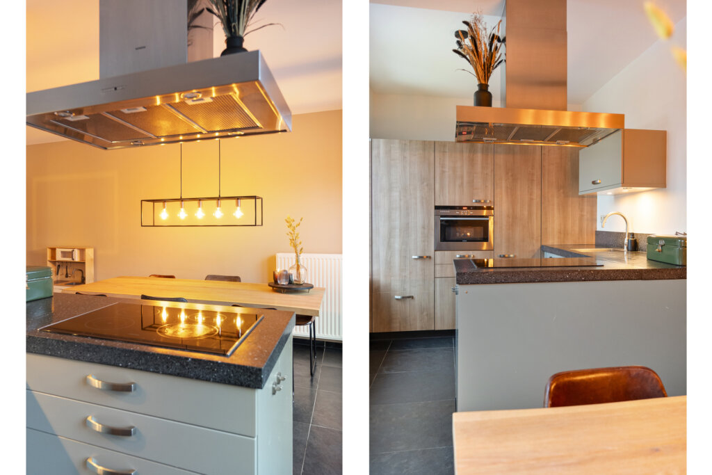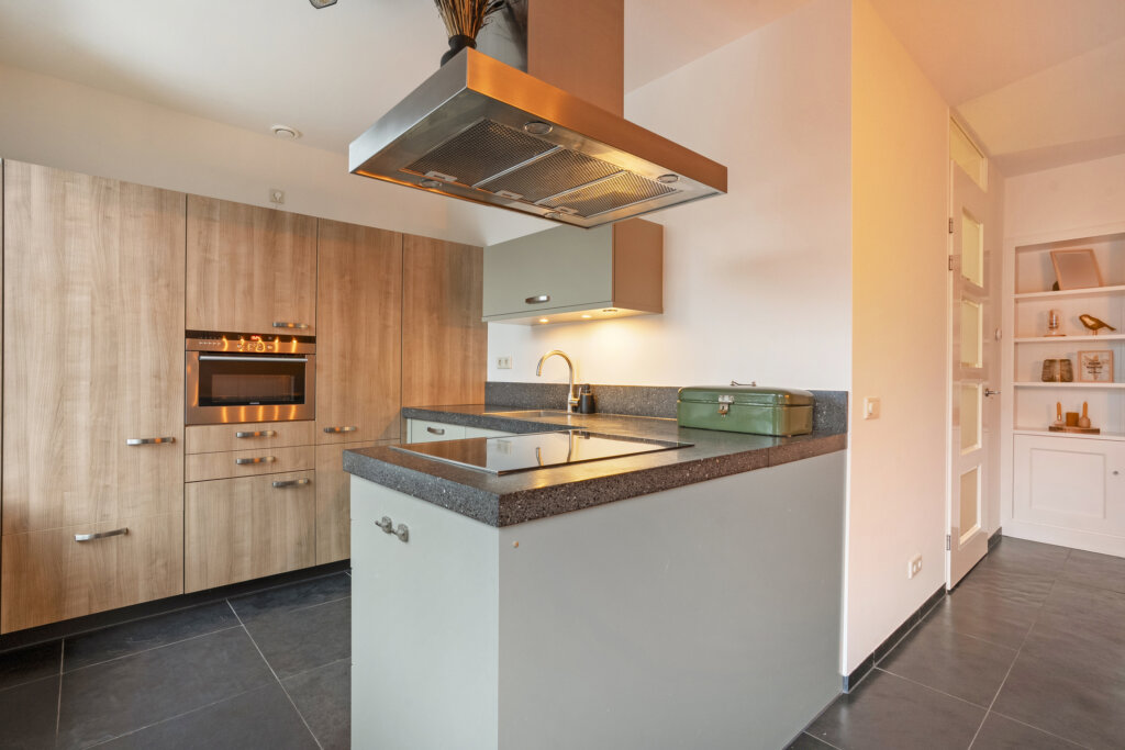 De open keuken is uitgerust met een inductiekookplaat met afzuigkap, combi-oven/magnetron, vaatwasser, ruime carrouselkast en een inbouwkoelkast. De keukenopstelling is praktisch en zo geplaatst dat je tijdens het koken nog steeds contact houdt met de eetkamer.