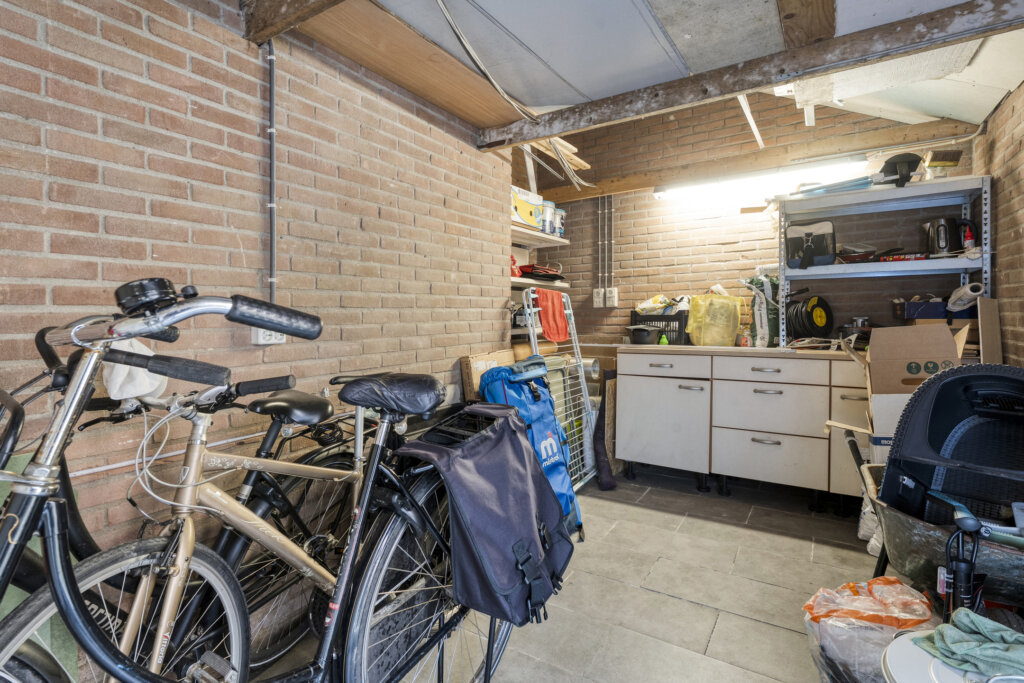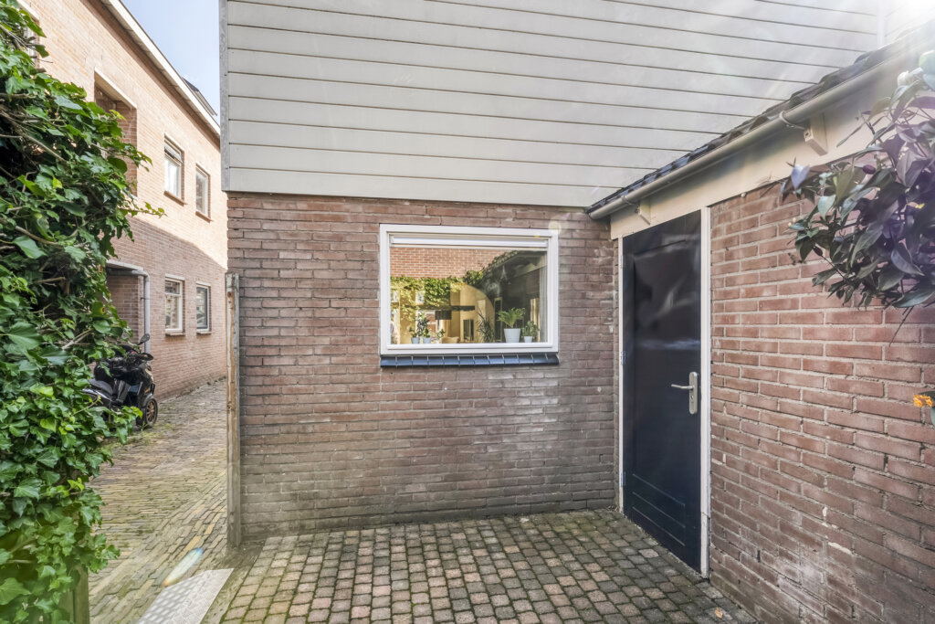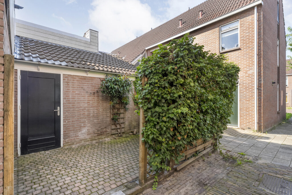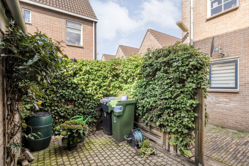 De stadstuin heeft een groene uitstraling dankzij de heg die langs de schutting groeit. De tuin is bereikbaar via de aangebouwde berging aan de achterzijde van de woning en via een achterom.