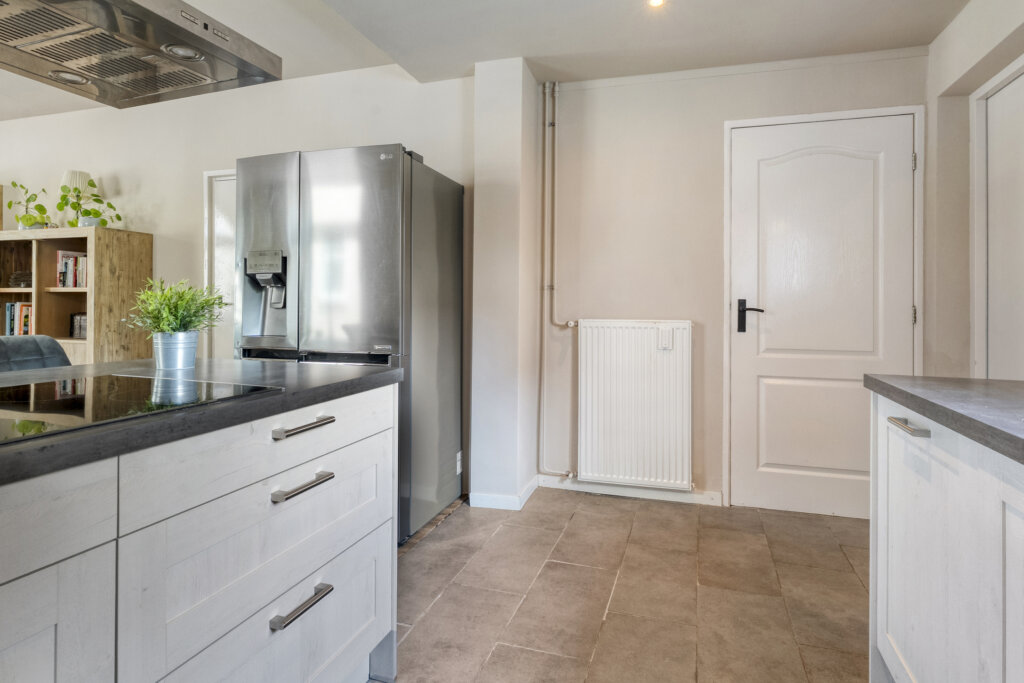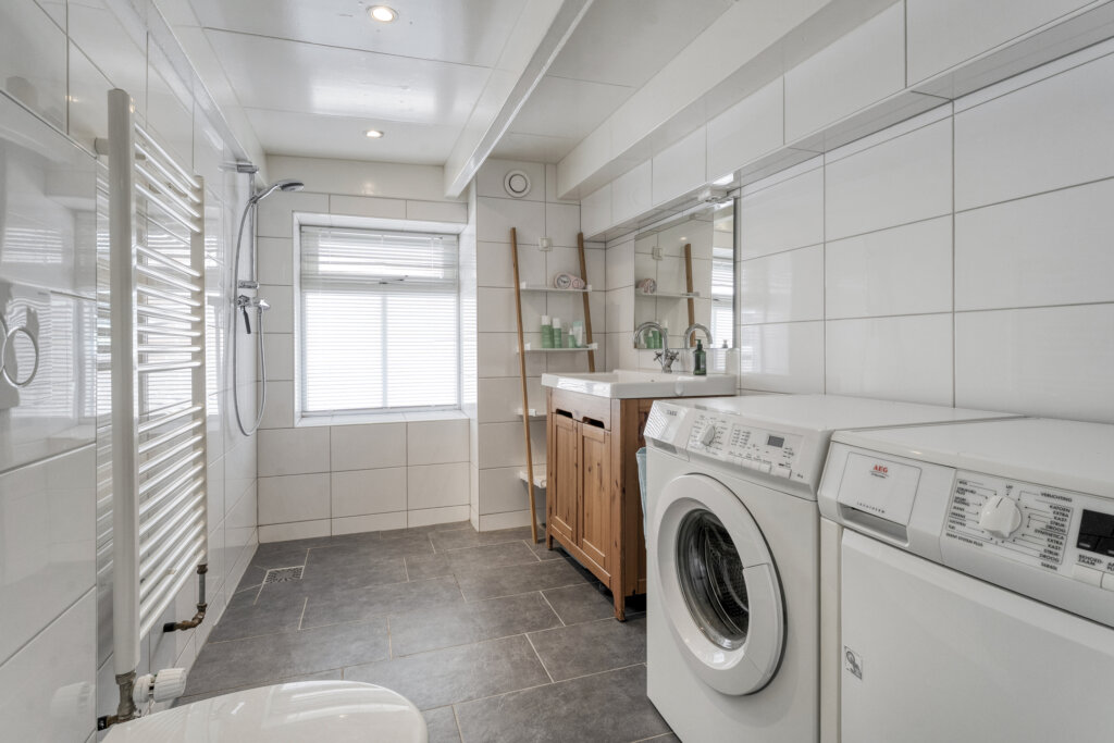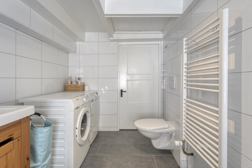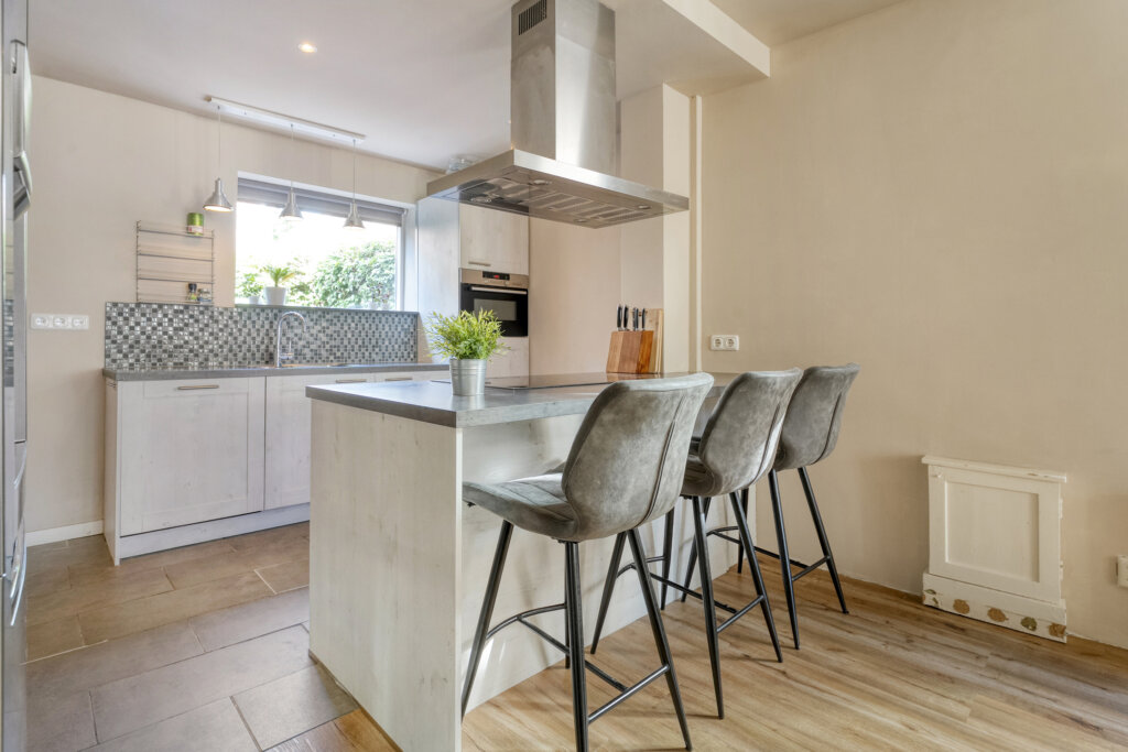 Je komt binnen in de ruime hal met toegang tot de meterkast, het toilet en de woonkamer. De kamer is verdeeld in een gezellig woongedeelte aan de voorzijde, met een pelletkachel in het midden, waar ook de eetkamer zich bevindt. Daar is ook een trapkast met veel bergruimte. De keuken bevindt zich achterin, met een kookeiland en bar, waardoor de verbinding met de woonkamer blijft bestaan. Tussen de woon- en eetkamer is een toog geplaatst, wat de sfeer van de woning versterkt. De ruime keuken bestaat uit een vast aanrecht onder het raam aan de achterzijde, een kookeiland met bar, inductiekookplaat, afzuigkap, combi-oven, vaatwasser en losstaande koelkast (blijft achter). Vanuit de keuken heb je toegang tot de aangebouwde royale berging. In de berging bevindt zich de deur naar de tuin, die gelegen is op het zuidwesten. In de keuken bevindt zich ook de toegang tot de trap naar de eerste verdieping. Deze toegang is afgesloten met een deur.