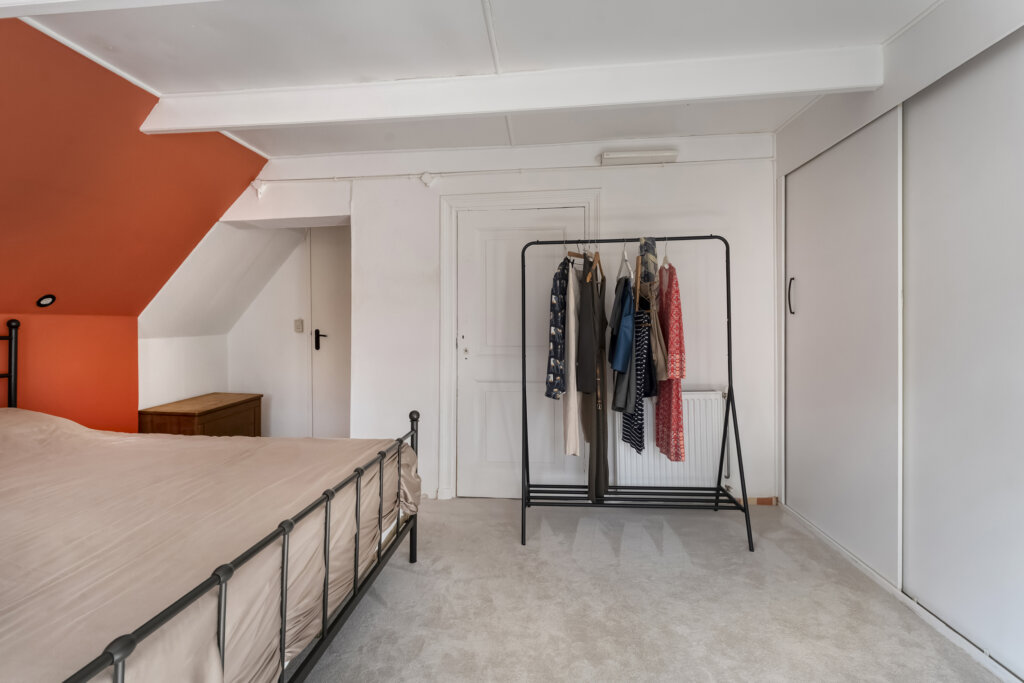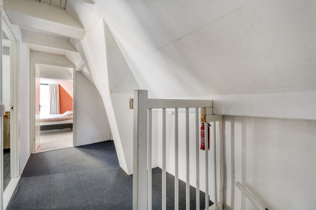 Via de trap in de keuken kom je op de eerste verdieping. Hier heb je toegang tot drie slaapkamers en de badkamer. Aan de voorzijde van de woning bevindt zich de grootste slaapkamer, met een inbouwkast over de volledige breedte. Het interieur van deze kast is onlangs gemoderniseerd. De twee andere slaapkamers liggen aan de zijkant van de woning. Alle ruimtes op de eerste verdieping zijn bereikbaar via de lange overloop. De badkamer is uitgerust met een aparte douche en een wastafelmeubel. Vanuit de badkamer is er toegang tot de vliering. Tegenover de badkamer bevindt zich een ruime inbouwkast waarin ook de cv-ketel is geplaatst.