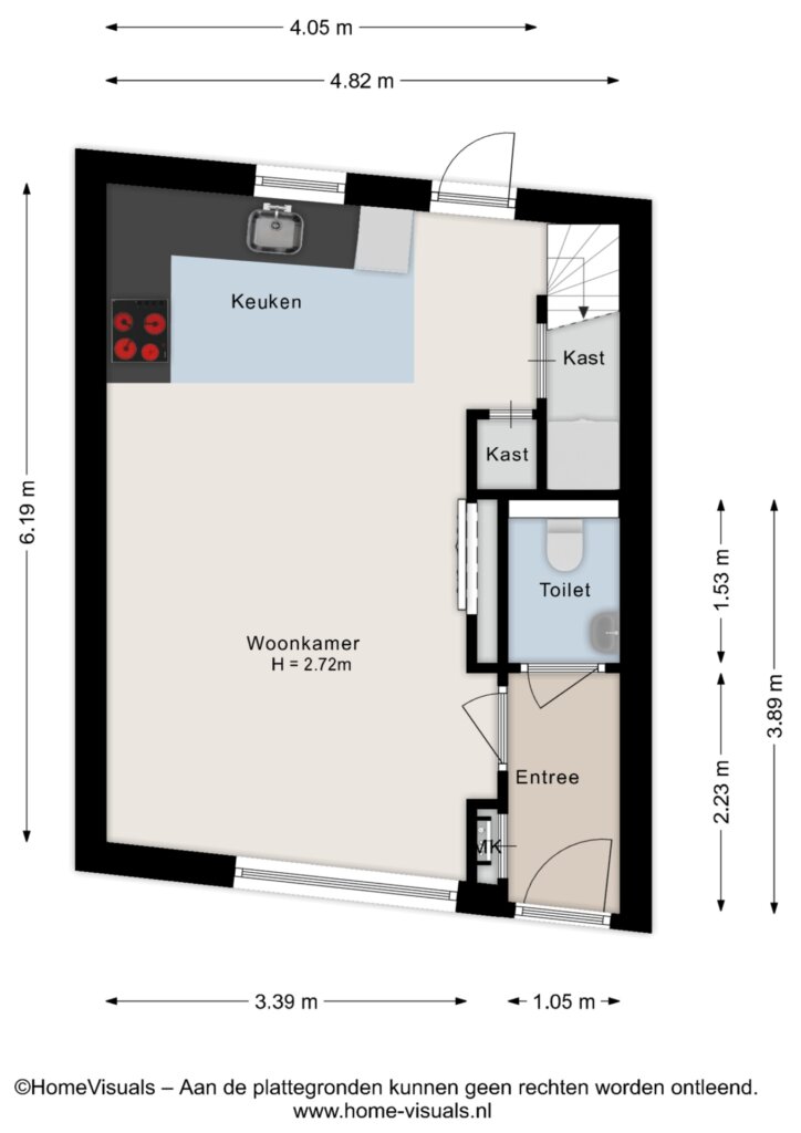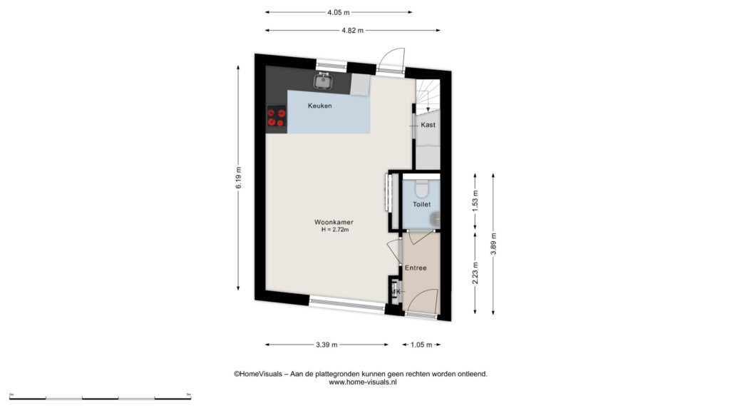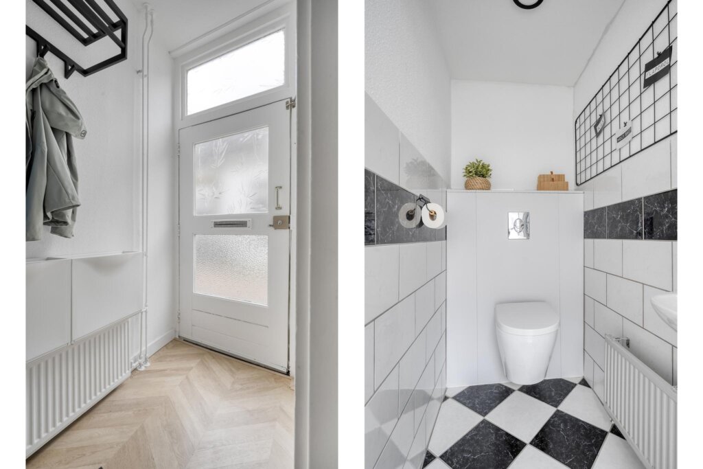 We beginnen bij de voordeur aan de rustige en sfeervolle Molenstraat. Zodra je binnenstapt, kom je in de entreehal met ruimte voor jassen en schoenen. Rechts bevindt zich het toilet, nog in authentieke staat maar netjes en functioneel. Loop je rechtdoor, dan kom je in de lichte en verrassend ruime woonkamer.