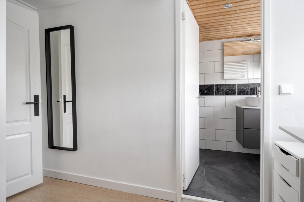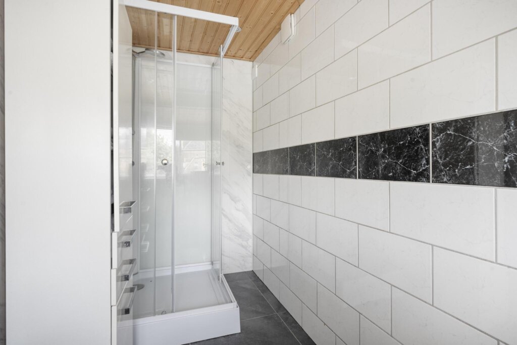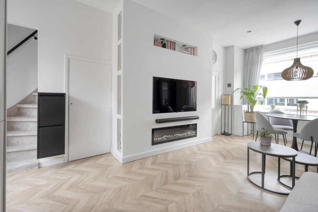Binnen is gekozen voor een strak en opgeruimd interieur. De ingebouwde tv en diverse nisjes zorgen voor een minimalistische en functionele inrichting, wat het huis niet alleen stijlvol maar ook praktisch maakt.