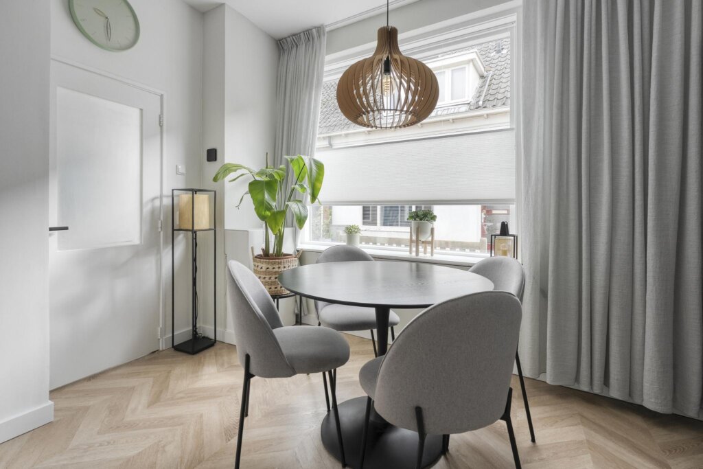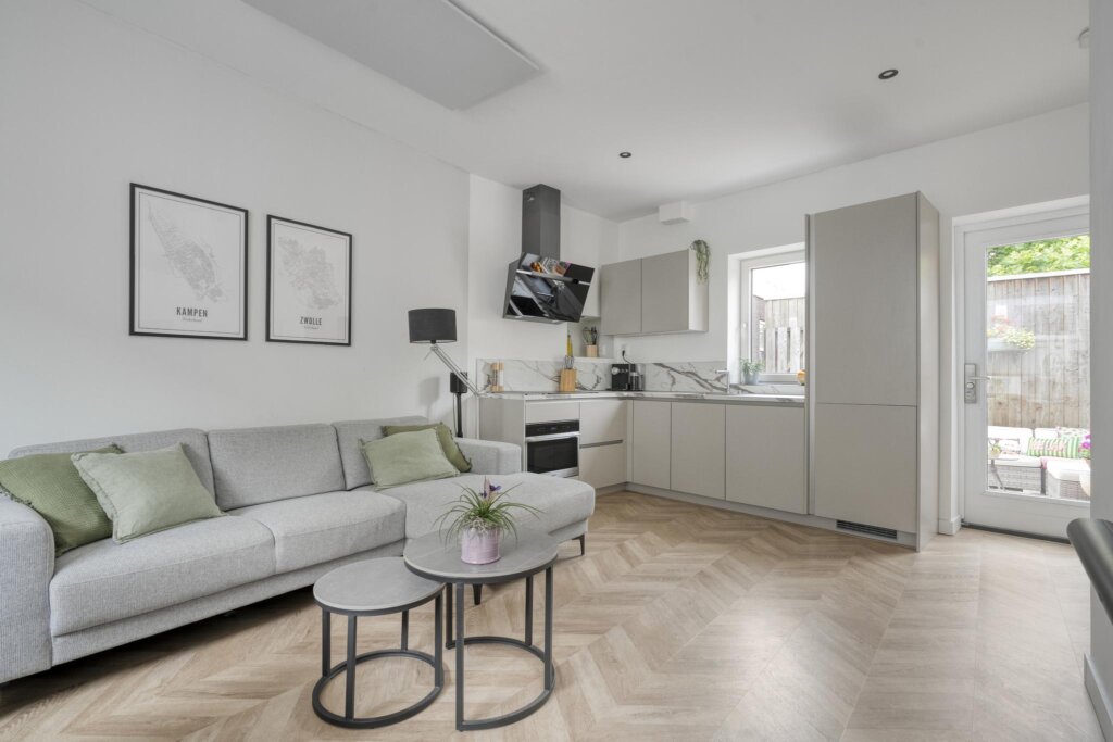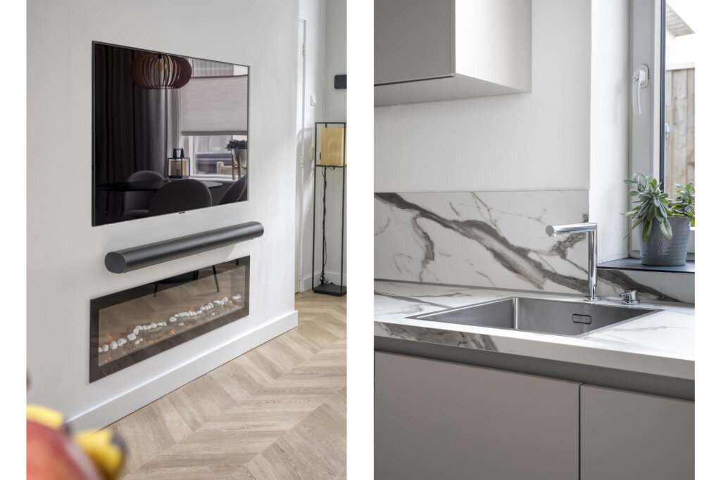 Wat direct opvalt, is de enorme hoeveelheid daglicht. Dankzij de opengebroken achtergevel met een extra deur en groot raam stroomt het zonlicht volop naar binnen. De strakke afwerking en slimme inbouwoplossingen, zoals de ingebouwde tv en nisjes, geven de ruimte een moderne en opgeruimde uitstraling. Achterin bevindt zich de open keuken, praktisch en efficiënt ingericht met alles wat je nodig hebt, inclusief inbouwapparatuur en een stijlvol werkblad.