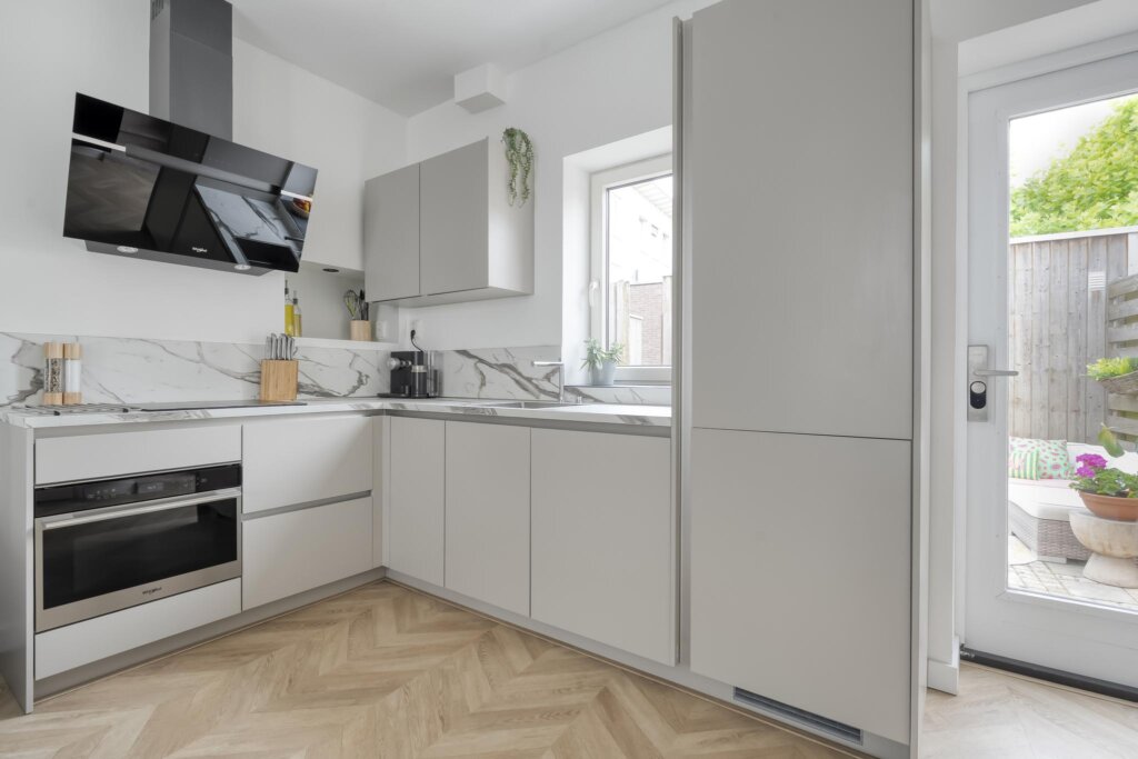 Aan de zijkant vind je twee inbouwkasten, ideaal voor voorraad, de stofzuiger of schoonmaakspullen. Ook je wasmachine en droger kun je hier prima kwijt.