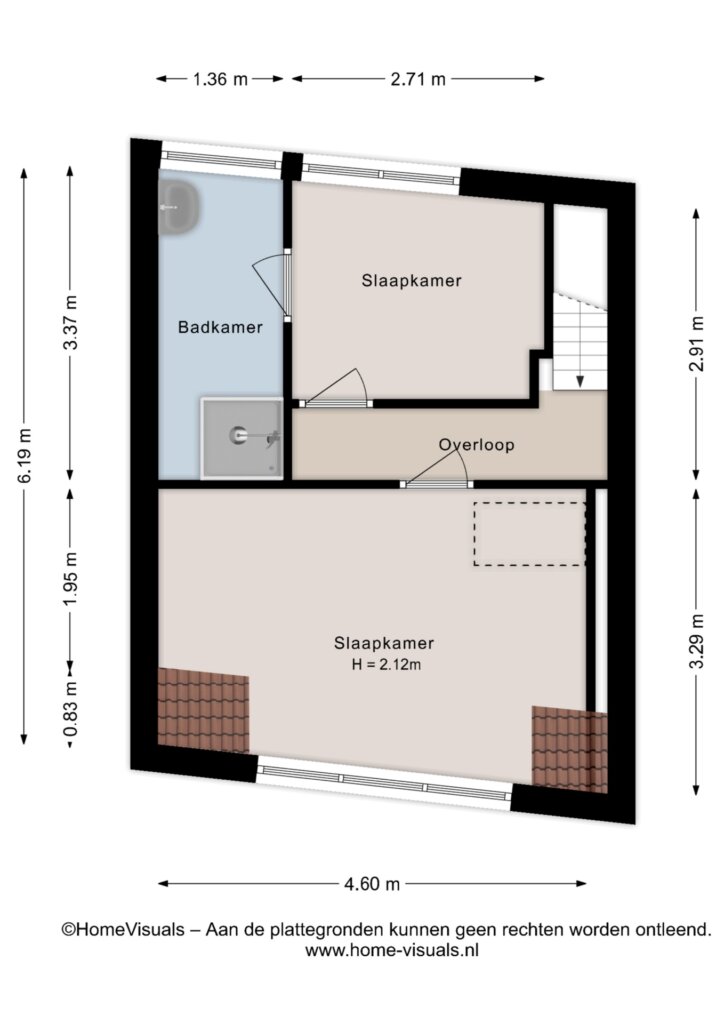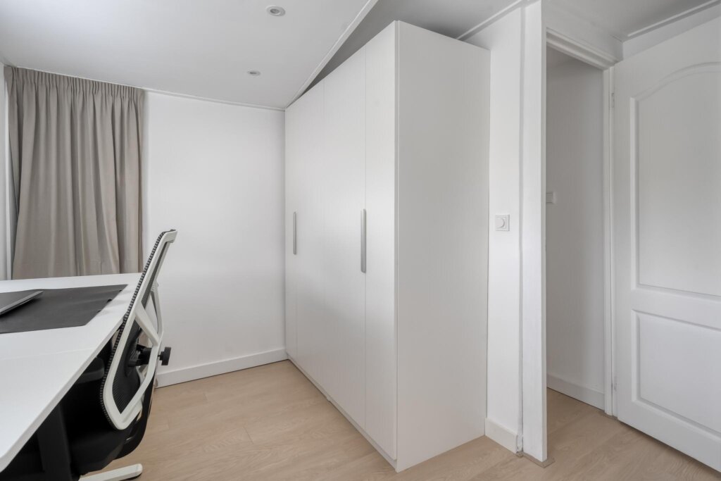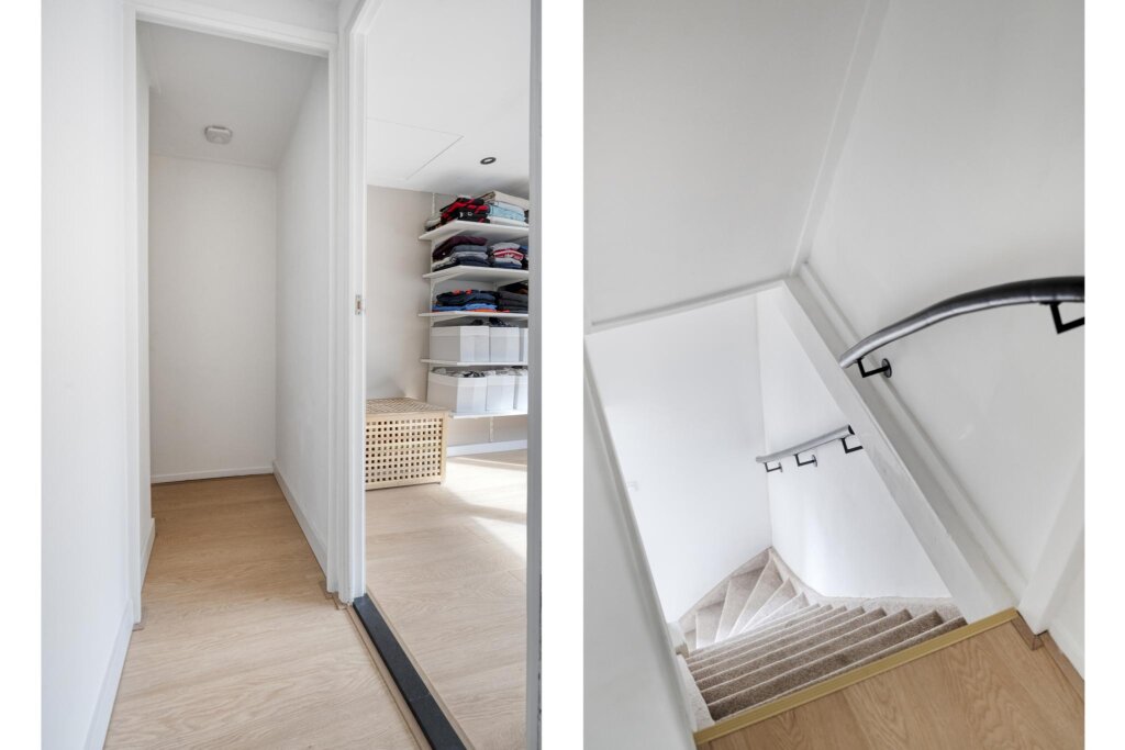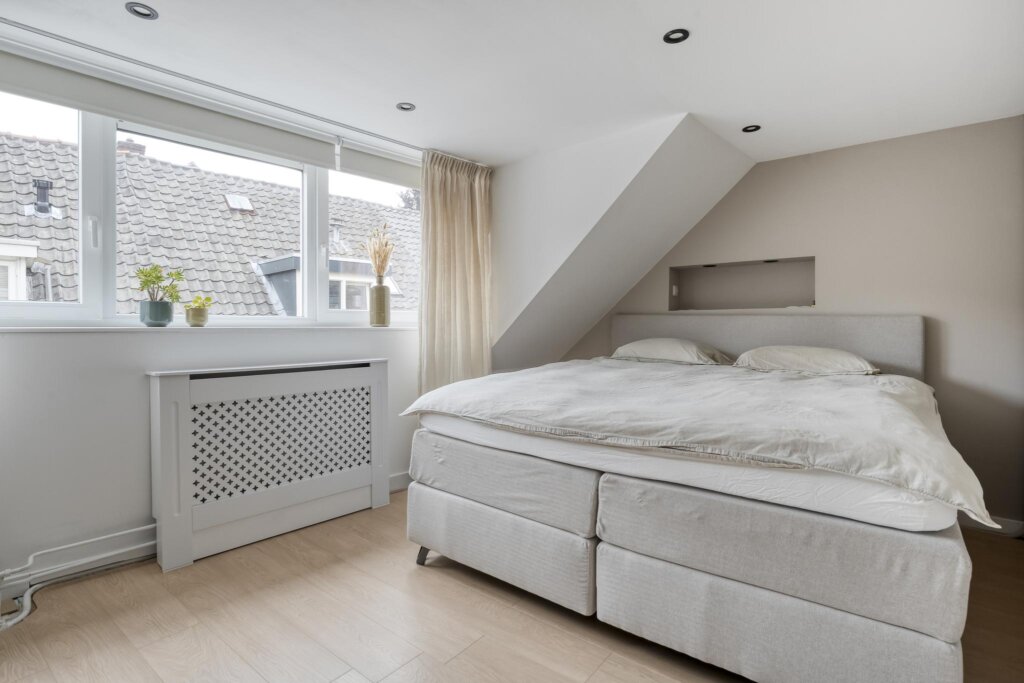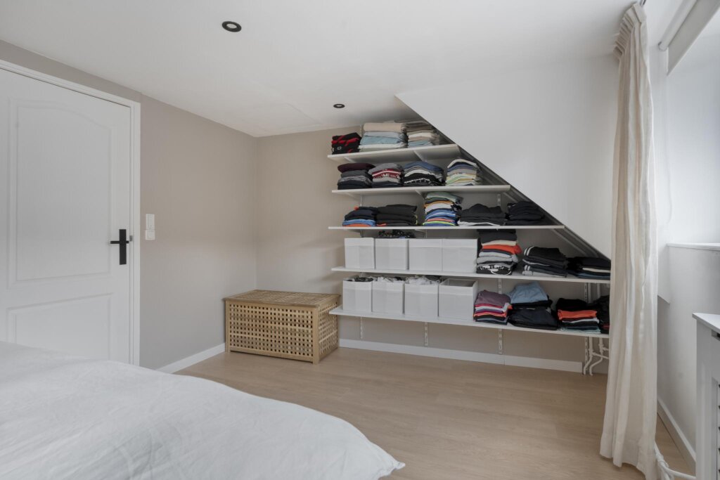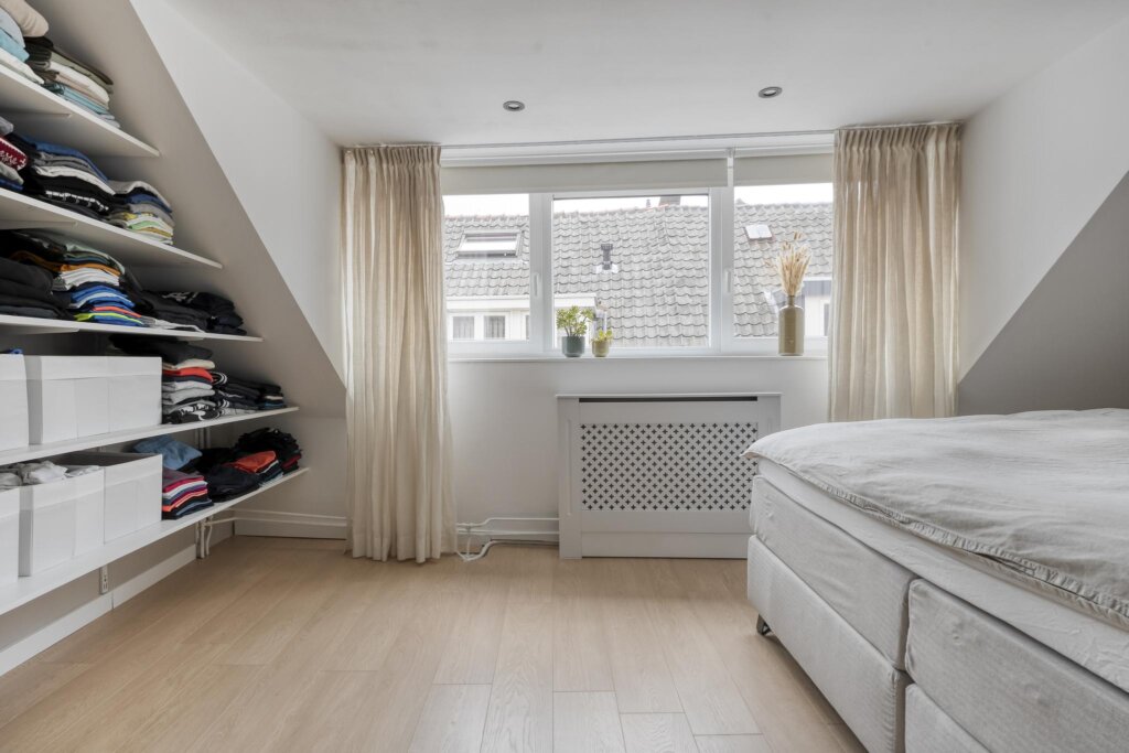 We lopen weer naar binnen en nemen de trap naar boven. Op de overloop heb je toegang tot twee slaapkamers. Aan de voorzijde ligt de grootste kamer, met een groot dakkapel. Hier is voldoende ruimte voor een tweepersoonsbed en een kledingkast. In deze kamer bevindt zich ook het luik naar de bergzolder. De tweede slaapkamer ligt aan de achterzijde en is iets compacter. Perfect als logeer- of werkkamer.