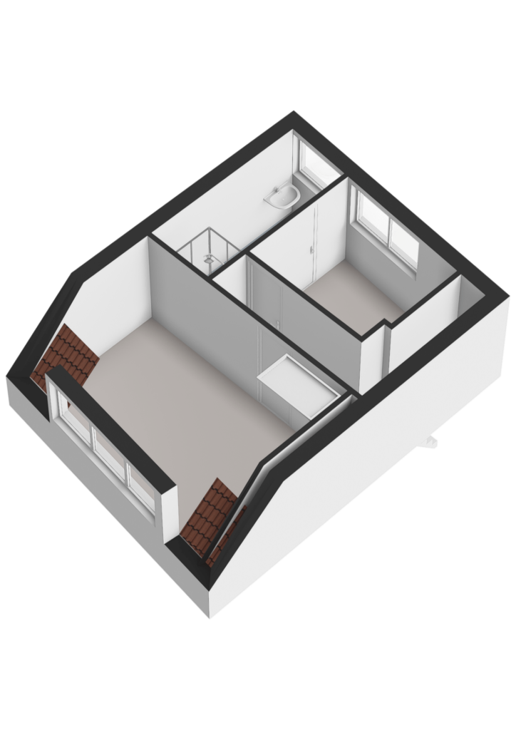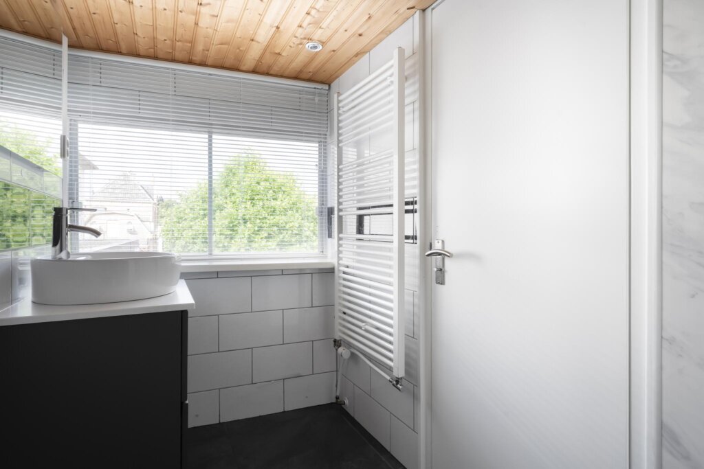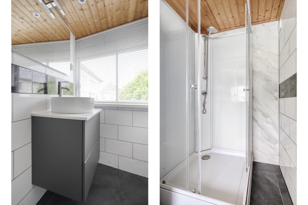 Tussen de slaapkamers in bevindt zich de badkamer, voorzien van een douchecabine, wastafelmeubel en designradiator.