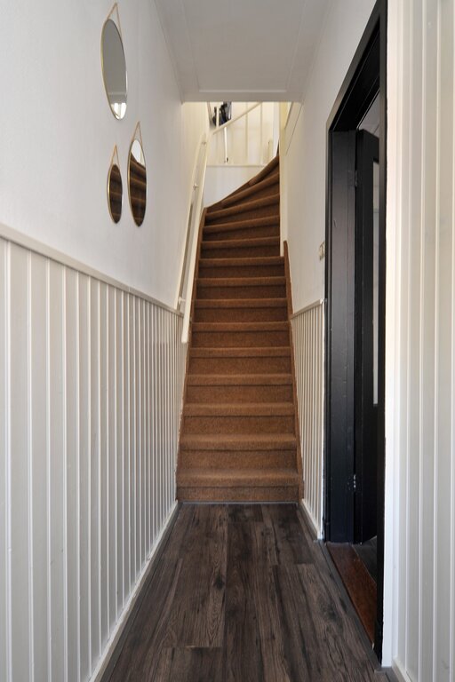 Via de trap in de hal bereik je de eerste verdieping. Op deze verdieping kun je 2 ruime en lichte slaapkamers vinden. De ouderkamer is over de gehele breedte en heeft een inbouwkast en een wastafel. Op de overloop is nog een handige vaste inbouwkast voor het opbergen van je spullen.