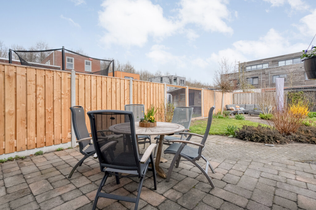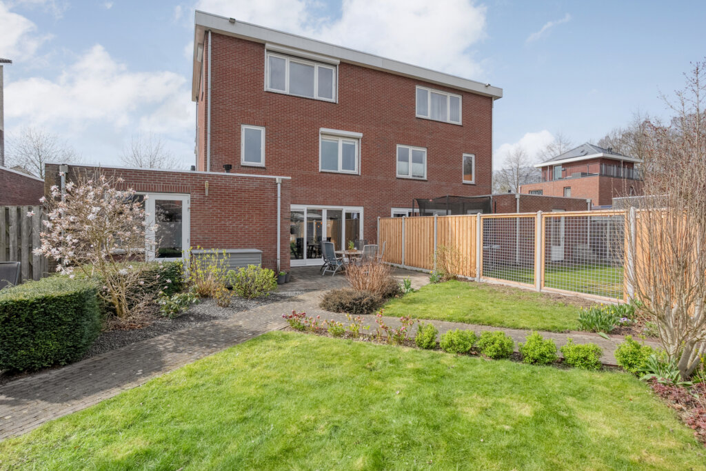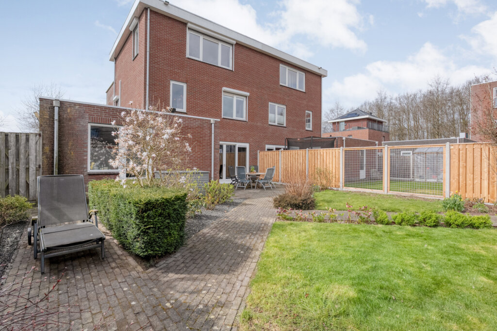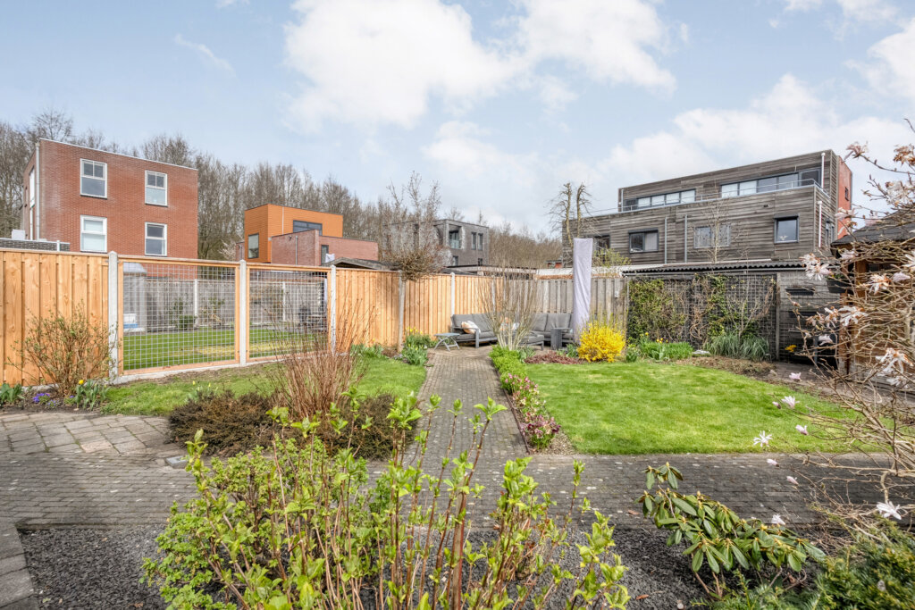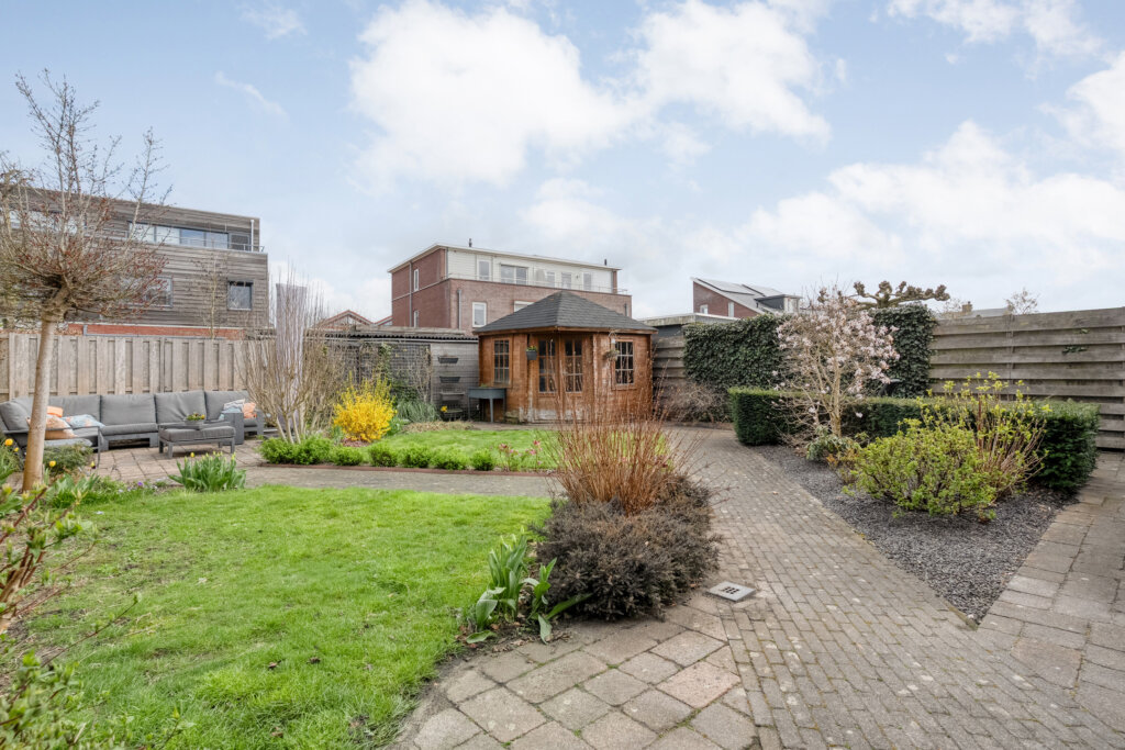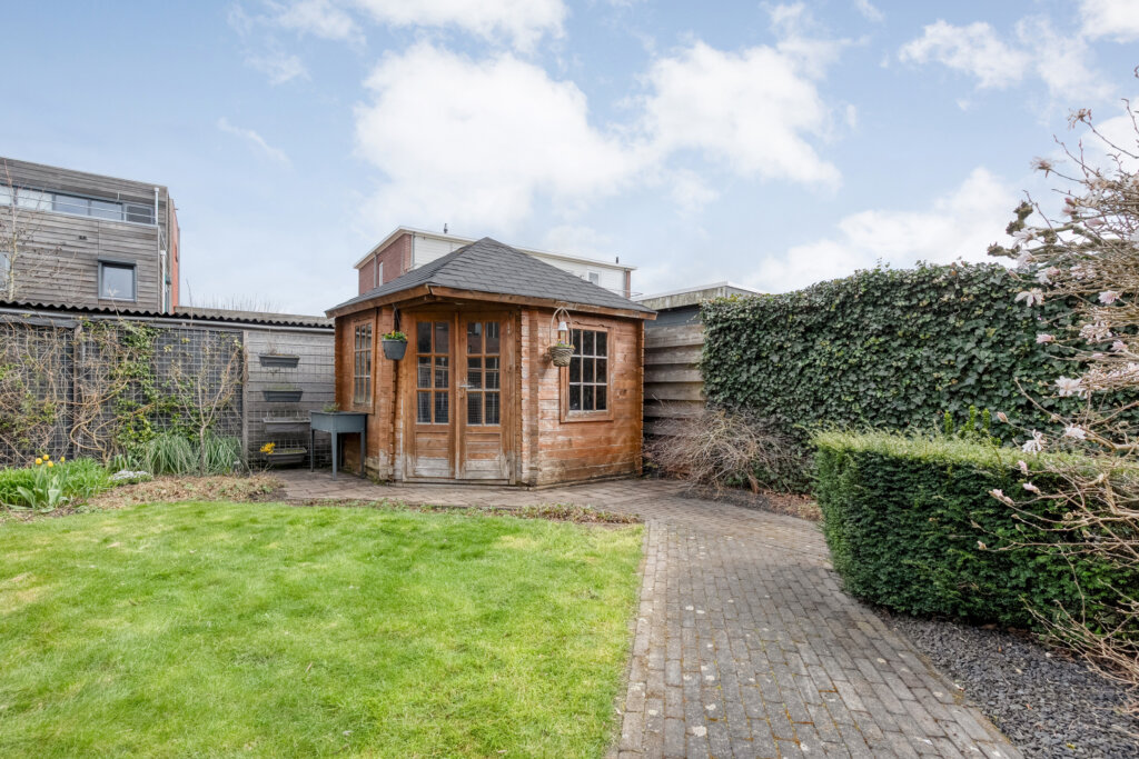 De ruime en fraai aangelegde achtertuin is gericht op het noordoosten. De tuin, met meerdere zitplekken, biedt je de ruimte om de zon of schaduw op te zoeken. Achterin de tuin staat een tuinhuisje, een plek om het tuingereedschap op te bergen. De tuin is ook via een zij-ingang naast de garage toegankelijk. Aan de voorzijde van de woning is op de oprit ruimte om gemakkelijk twee auto’s te parkeren.