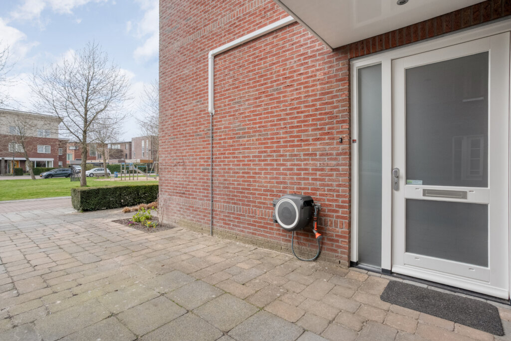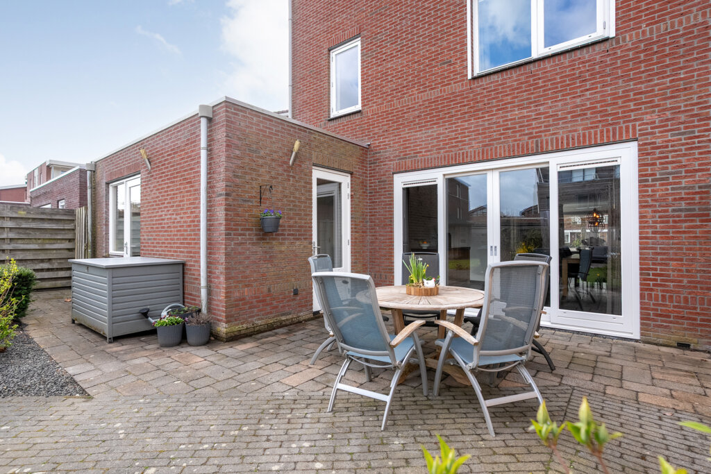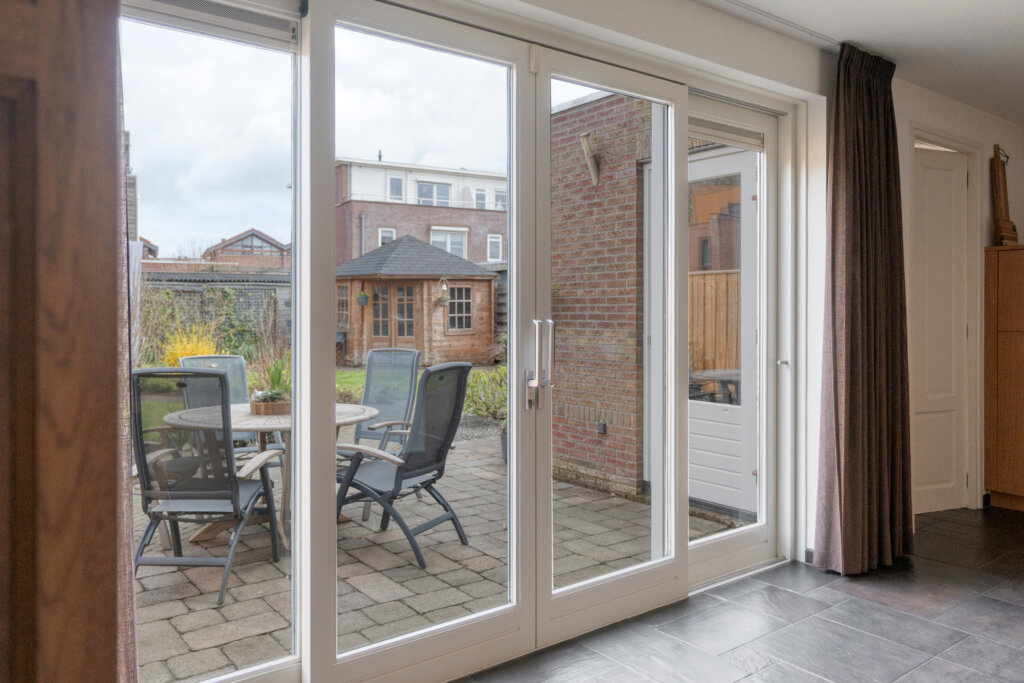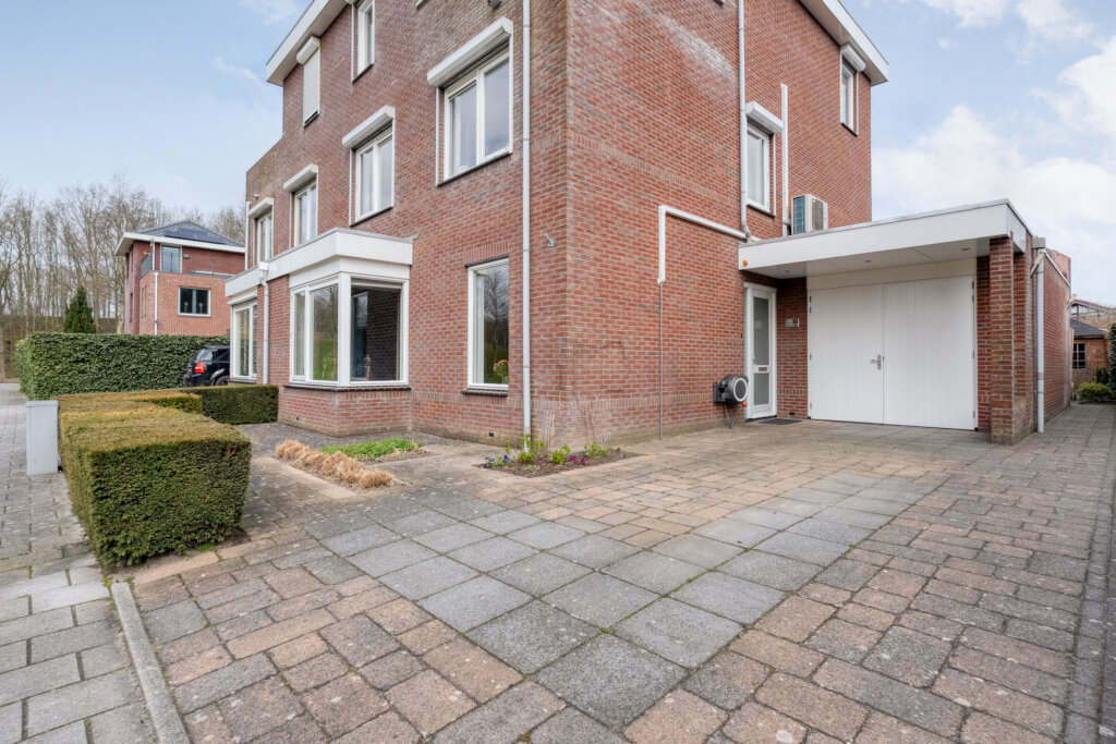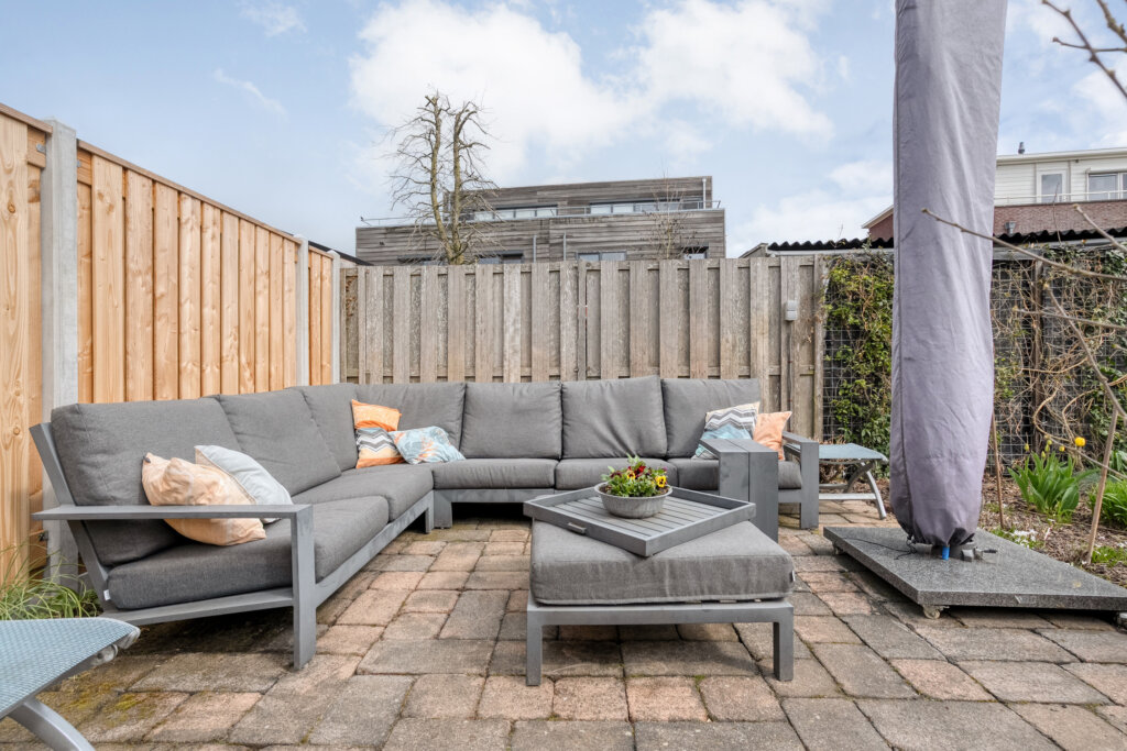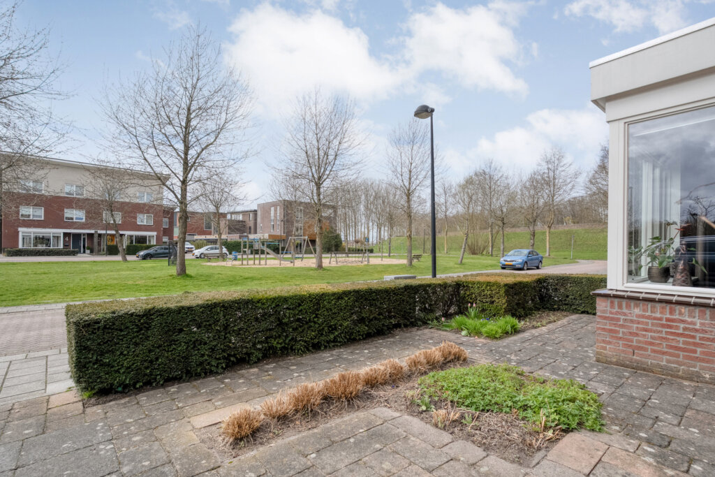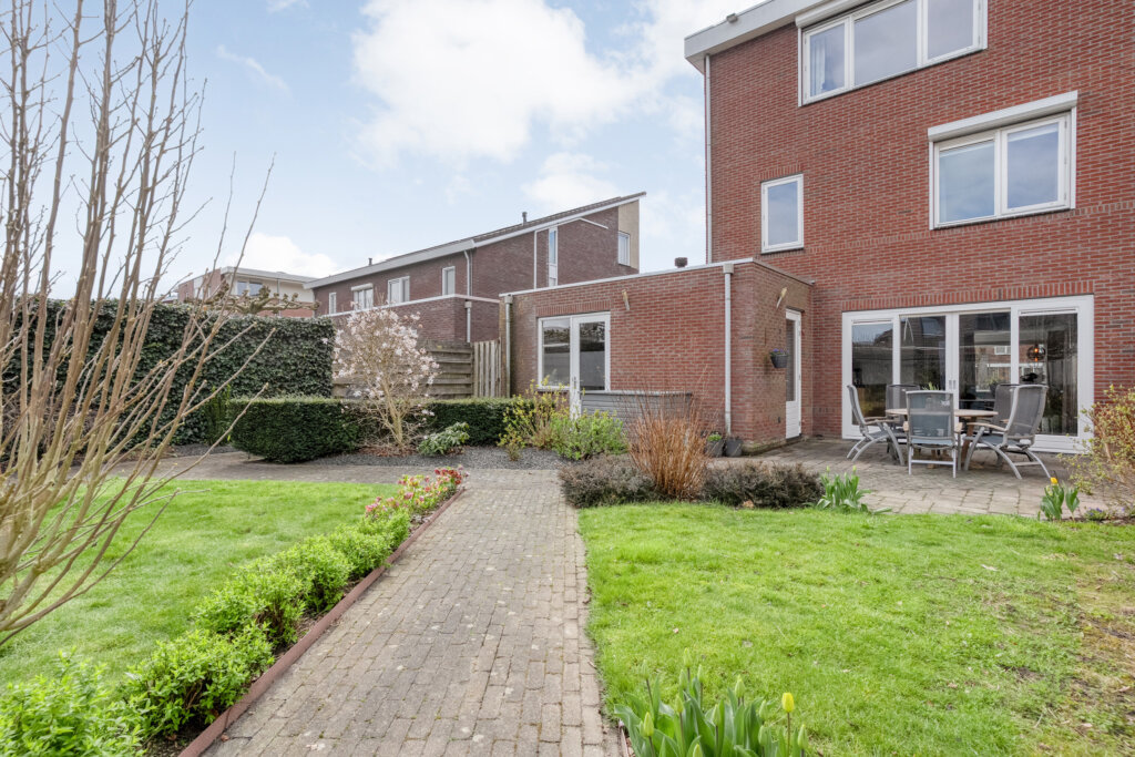 De ruime en fraai aangelegde achtertuin is gericht op het noordoosten. De tuin, met meerdere zitplekken, biedt je de ruimte om de zon of schaduw op te zoeken. Achterin de tuin staat een tuinhuisje, een plek om het tuingereedschap op te bergen. De tuin is ook via een zij-ingang naast de garage toegankelijk. Aan de voorzijde van de woning is op de oprit ruimte om gemakkelijk twee auto’s te parkeren.