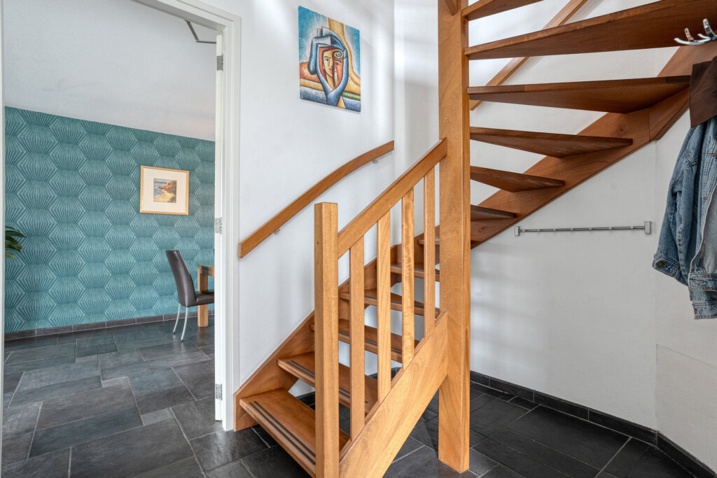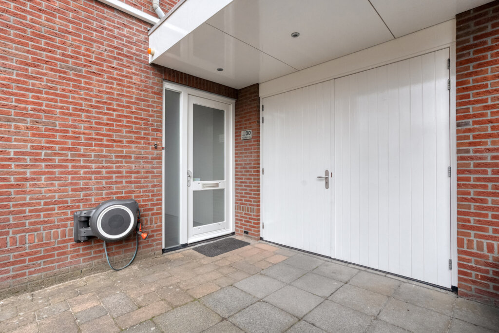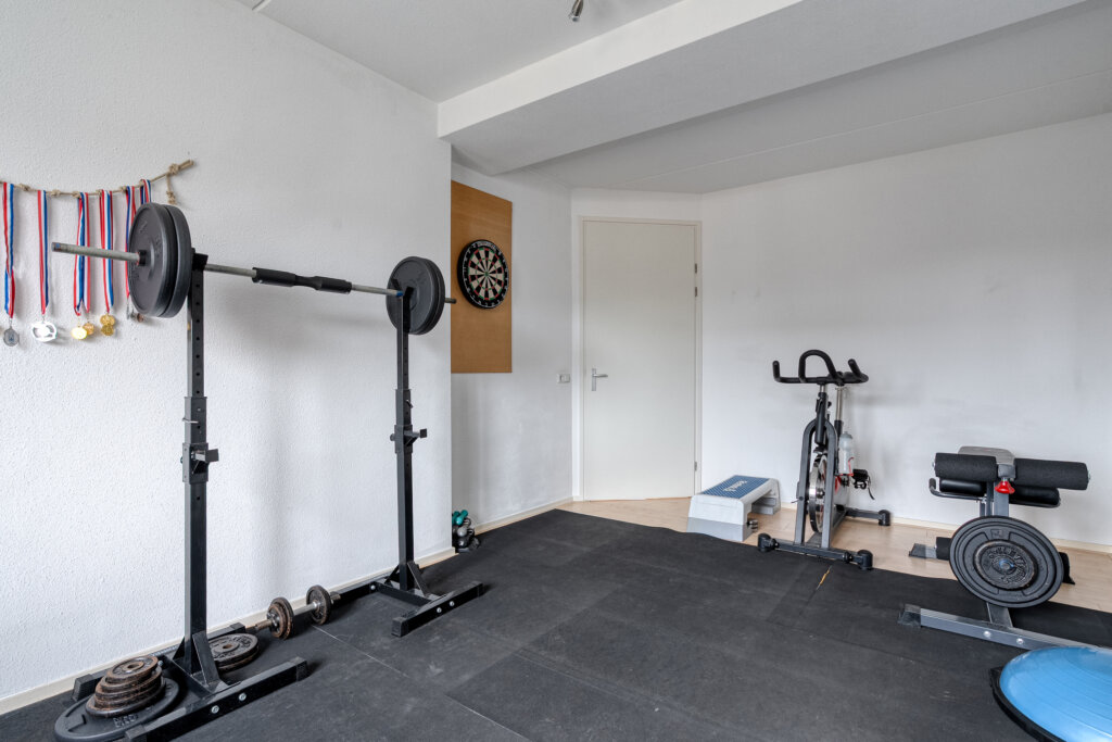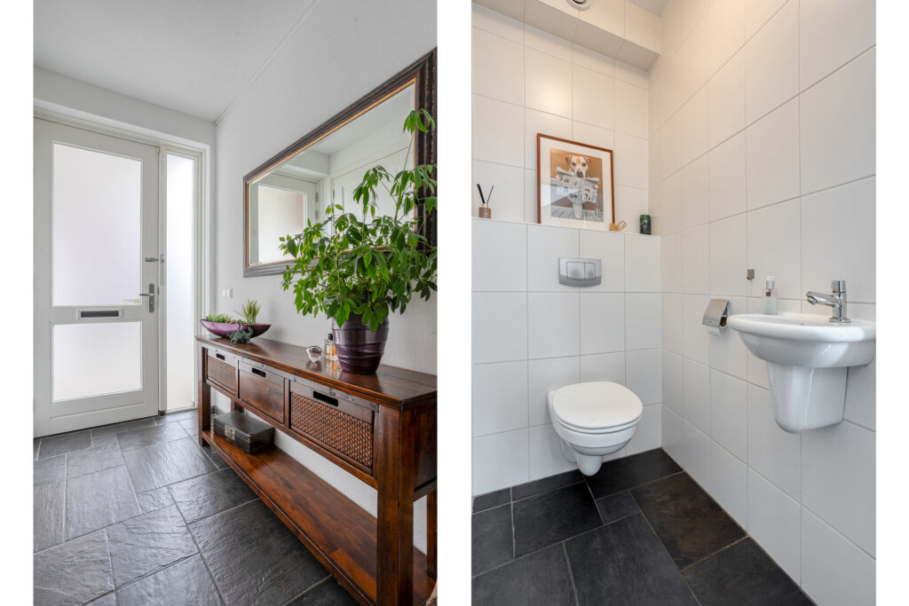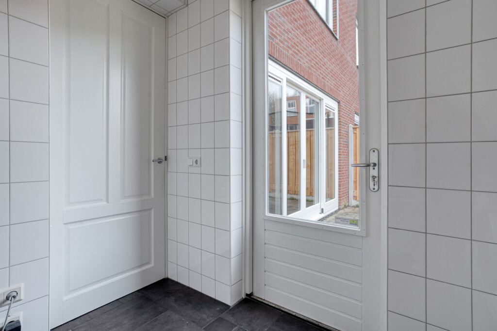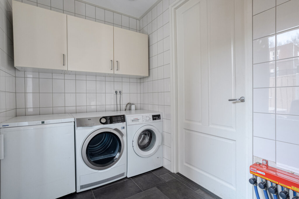 Vanuit de keuken is er toegang tot de bijkeuken, waar ruimte is voor de wasmachine, droger en eventueel een vriezer. Ook bevindt zich hier de cv-installatie (2025) en de vloerverwarmingsverdeler. Via de bijkeuken heb je toegang tot de tuin en de garage. De garage is geïsoleerd en voorzien van vloerverwarming, water en elektra, wat de garage ook geschikt maakt als extra (werk)kamer. De garage heeft twee openslaande houten deuren en is voorzien van voldoende daglicht door het raam en de deur aan de achterzijde.