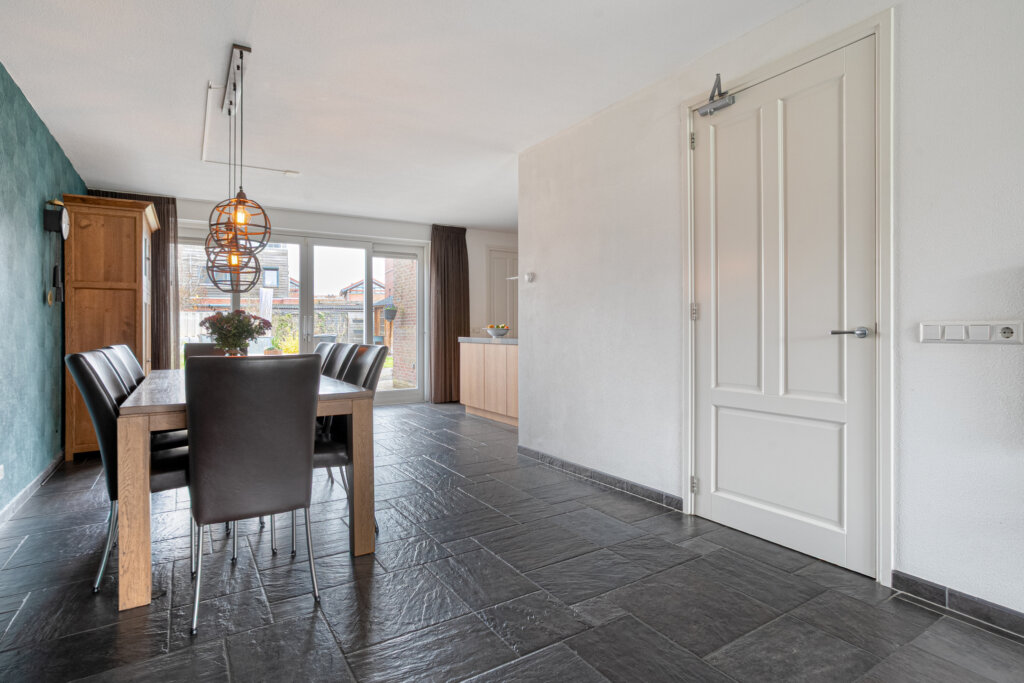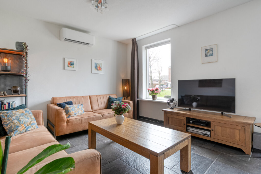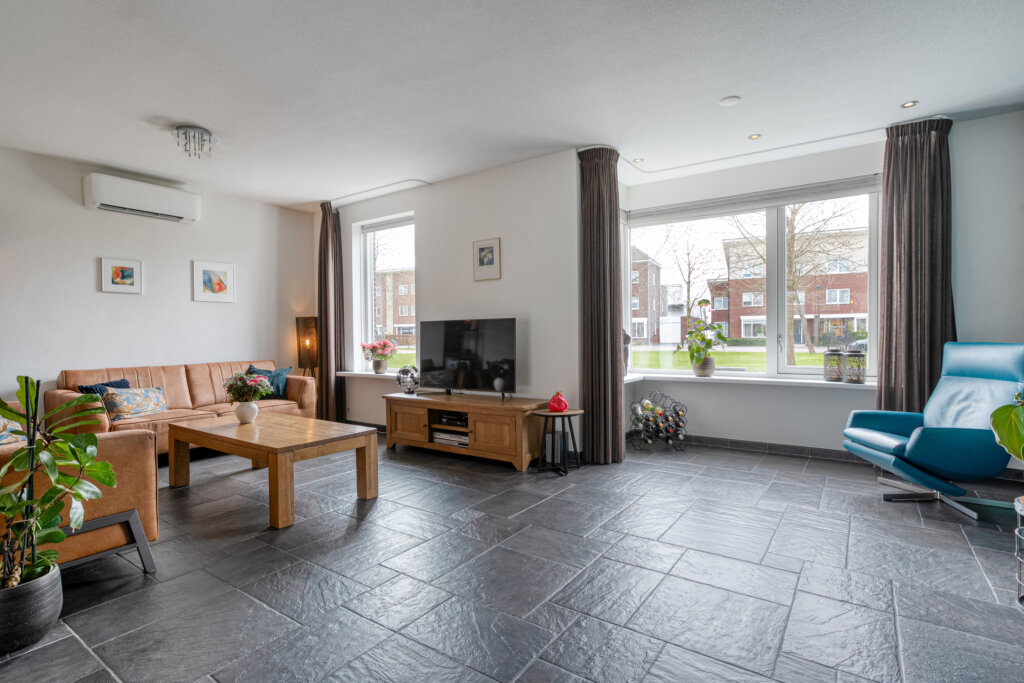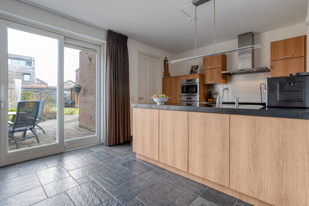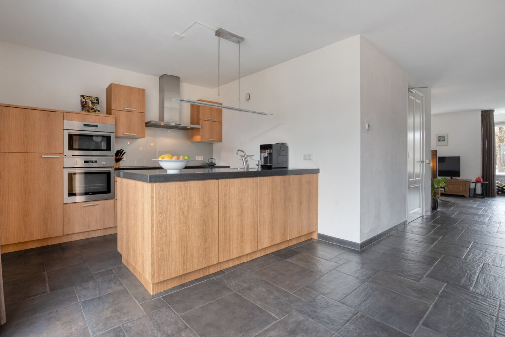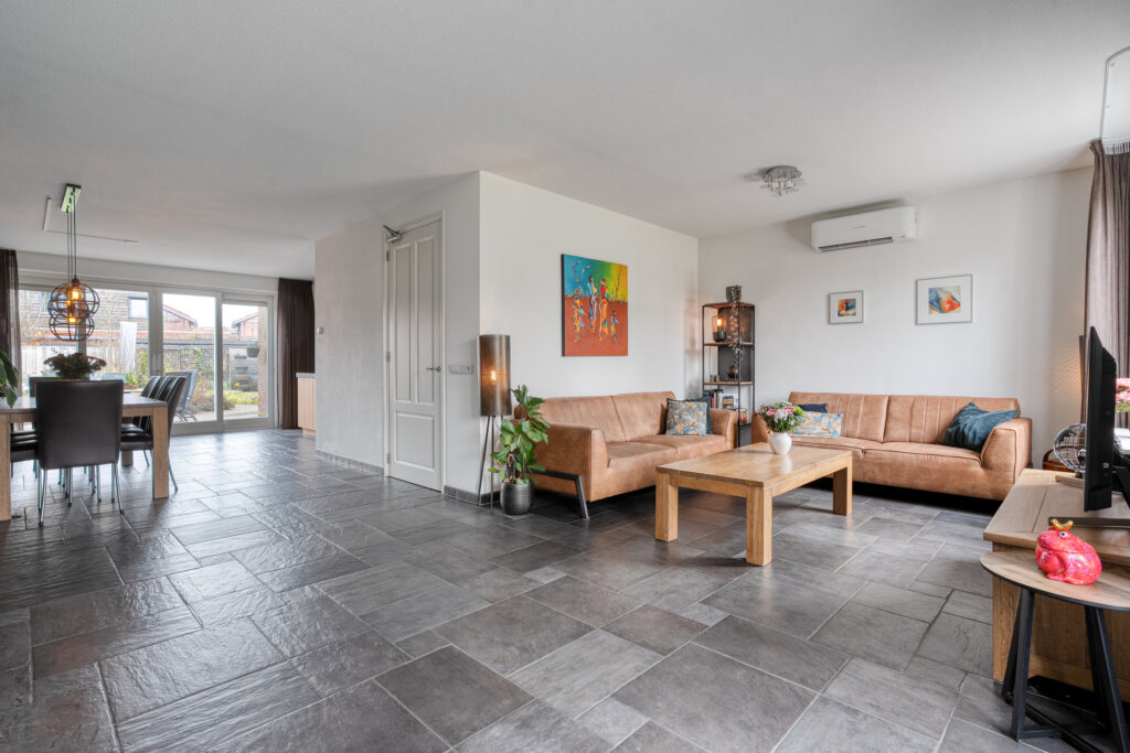Via de entree kom je binnen in de ruime hal. Hier bevinden zich het toilet, de meterkast, de garderobe, de trapopgang en de toegang tot de leefruimte. De U-vormige leefruimte biedt aan de voorzijde een heerlijk zitgedeelte, voorzien van airconditioning, waarbij er voldoende ruimte is om een hoekbank en fauteuils neer te zetten. Het zitgedeelte loopt mooi over naar achteren, naar het eetgedeelte en de leefkeuken. Via de schuifdeuren aan de achterzijde is er directe toegang tot de tuin. De leefkeuken met schiereiland is voorzien van een inductiekookplaat (2018), vaatwasser (2022), koelkast, oven en magnetron.