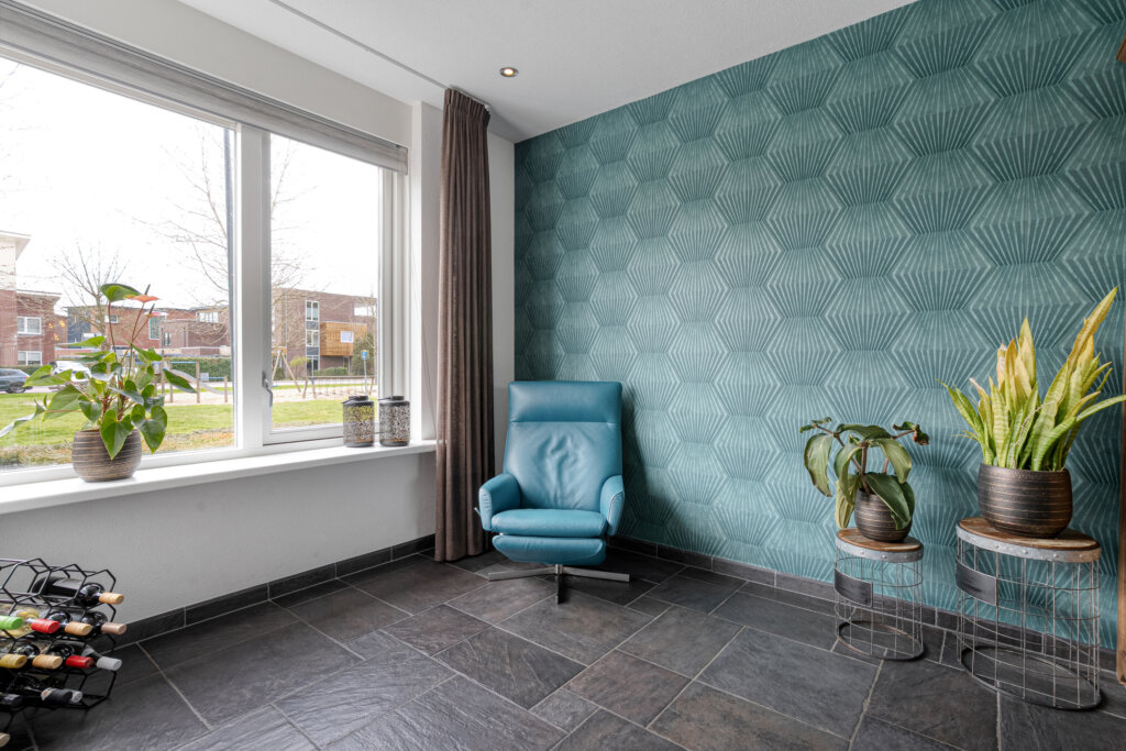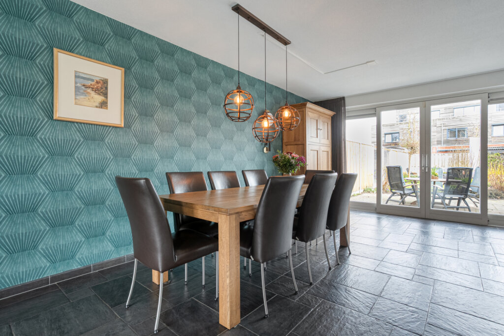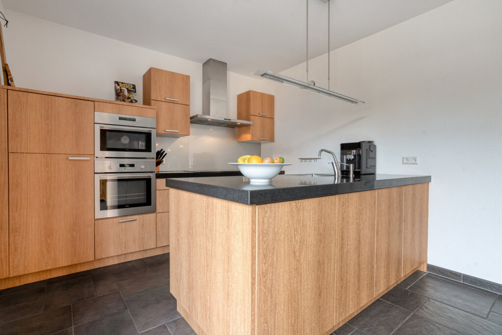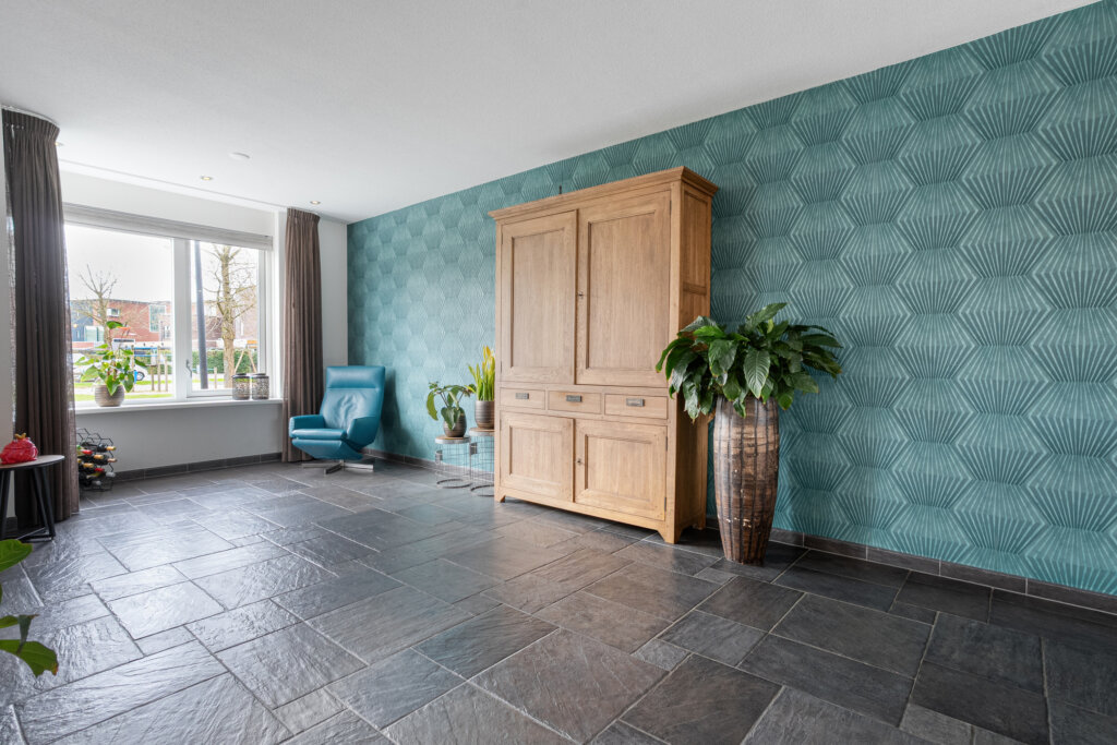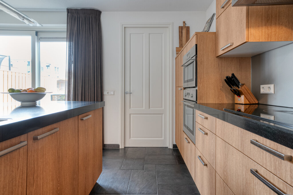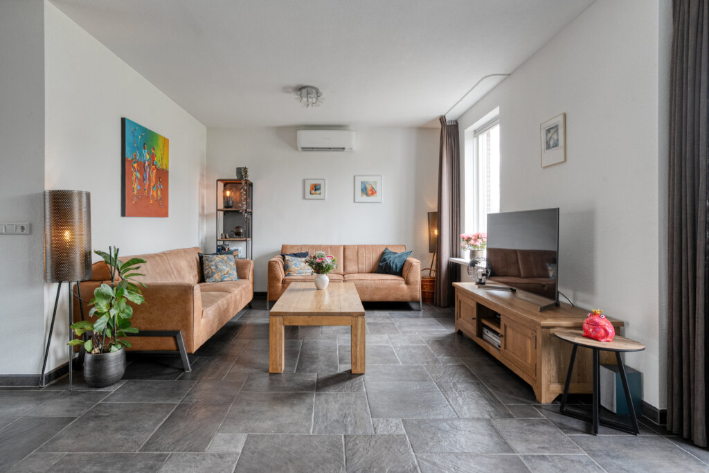 Via de entree kom je binnen in de ruime hal. Hier bevinden zich het toilet, de meterkast, de garderobe, de trapopgang en de toegang tot de leefruimte. De U-vormige leefruimte biedt aan de voorzijde een heerlijk zitgedeelte, voorzien van airconditioning, waarbij er voldoende ruimte is om een hoekbank en fauteuils neer te zetten. Het zitgedeelte loopt mooi over naar achteren, naar het eetgedeelte en de leefkeuken. Via de schuifdeuren aan de achterzijde is er directe toegang tot de tuin. De leefkeuken met schiereiland is voorzien van een inductiekookplaat (2018), vaatwasser (2022), koelkast, oven en magnetron.