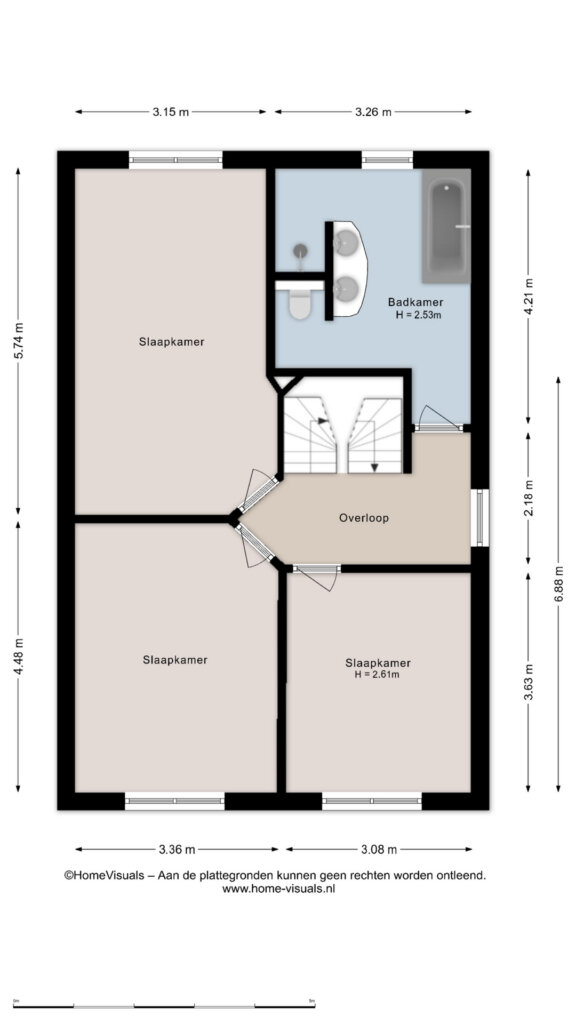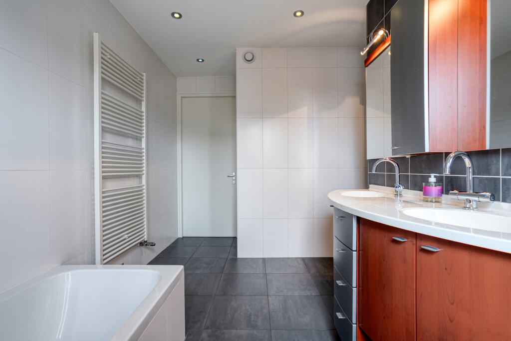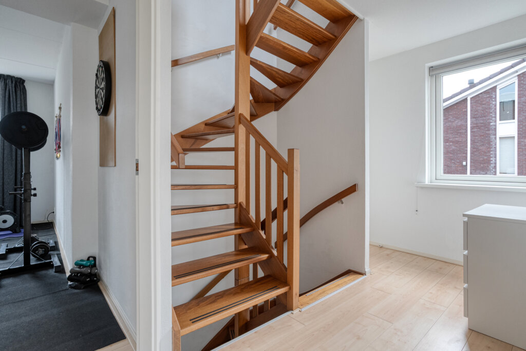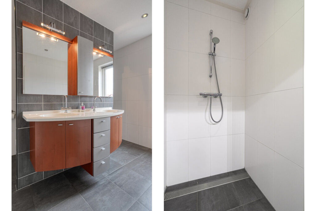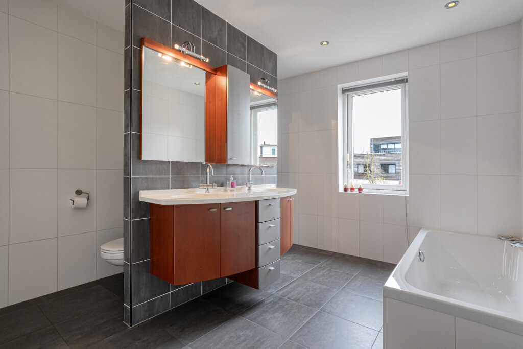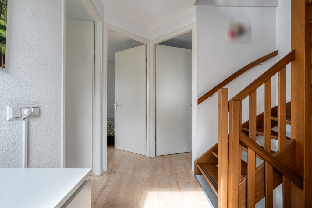 Vanuit de ruime overloop heb je toegang tot de drie slaapkamers, de badkamer en de trapopgang naar de tweede verdieping. De grootste slaapkamer bevindt zich aan de achterzijde van de woning, terwijl de andere twee slaapkamers aan de voorzijde liggen. De badkamer, gelegen aan de achterzijde, is voorzien van een inloopdouche, ligbad, toilet en een dubbele wastafelmeubel. Alle ramen op deze verdieping zijn voorzien van rolluiken.