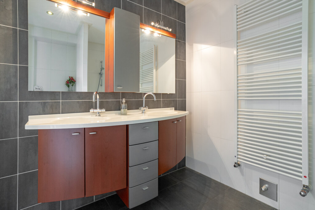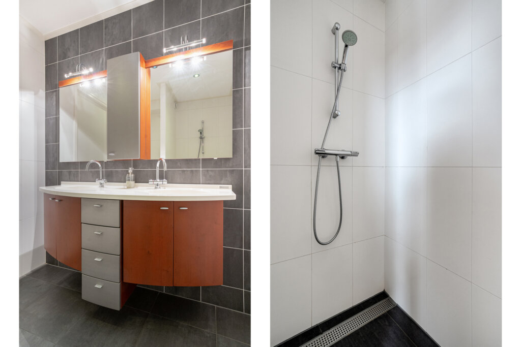 Via een vaste trap bereik je de tweede verdieping met een ruime overloop. Hier bevinden zich nog eens twee slaapkamers, de tweede badkamer, een berging en het dakterras. De grootste slaapkamer aan de achterzijde is voorzien van een walk-in closet en airconditioning. De badkamer is voorzien van een inloopdouche, toilet en een dubbele wastafelmeubel. Aan de voorzijde bevindt zich de andere slaapkamer. Vanuit de overloop, voorzien van airconditioning, heb je toegang tot het zonneterras. Een heerlijke plek buiten, gericht op het zuidwesten. Ook op deze verdieping zijn alle ramen en deuren voorzien van rolluiken.