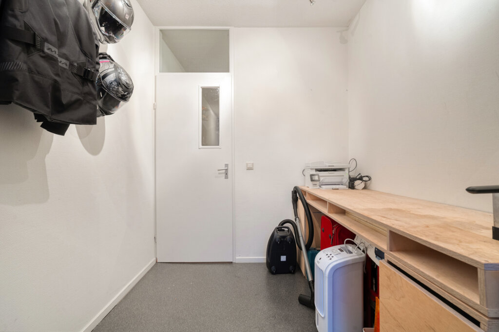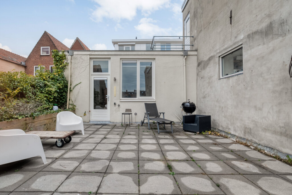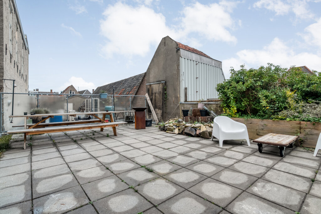 Via de multifunctioneel ruimte aan het einde van de hal, momenteel in gebruik als werkkamer, bereik je het riante dakterras. Een fijne plek om buiten te zitten midden in de binnenstad, met volop privacy en rust.