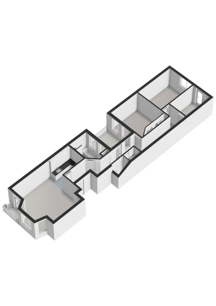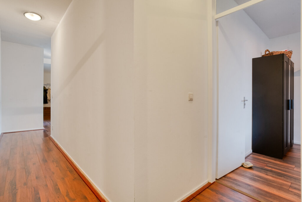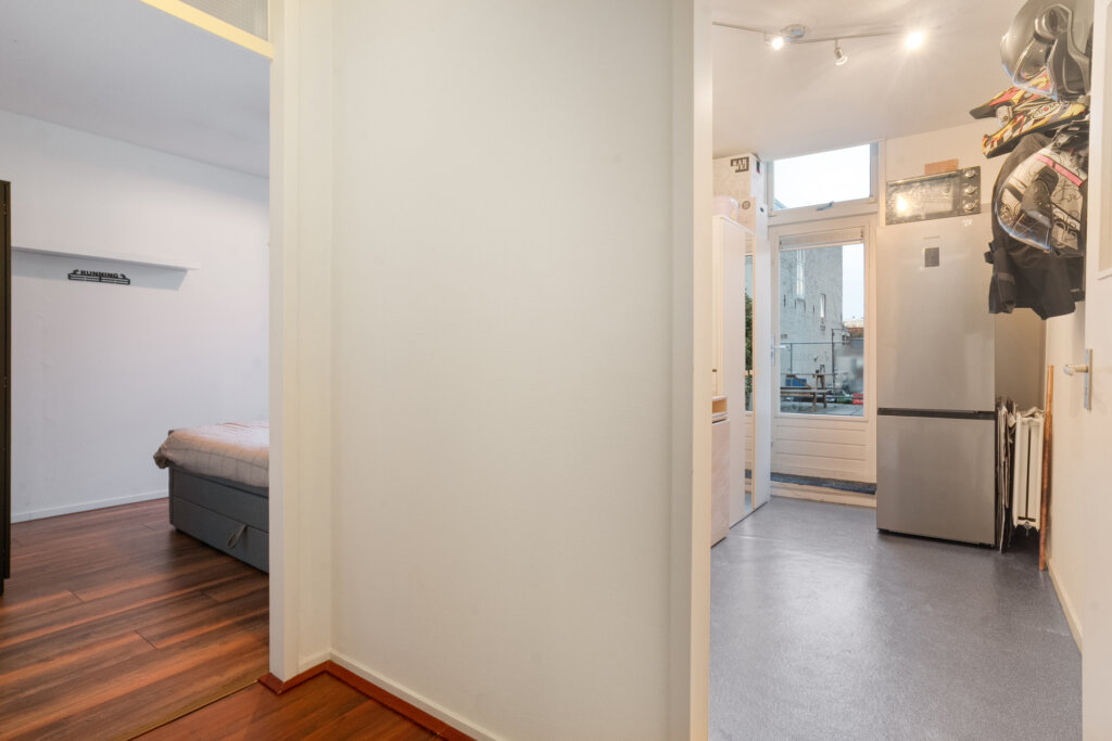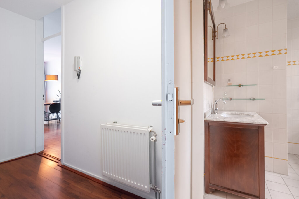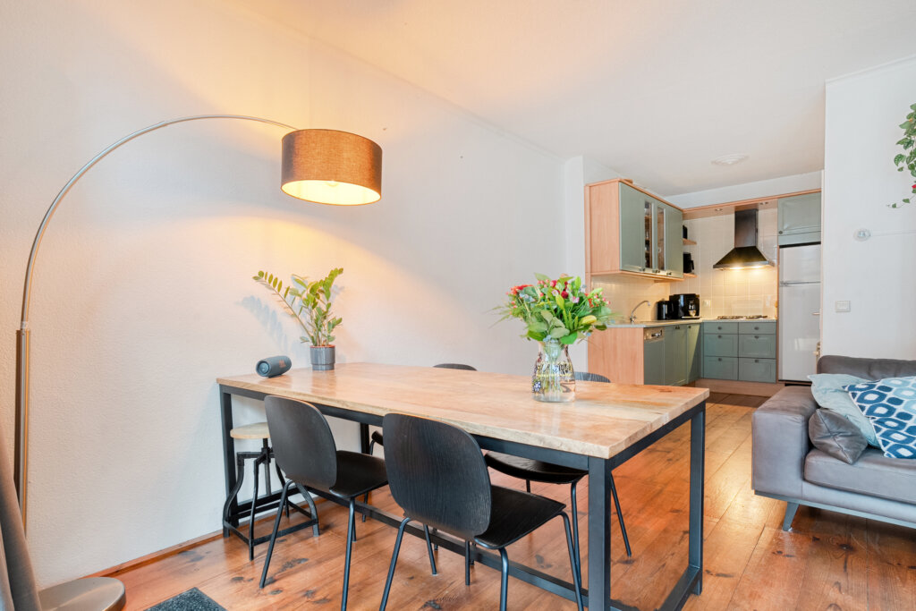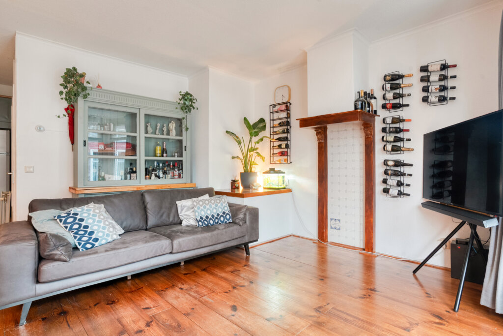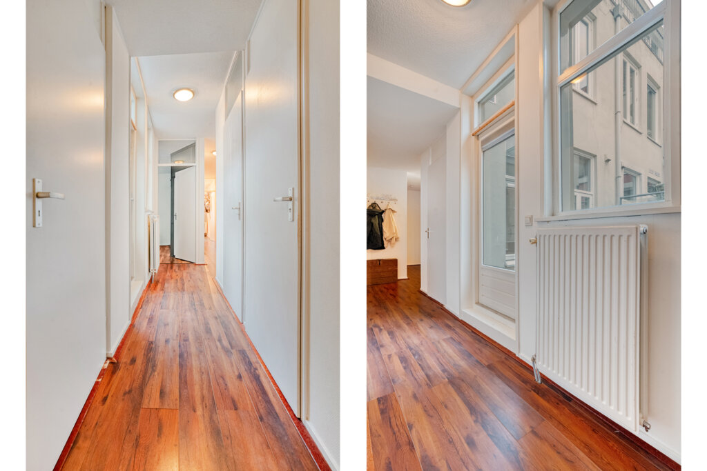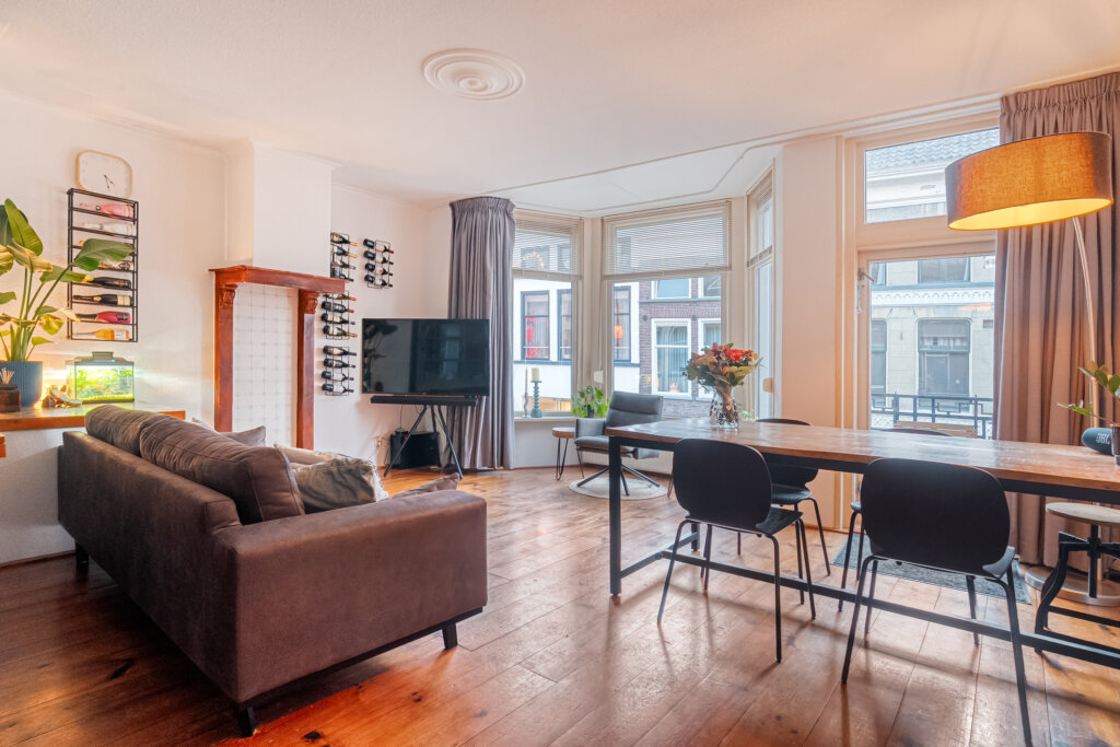 De woonkamer bevindt zich aan de voorzijde van het appartement. De erker brengt extra ruimte en veel daglicht naar binnen, met een brede blik over de winkelstraat. Vanuit de woonkamer heb je toegang tot het balkon, waar je heerlijk kunt genieten van de reuring op de winkelstraat.