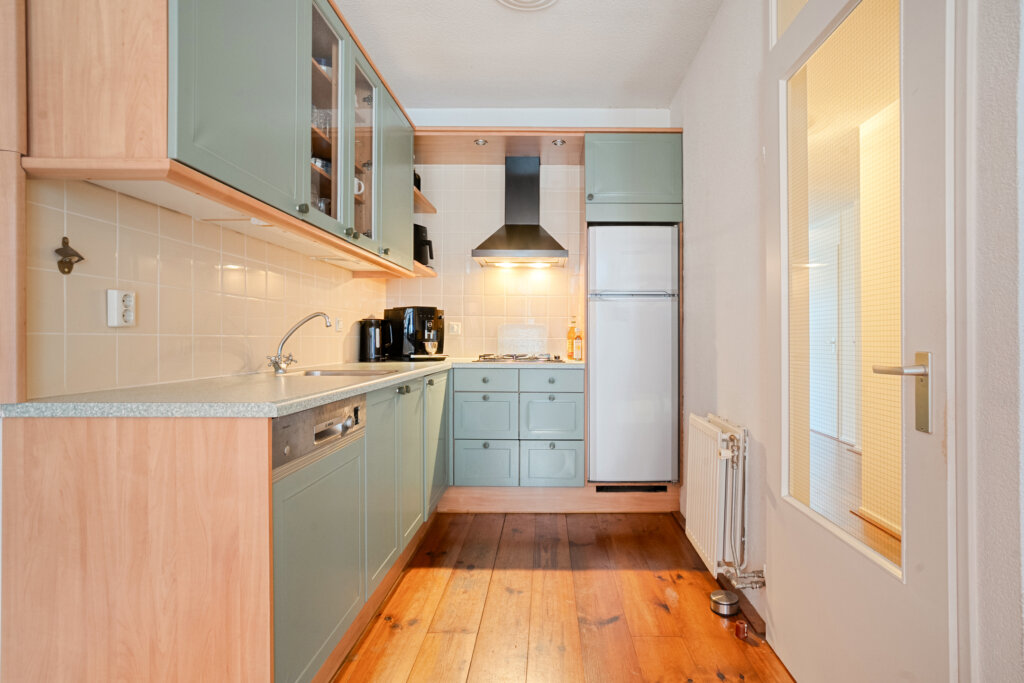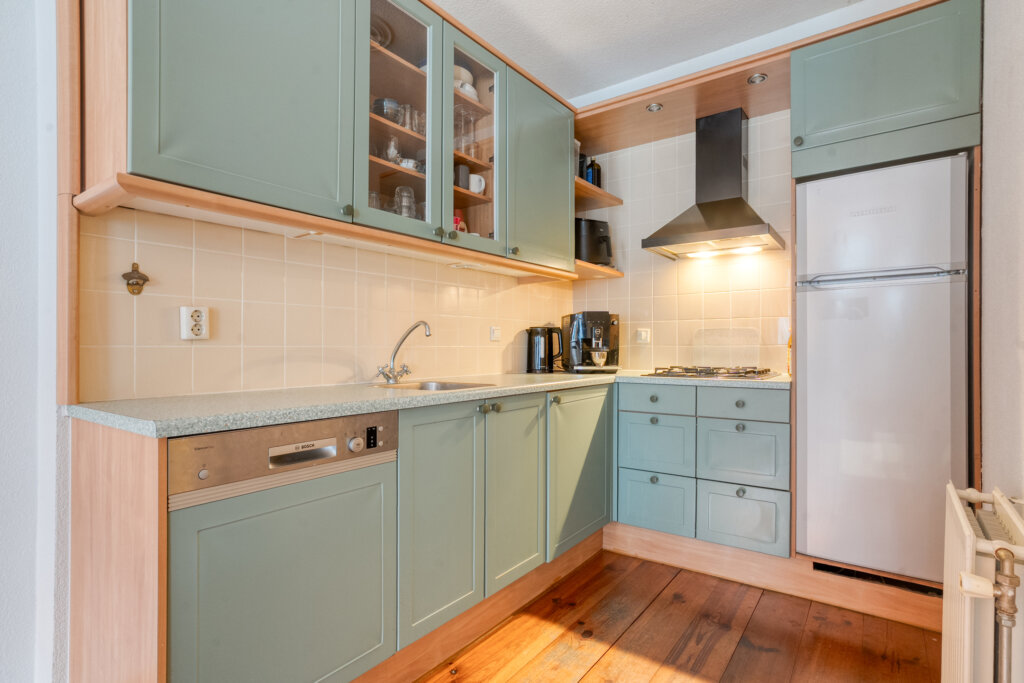 De keuken is praktisch ingericht en voorzien van een vaatwasser, 4-pits gaskookplaat met afzuiger en een koel-vriescombinatie.