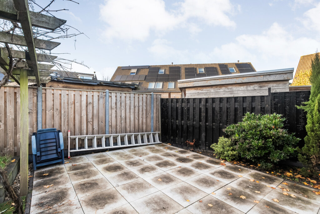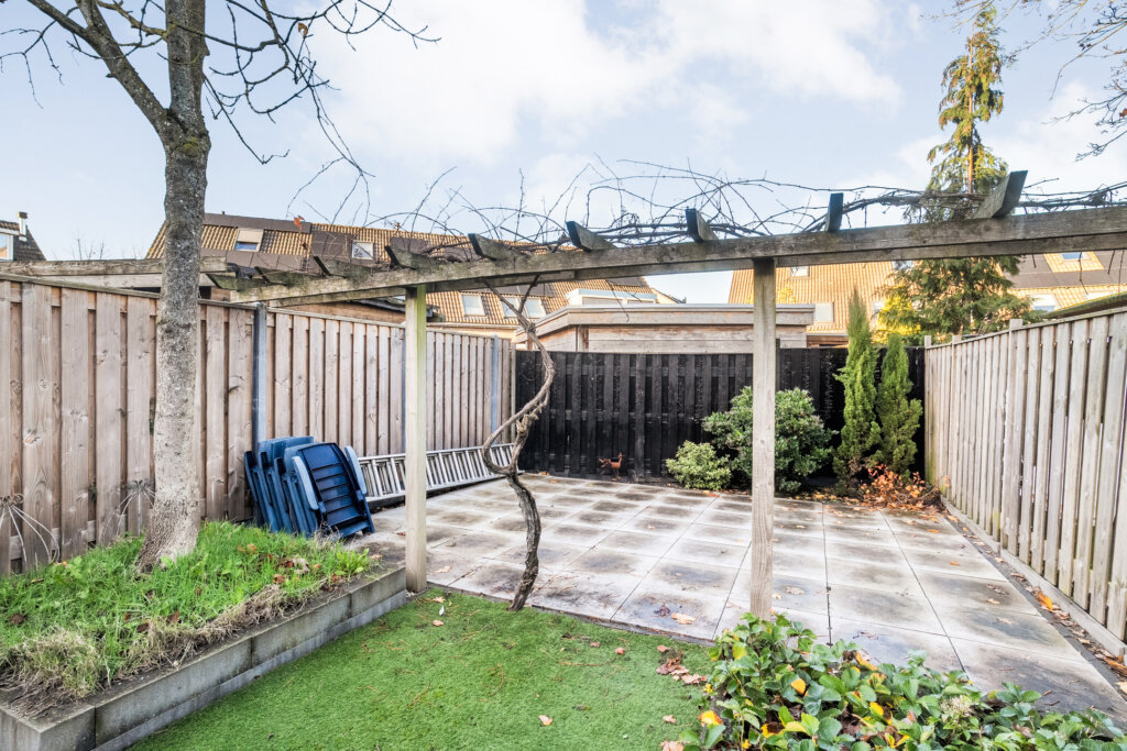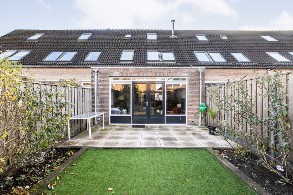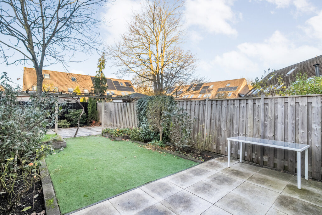 De achtertuin is heerlijk diep en onderhoudsvriendelijk ingedeeld met een ruim terras, kunstgras en groen rondom. Hier heb je volop ruimte om te genieten van het buitenleven.