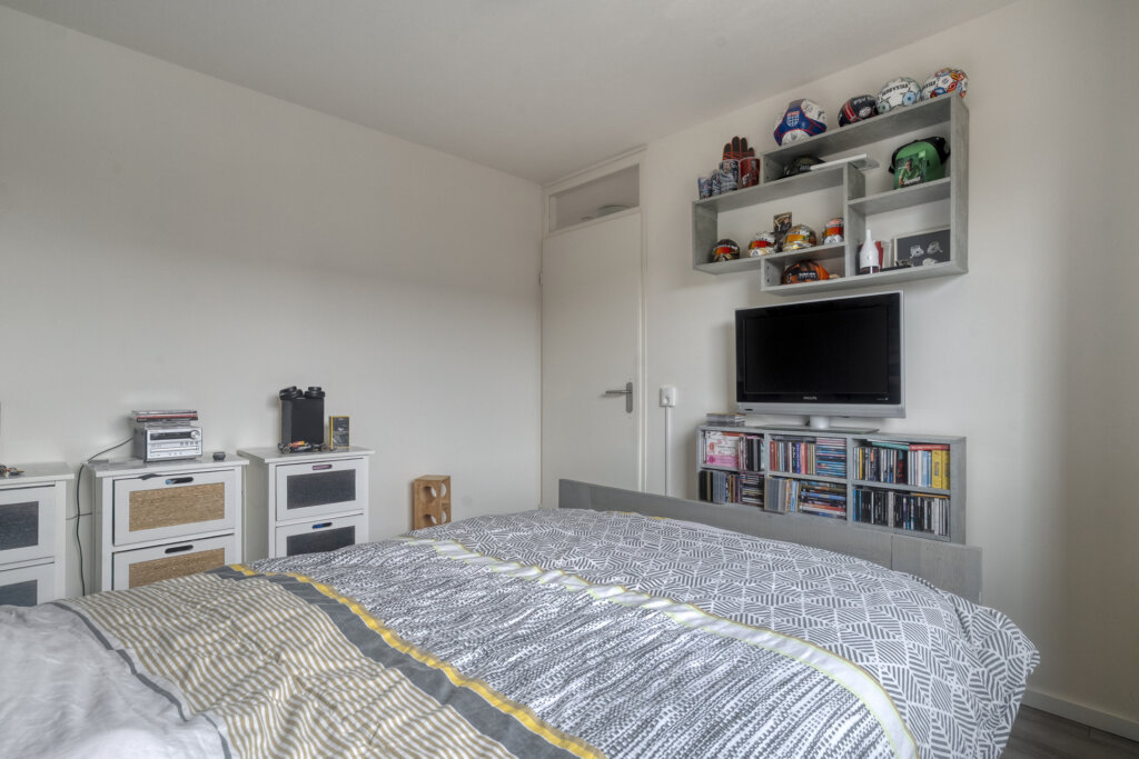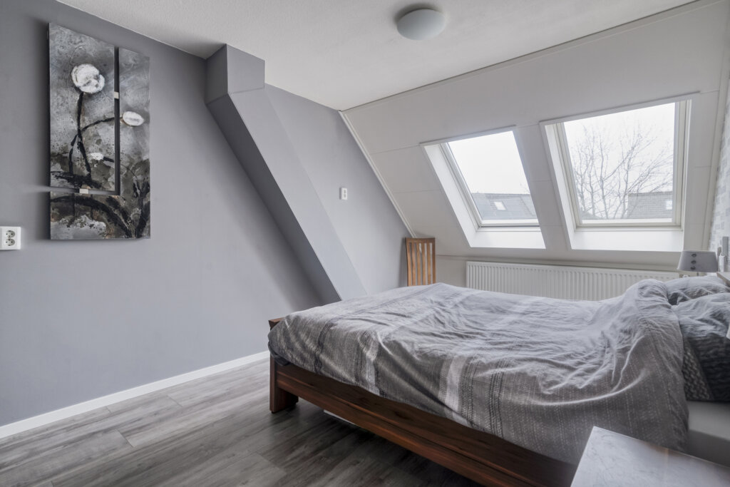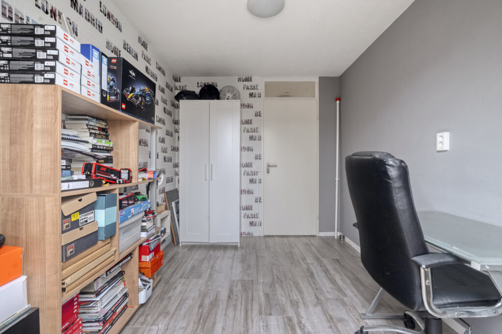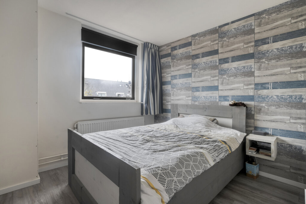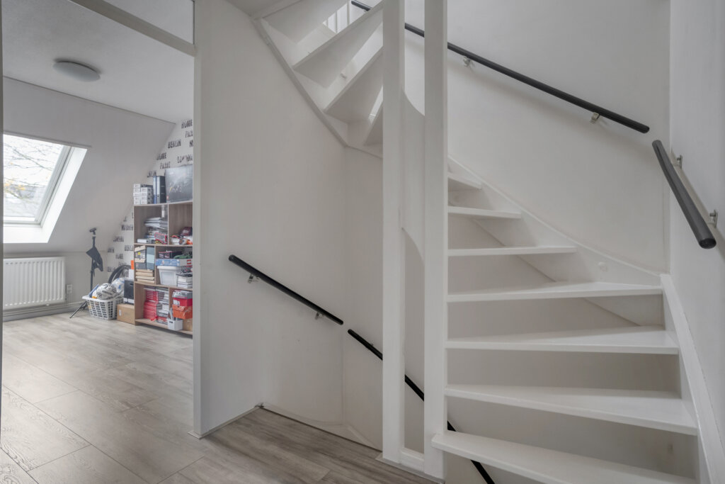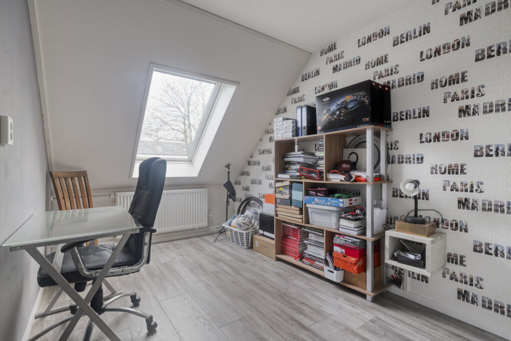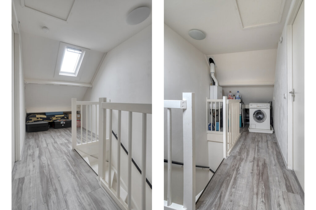 Op de tweede verdieping bevindt zich een overloop met aansluitingen voor de wasmachine en de CV-installatie. Daarnaast is er een vierde royale slaapkamer met groot dakraam en extra bergruimte achter de knieschotten. Een fijne, volwaardige verdieping die multifunctioneel gebruikt kan worden.