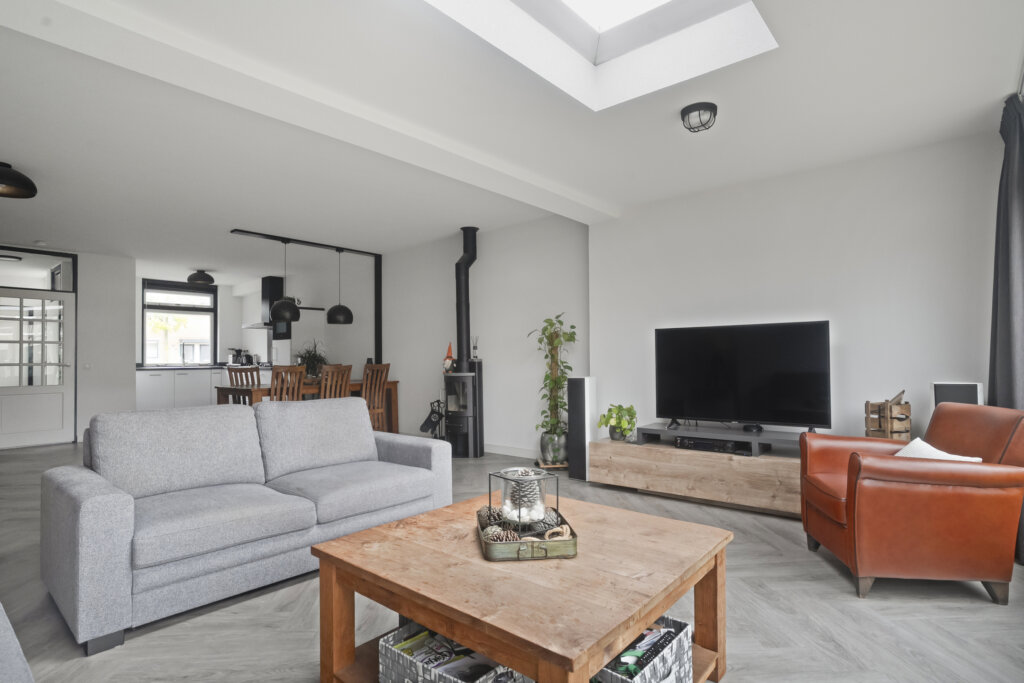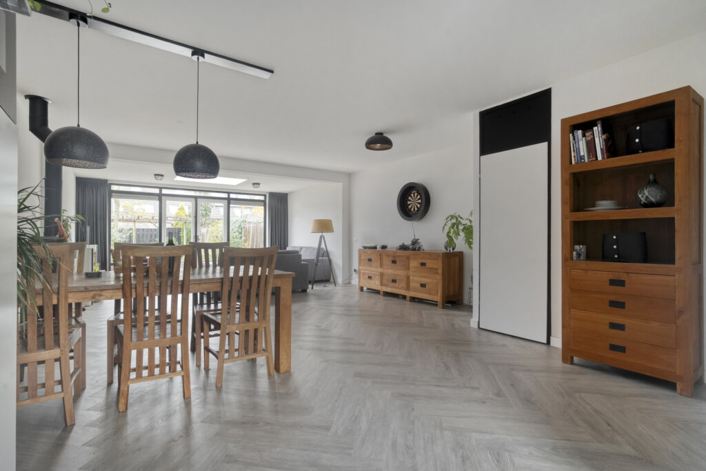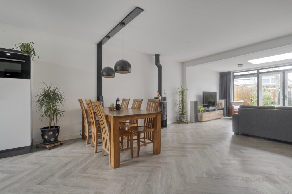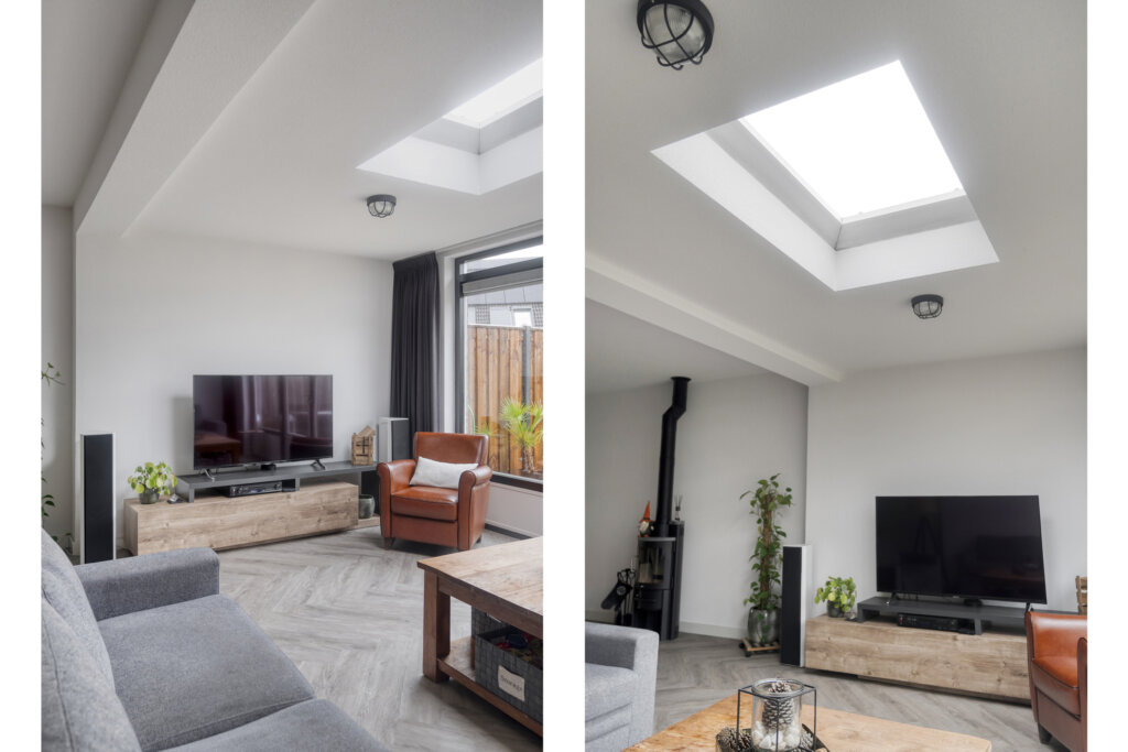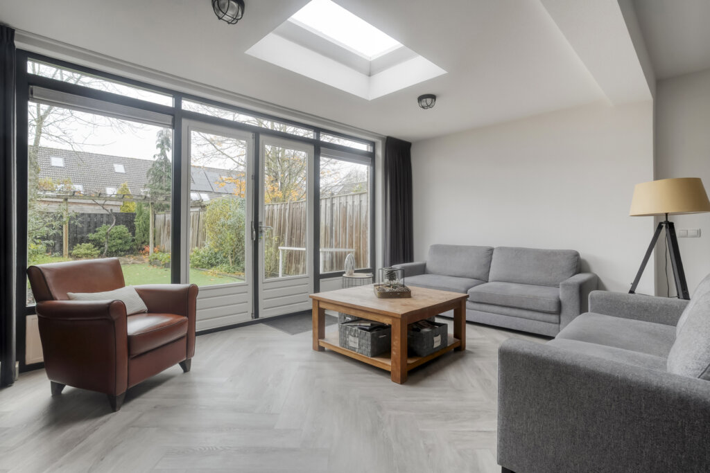 Aan de achterzijde bevindt zich het zitgedeelte. De woning is aan de achterzijde uitgebouwd, waardoor er een verrassend ruim leefgedeelte is ontstaan met grote glaspartijen en een royale lichtkoepel voor optimaal daglicht dat in 2021 van binnen volledig is vernieuwd. Via de openslaande deuren heb je toegang tot de heerlijke ruime tuin.