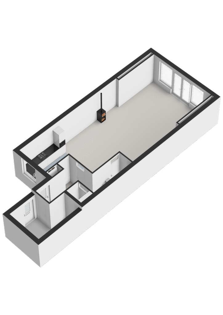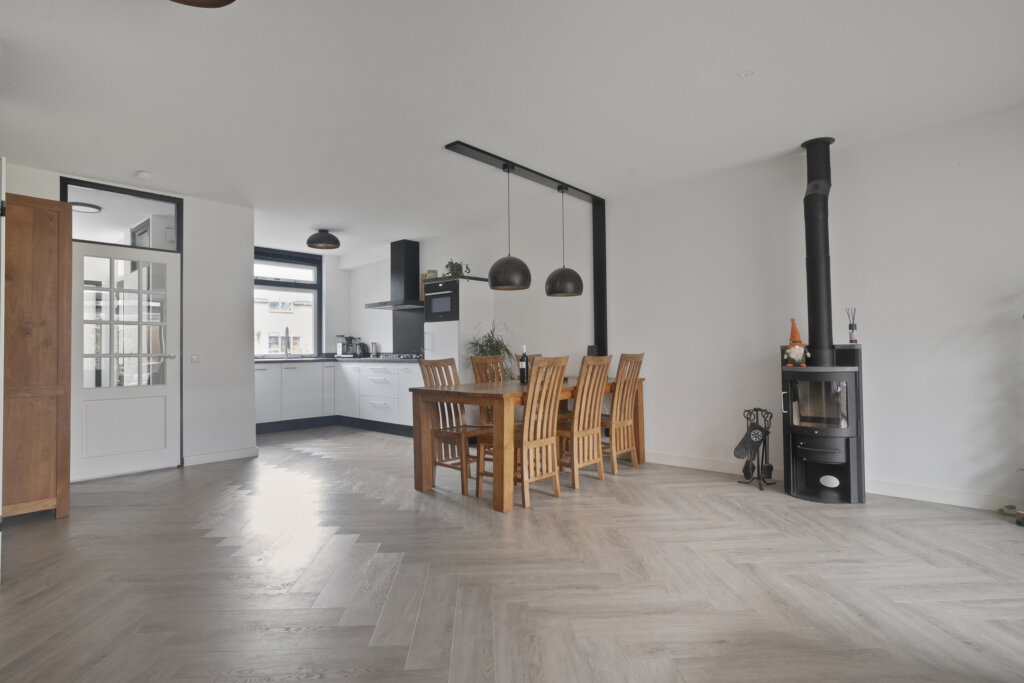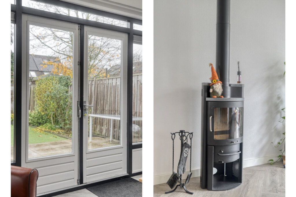 Tussen de keuken en de woonkamer staat een sfeervolle houtkachel. Daarnaast beschikt de woonkamer over een praktische voorraadkast.