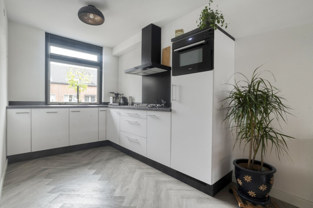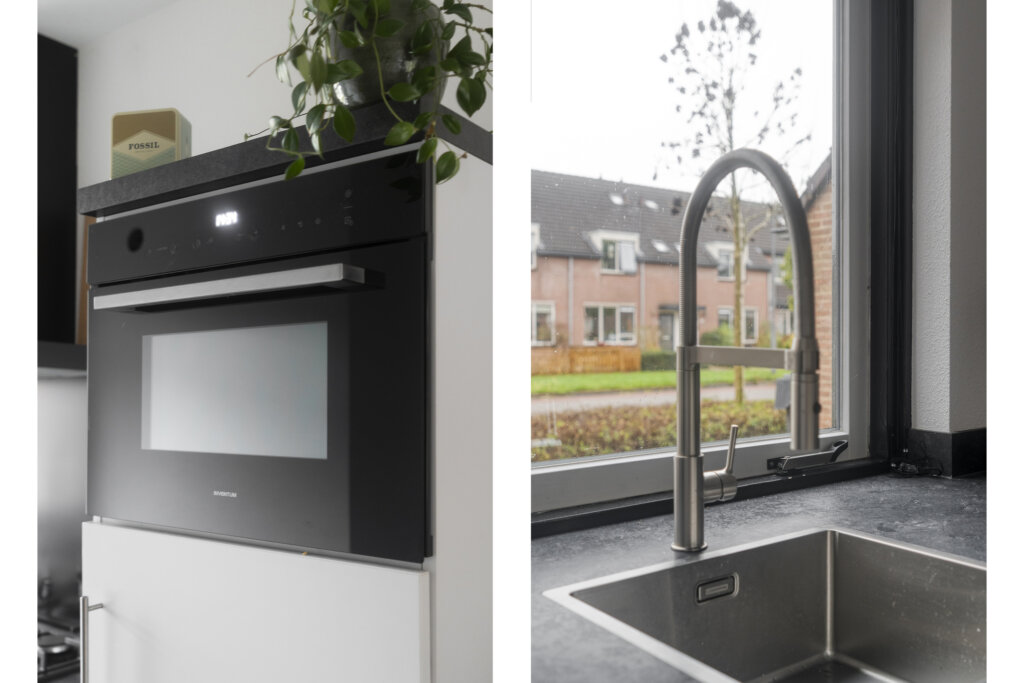 De moderne open keuken ligt aan de voorzijde van de woning en is strak afgewerkt. Deze is uitgerust met diverse inbouwapparatuur, waaronder een combi-oven/magnetron, vaatwasser, gaskookplaat en koel-/vriescombinatie. De keuken gaat naadloos over in de woonkamer, waardoor het geheel één gezellige en verbonden leefruimte vormt.