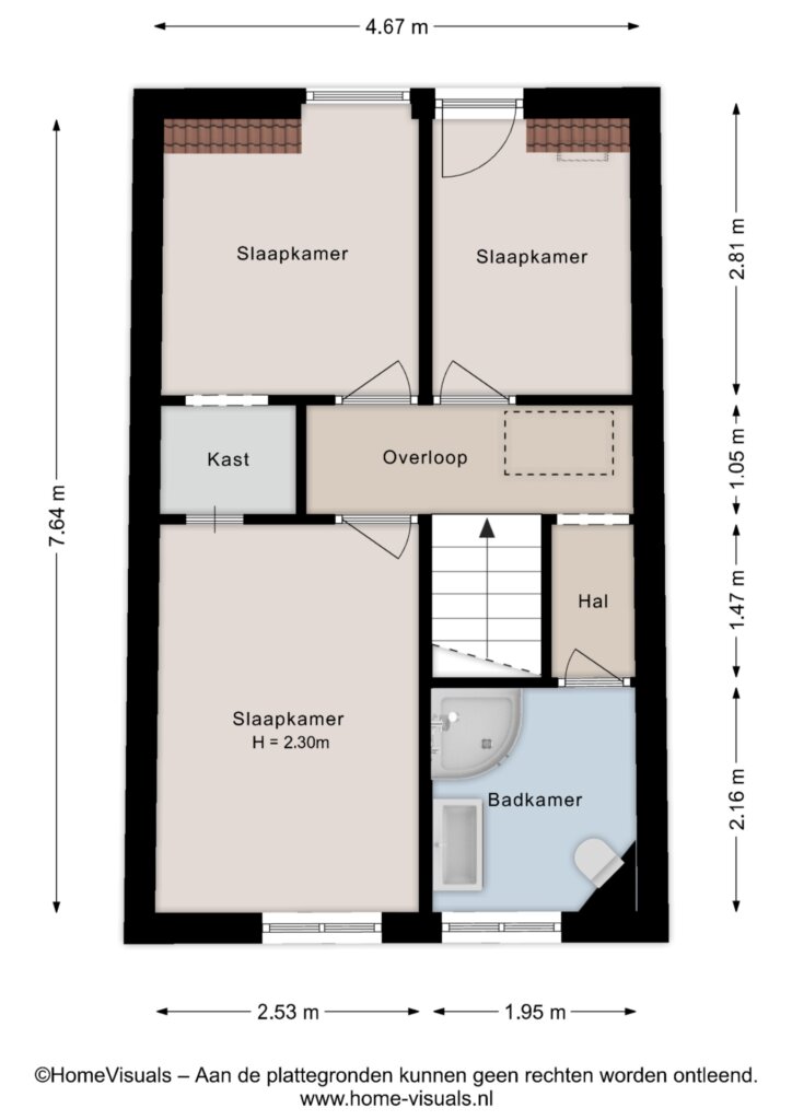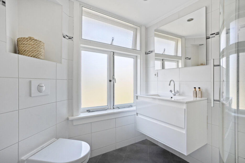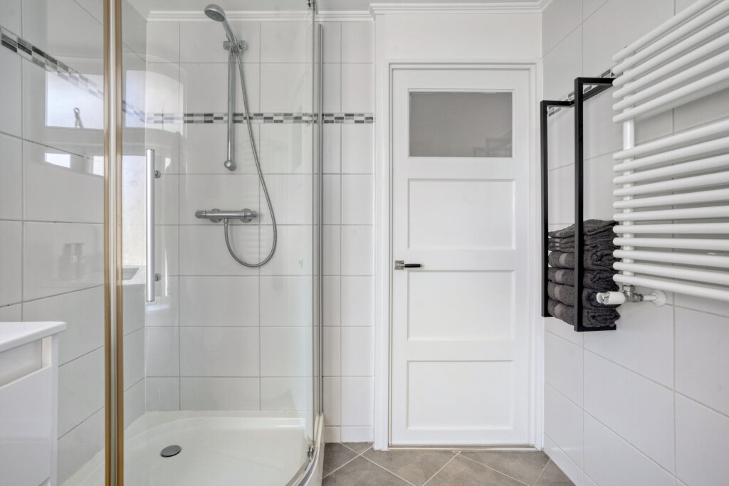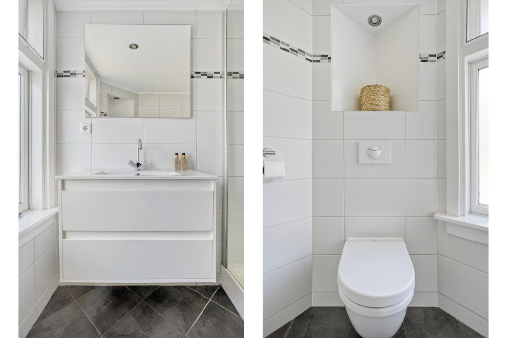 De eerste verdieping beschikt over drie slaapkamers en badkamer met tweede toilet. Eén royale slaapkamer aan de voorzijde met vaste kast, en twee slaapkamers aan de achterzijde. Deze zijn ideaal als kinderkamer, logeerkamer of thuiskantoor. Via de vlisotrap bereik je de ruime vliering waar zich de technische ruimte bevind. Het is mogelijk om een vaste trap te plaatsen, hier zal een slaapkamer voor opgeofferd moeten worden maar krijg je een prachtige ruimte voor terug. De badkamer met tweede toilet is voorzien van een wastafel en een douchehoek en inbouwspots.