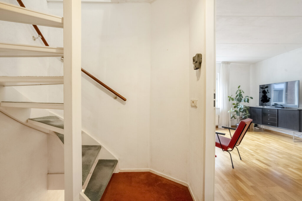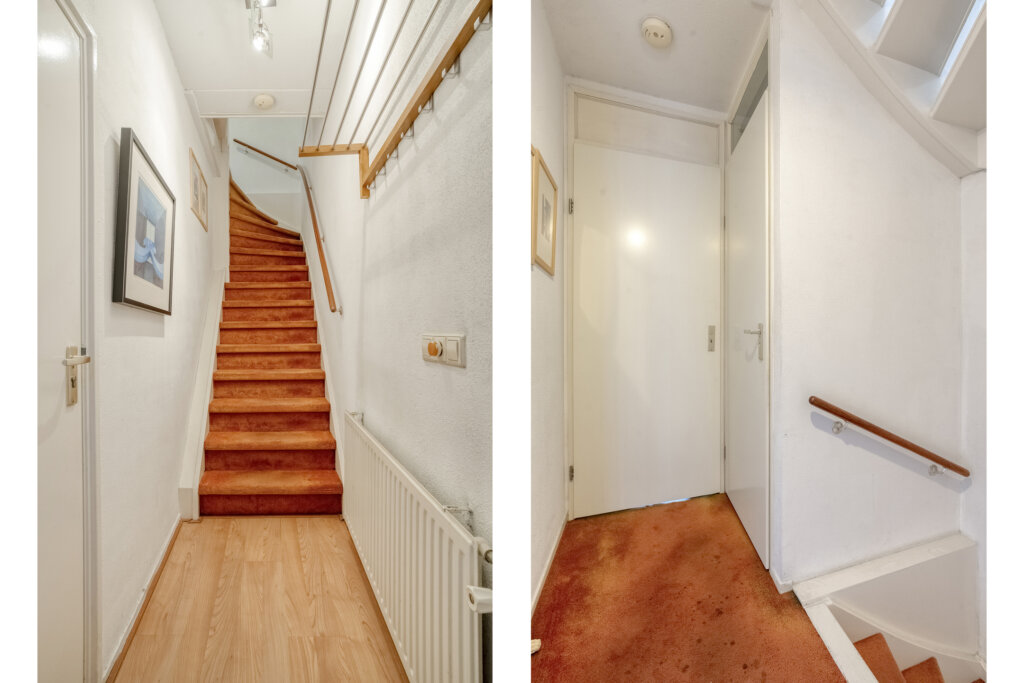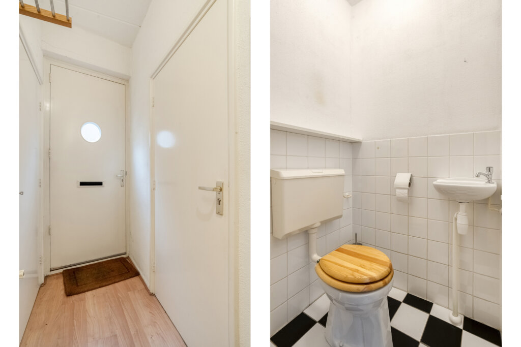 Vanuit de hal heb je toegang tot het woongedeelte, de bijkeuken, het toilet en de trapopgang naar de tweede woonlaag.