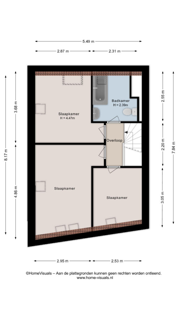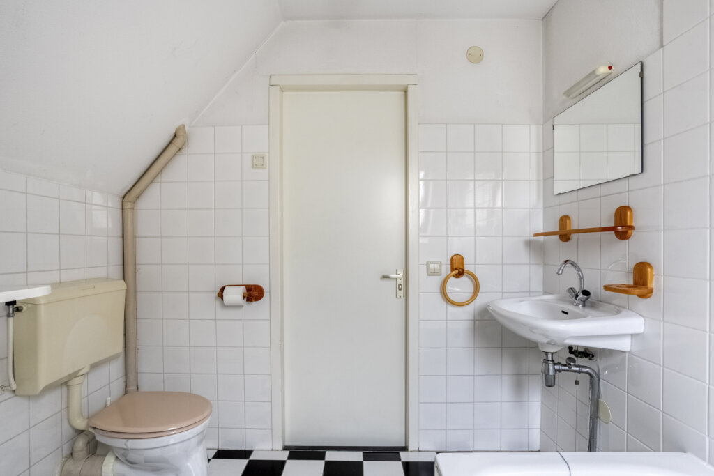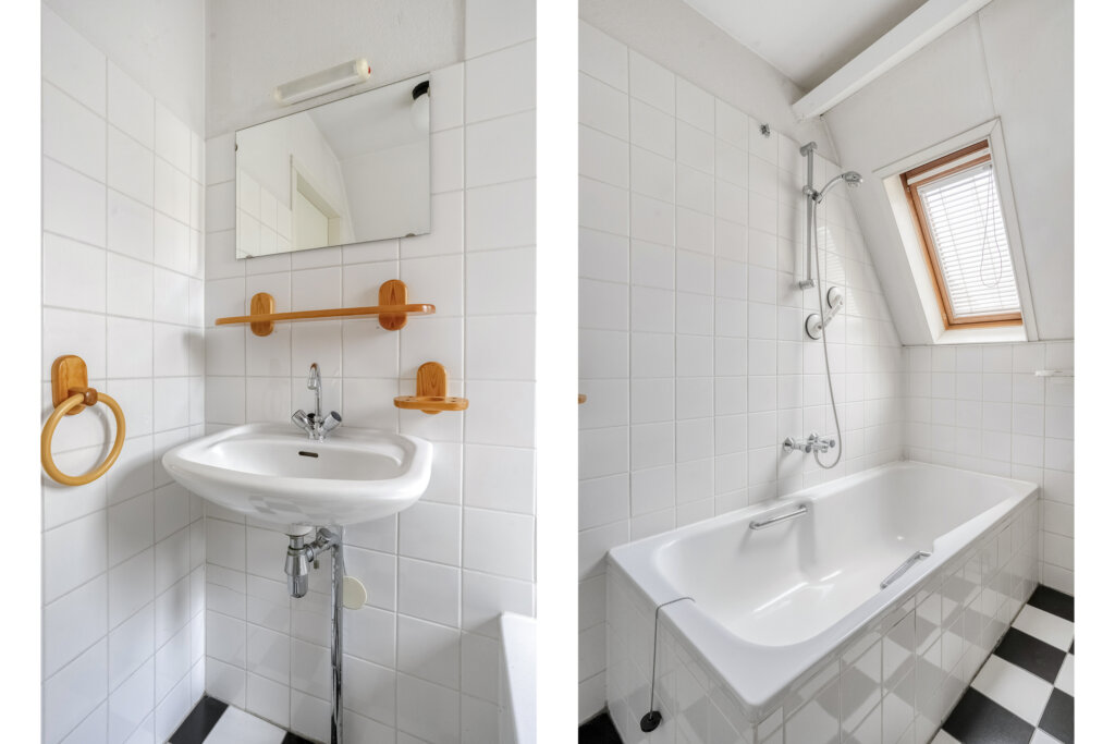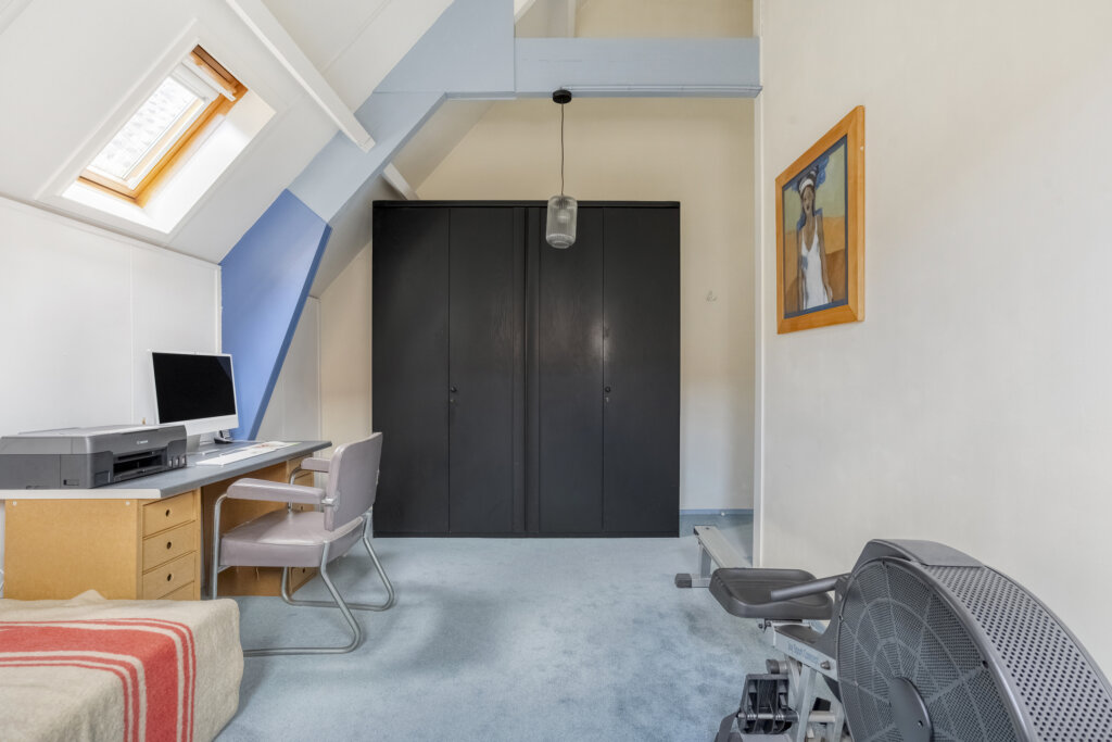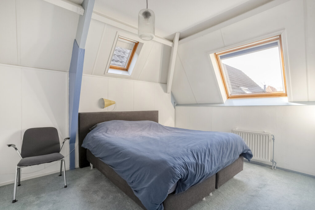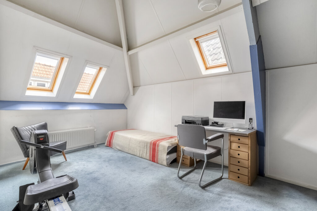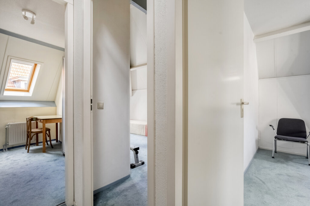 De tweede woonlaag is ingedeeld met drie kamers, die geschikt zijn als slaapkamer, werkkamer of hobbyruimte. Ook bevindt zich hier de badkamer, voorzien van een ligbad met douche, toilet en wastafel. Door het hoge plafond en de dakramen voelt deze woonlaag ruim en licht aan.