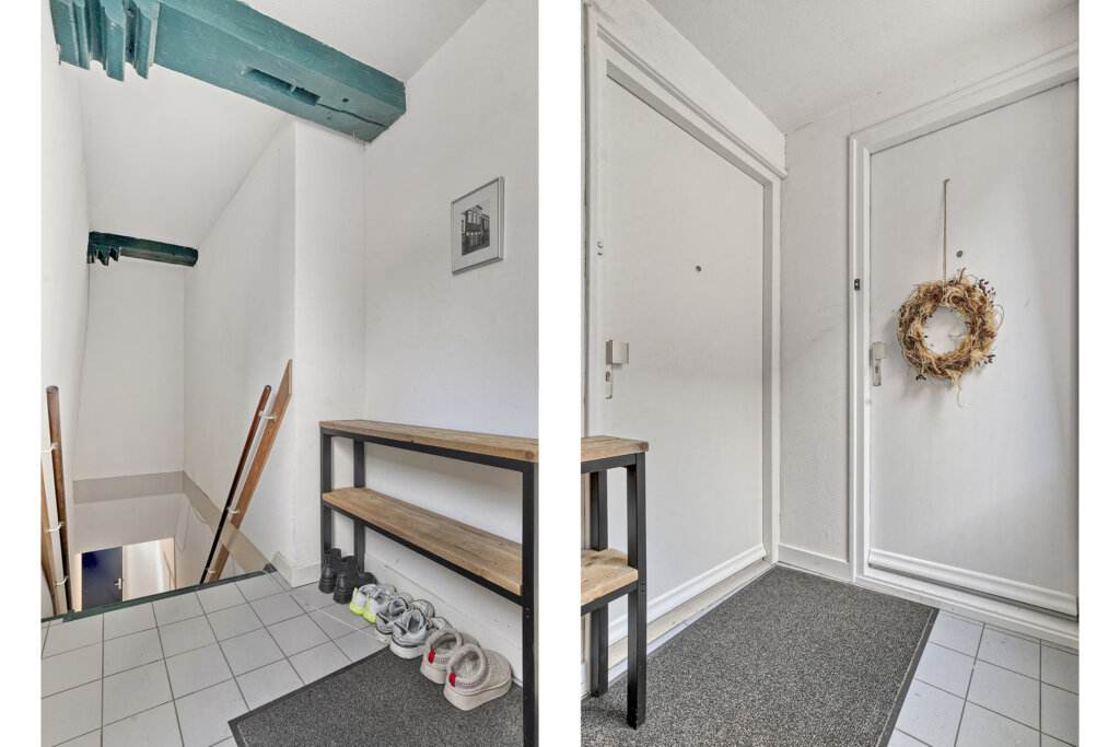 Via de gezamelijke hal betreed je de gang, waar zich de meterkast en de trapopgang naar het appartement op de eerste verdieping bevinden.